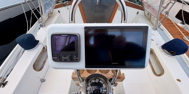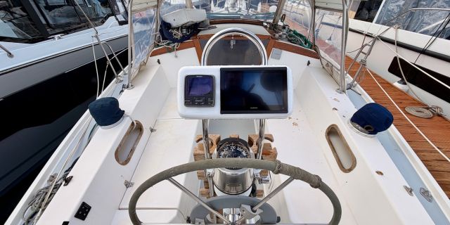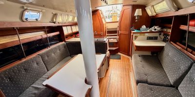 This vessel is well-equipped for sailing and cruising, featuring an asymmetrical spinnaker, battened and fully battened mainsails, furling mainsail and genoa, genoa, gennaker/cruising spinnaker, spinnaker, storm jib, and trisail. Rigging includes a spinnaker pole and steering wheel. Electronics package includes AIS, autopilot, depthsounder, GPS, navigation center, radar, radio, and wind speed and direction. Inside, the boat is equipped with a chemical head, electric bilge pump, heating, hot water, and a refrigerator. Outside, cockpit cushions provide added comfort.