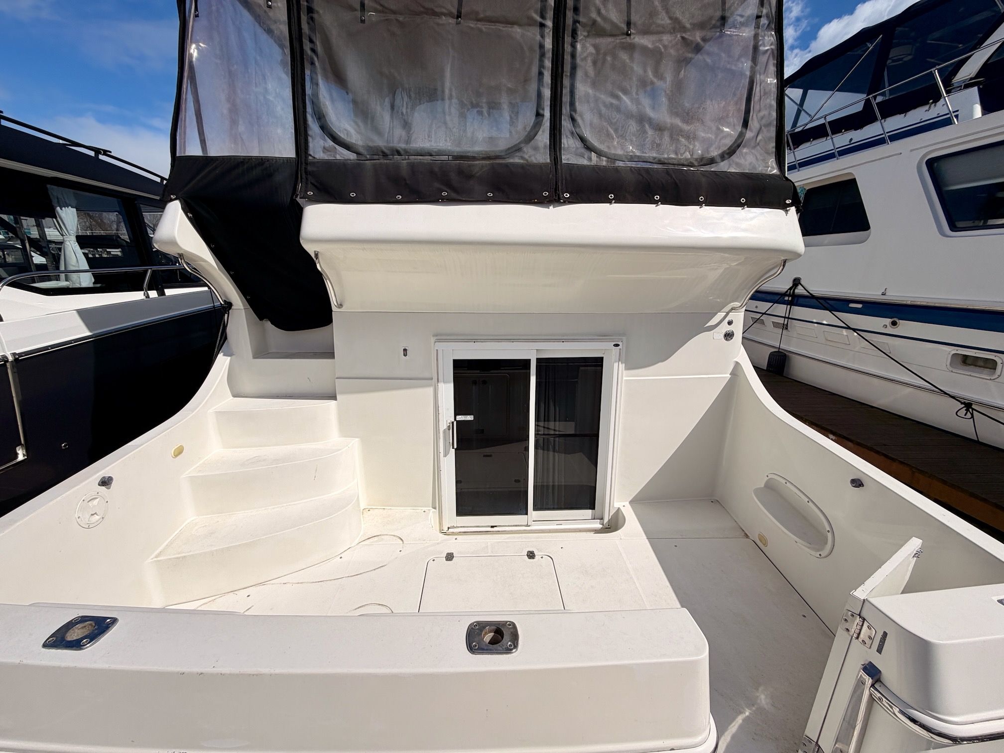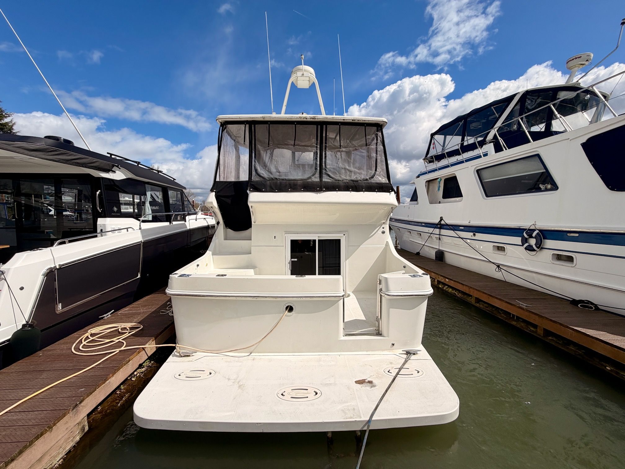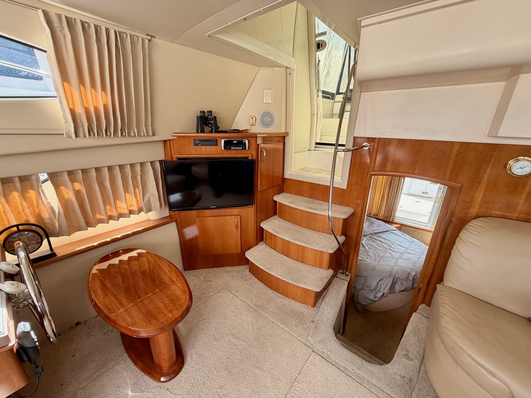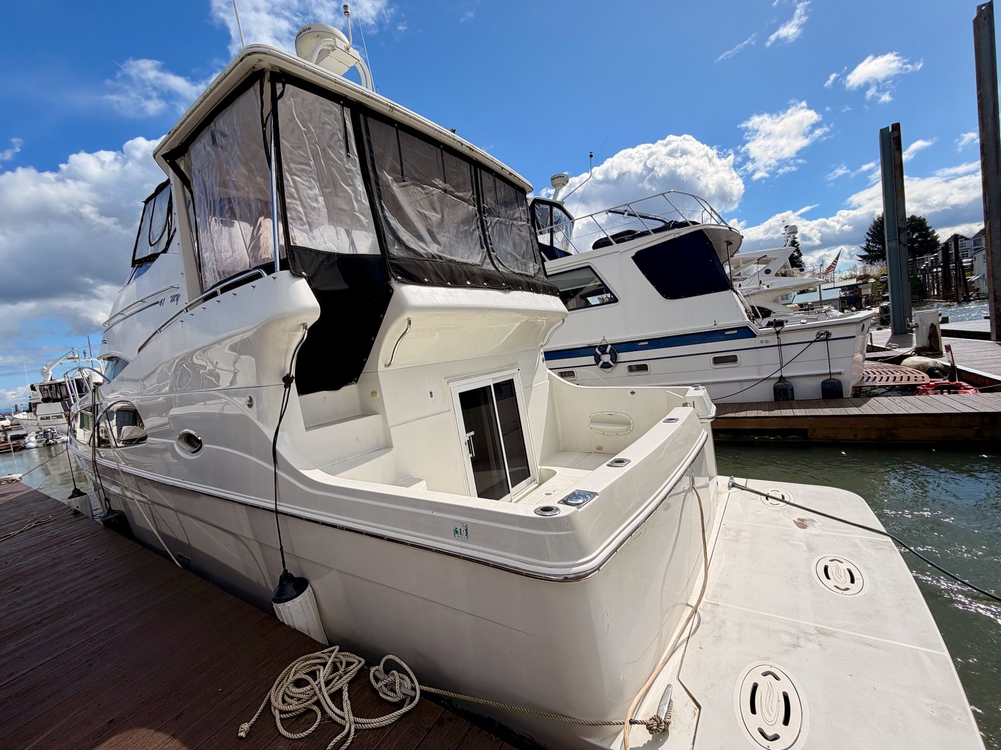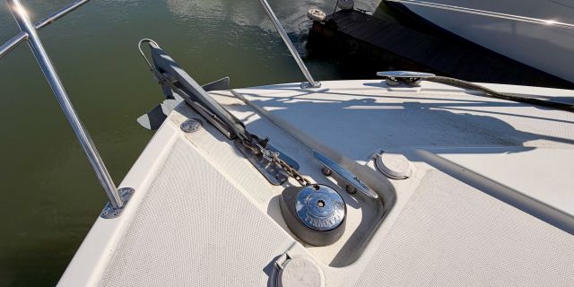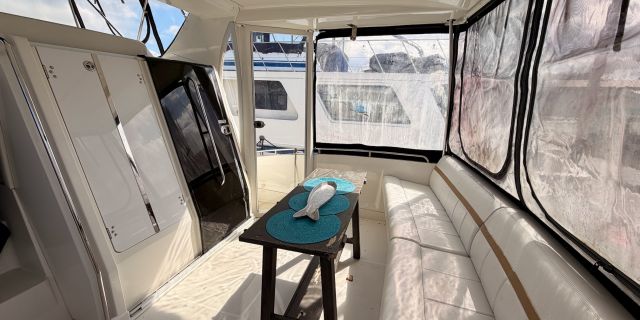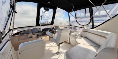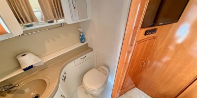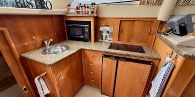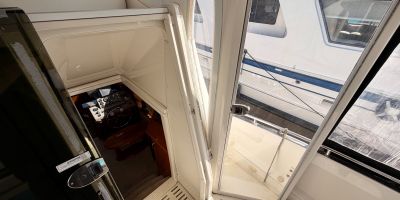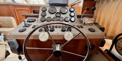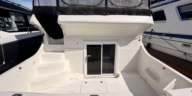 The interior features a bright, open full‑beam salon with generous headroom, large windows, and warm cherry cabinetry throughout. The forward galley is thoughtfully arranged with solid‑surface countertops, ample storage, and full‑size appliances, making it well suited for extended stays aboard. The layout includes two private staterooms, each with its own en‑suite head and separate shower, providing comfort and privacy for owners and guests alike. The master stateroom offers private access to the cockpit, a feature rarely found in this size class. Outdoor living is equally impressive—the expansive cockpit and aft deck are ideal for entertaining, with easy access to the swim platform and water. The flybridge provides excellent visibility, comfortable seating, and a commanding helm, perfect for relaxed cruising or socializing underway.