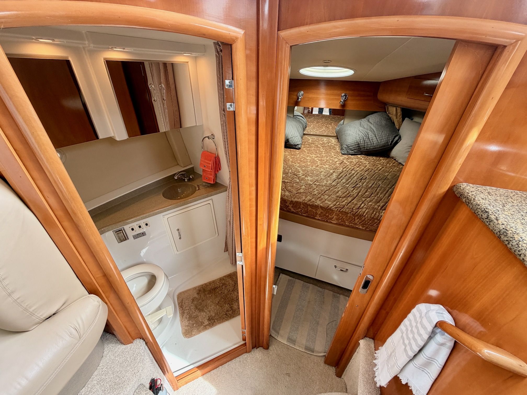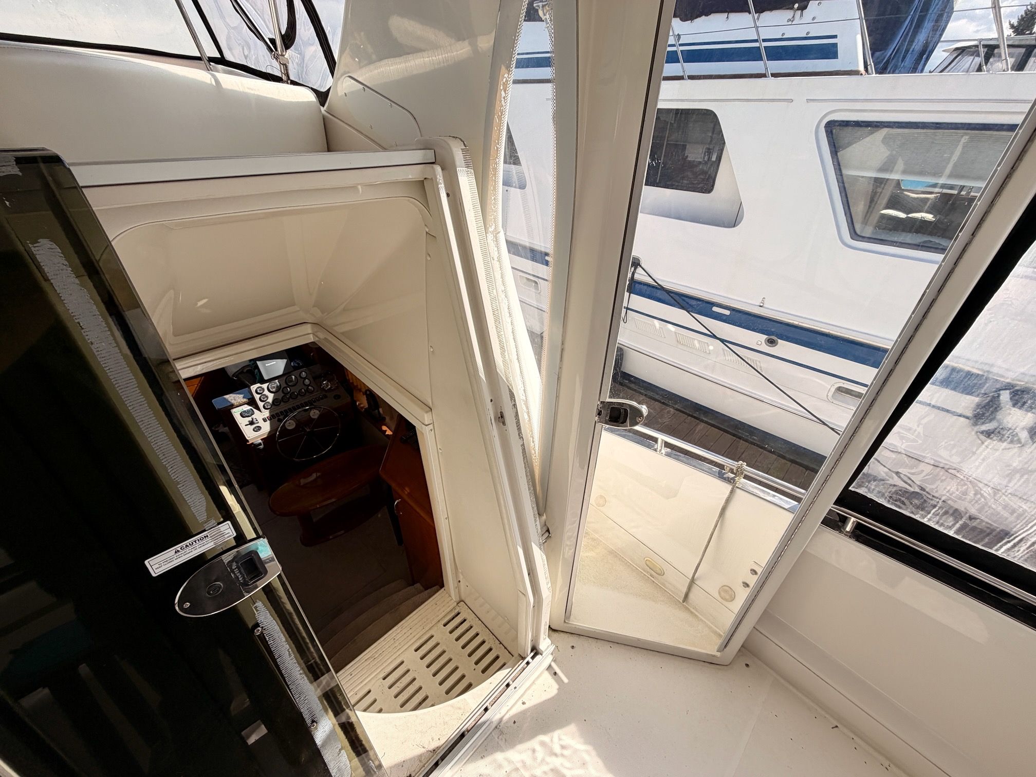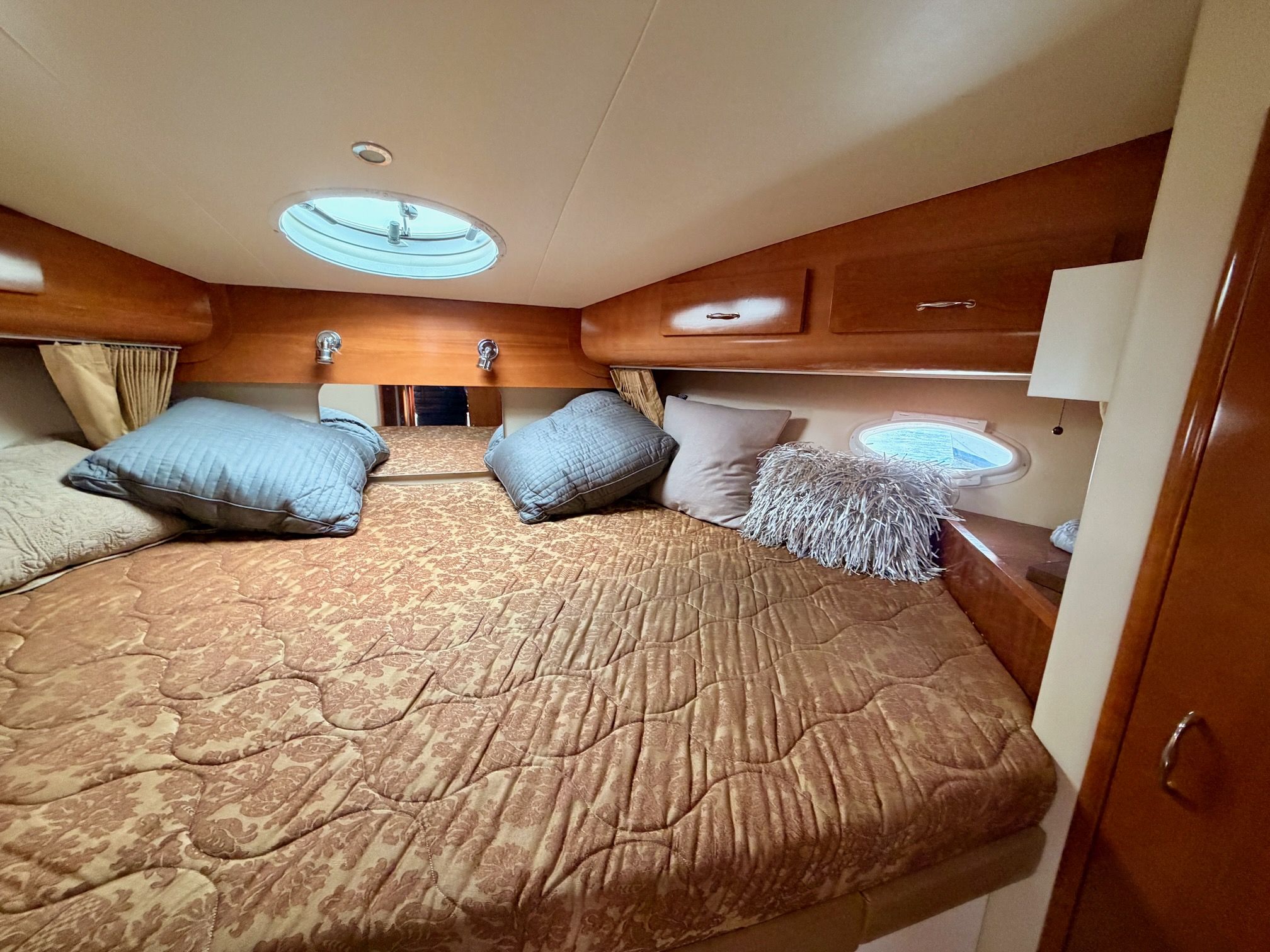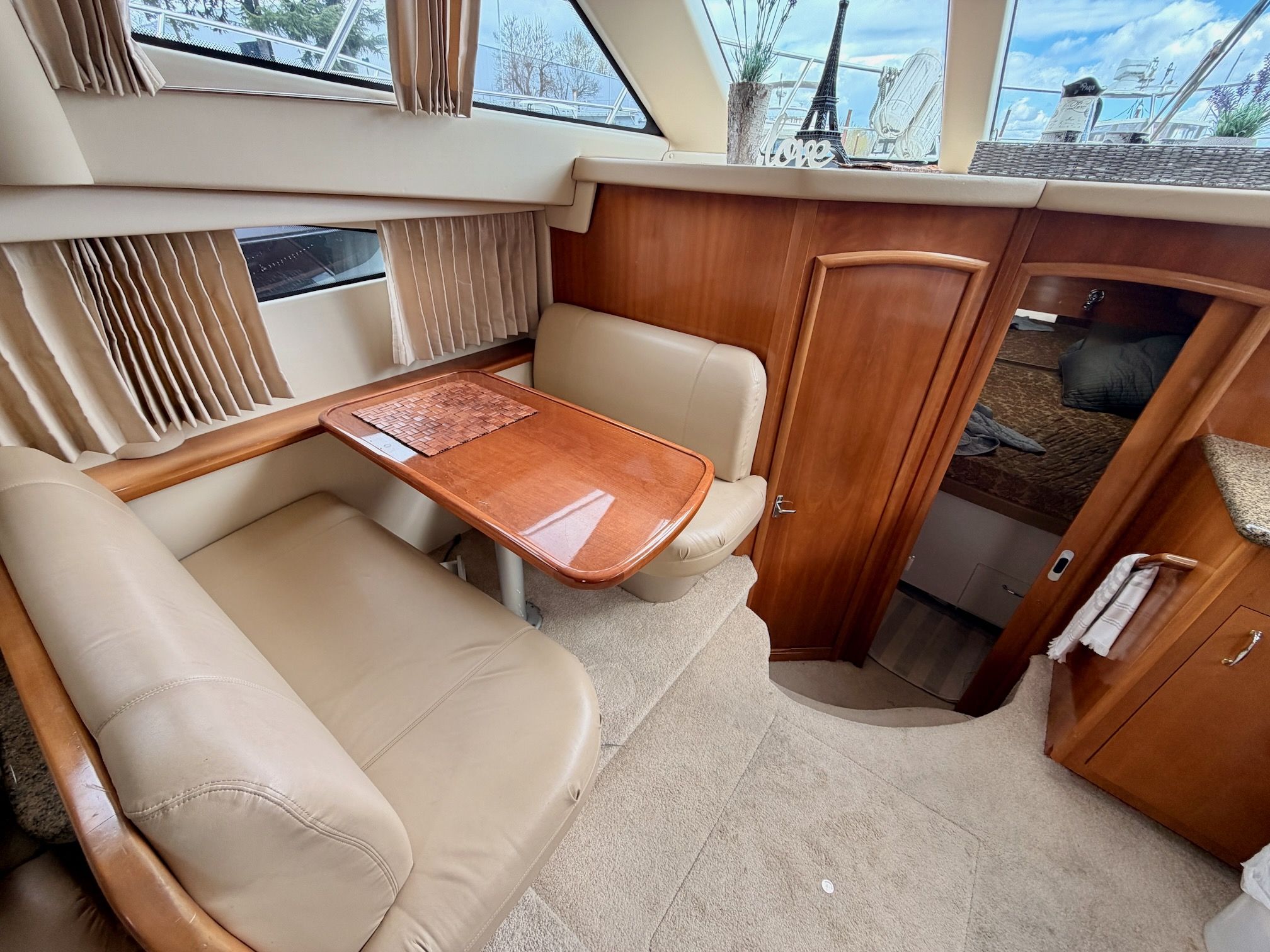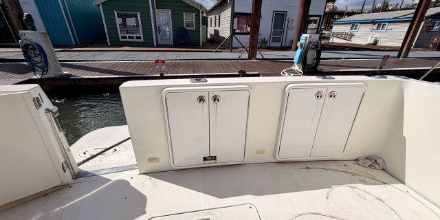 The interior features a bright, open full‑beam salon with generous headroom, large windows, and warm cherry cabinetry throughout. The forward galley is thoughtfully arranged with solid‑surface countertops, ample storage, and full‑size appliances, making it well suited for extended stays aboard. The layout includes two private staterooms, each with its own en‑suite head and separate shower, providing comfort and privacy for owners and guests alike. The master stateroom offers private access to the cockpit, a feature rarely found in this size class. Outdoor living is equally impressive—the expansive cockpit and aft deck are ideal for entertaining, with easy access to the swim platform and water. The flybridge provides excellent visibility, comfortable seating, and a commanding helm, perfect for relaxed cruising or socializing underway.