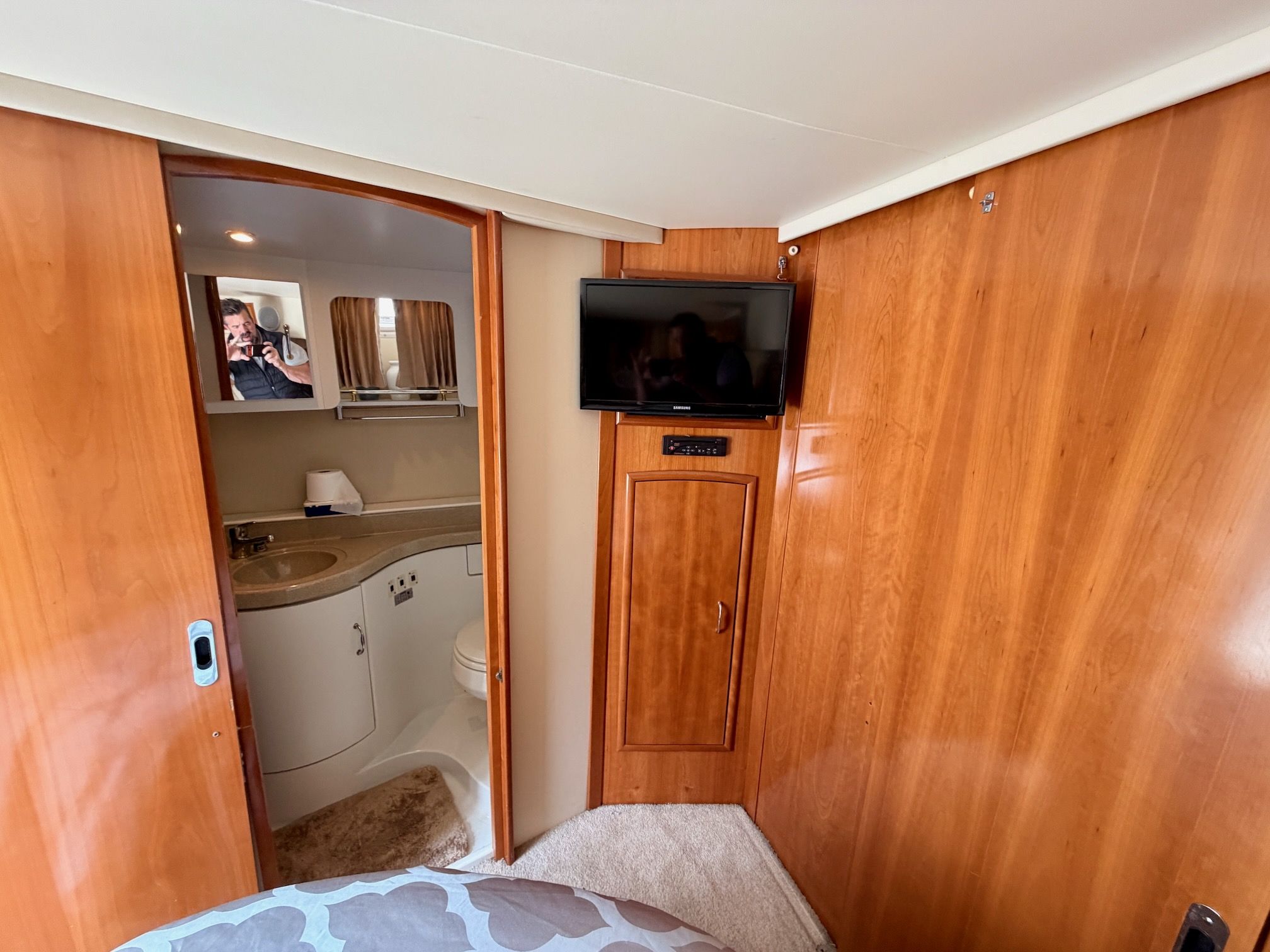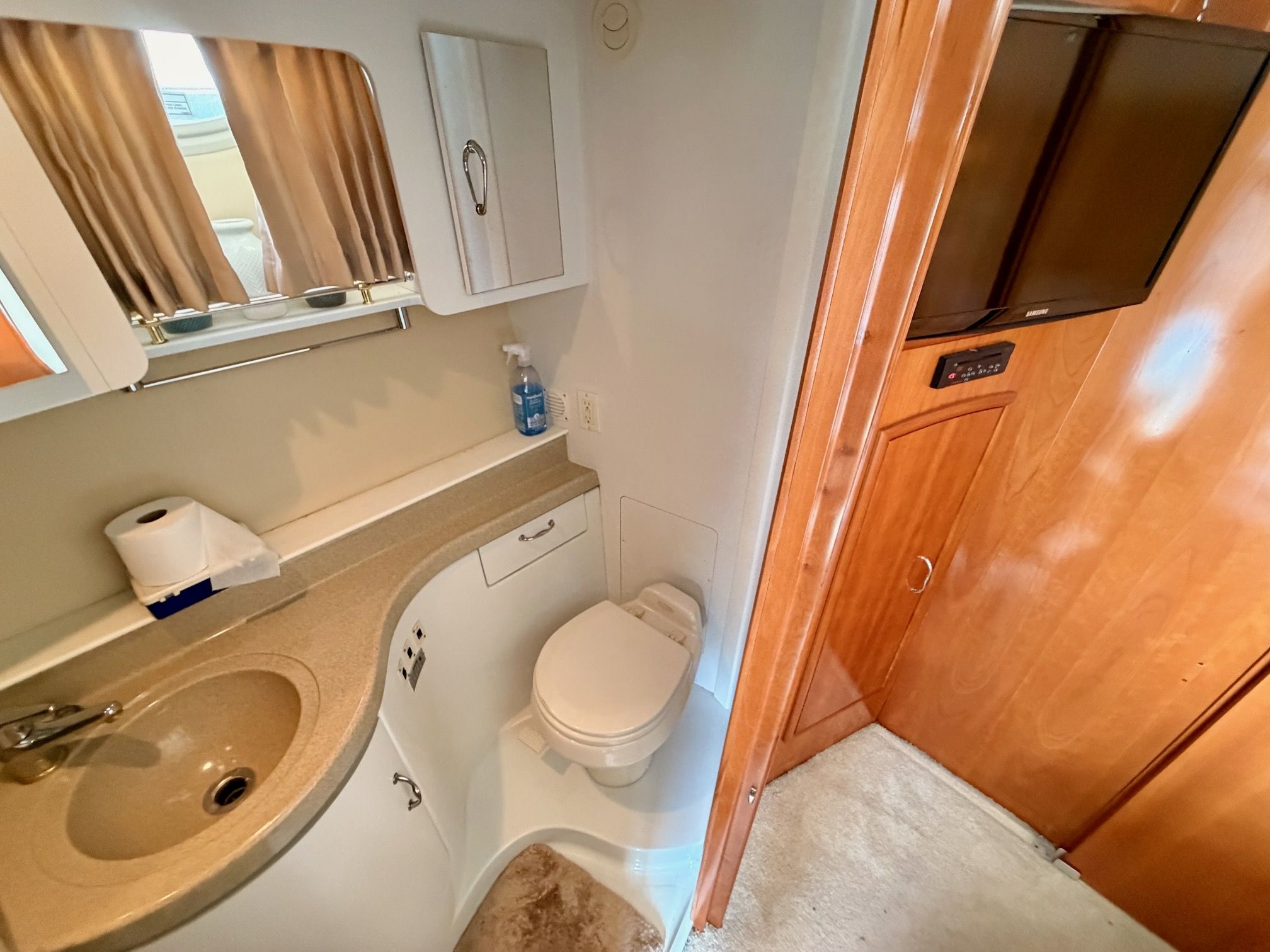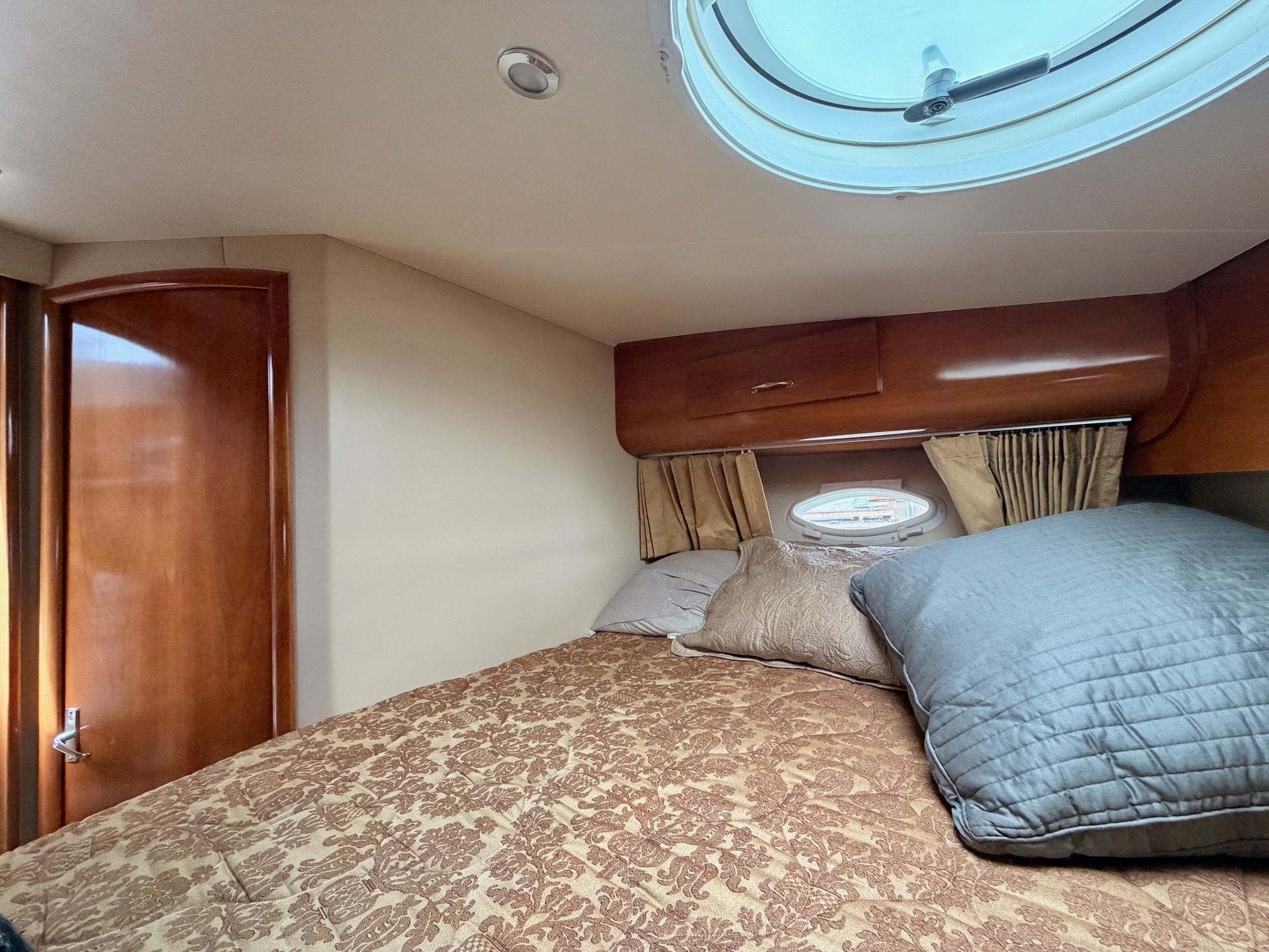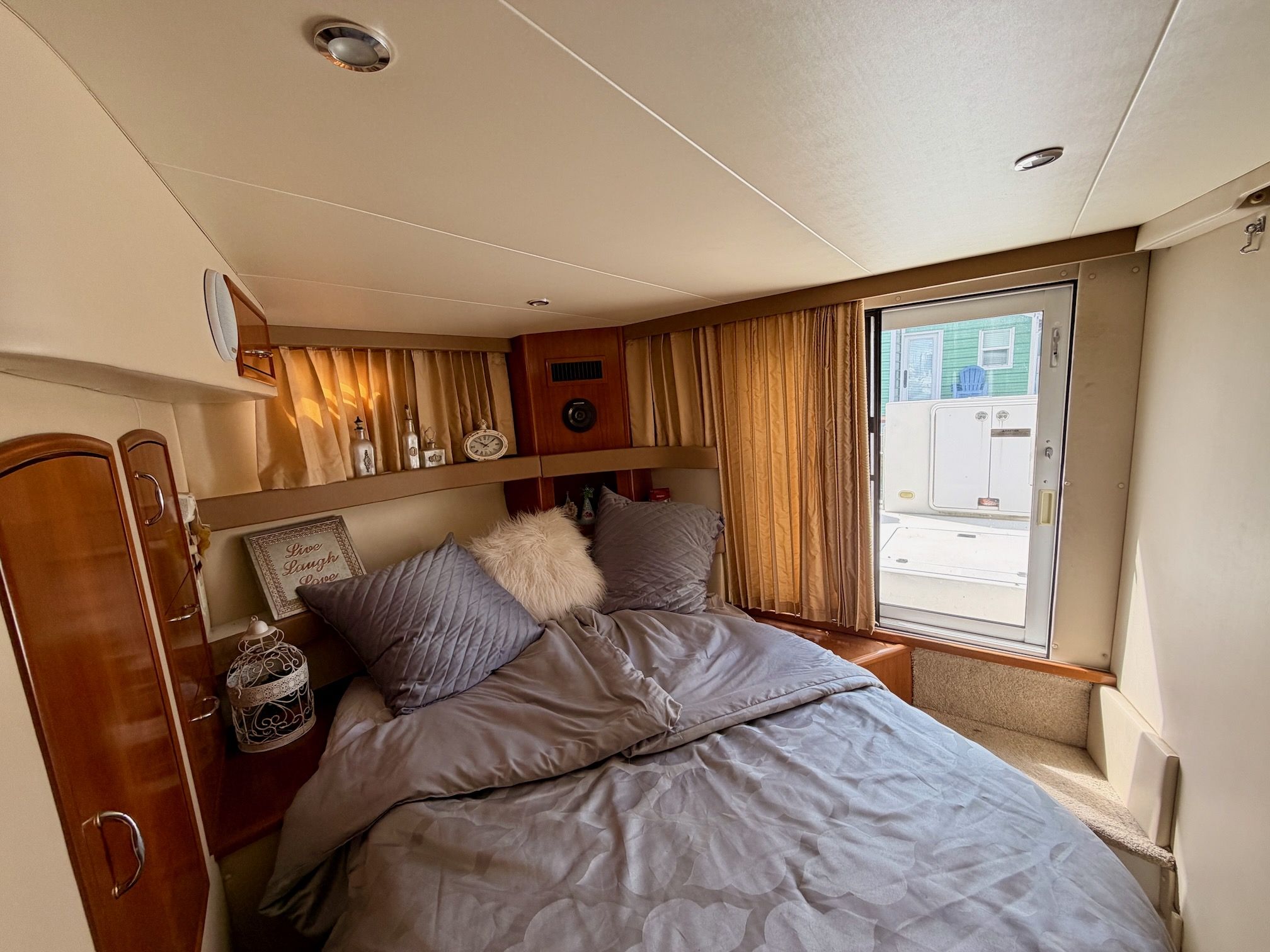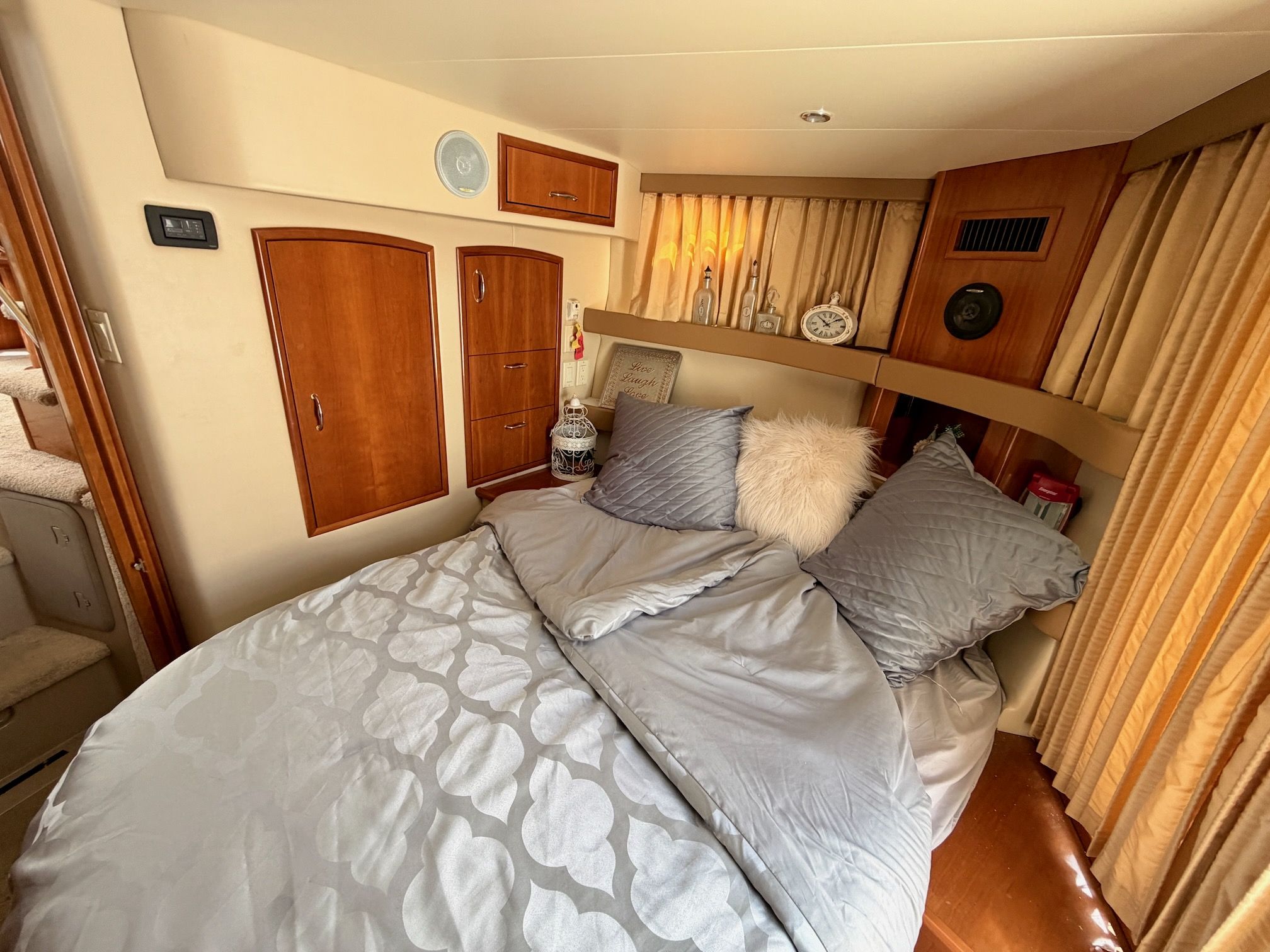 The interior features a bright, open full‑beam salon with generous headroom, large windows, and warm cherry cabinetry throughout. The forward galley is thoughtfully arranged with solid‑surface countertops, ample storage, and full‑size appliances, making it well suited for extended stays aboard. The layout includes two private staterooms, each with its own en‑suite head and separate shower, providing comfort and privacy for owners and guests alike. The master stateroom offers private access to the cockpit, a feature rarely found in this size class. Outdoor living is equally impressive—the expansive cockpit and aft deck are ideal for entertaining, with easy access to the swim platform and water. The flybridge provides excellent visibility, comfortable seating, and a commanding helm, perfect for relaxed cruising or socializing underway.