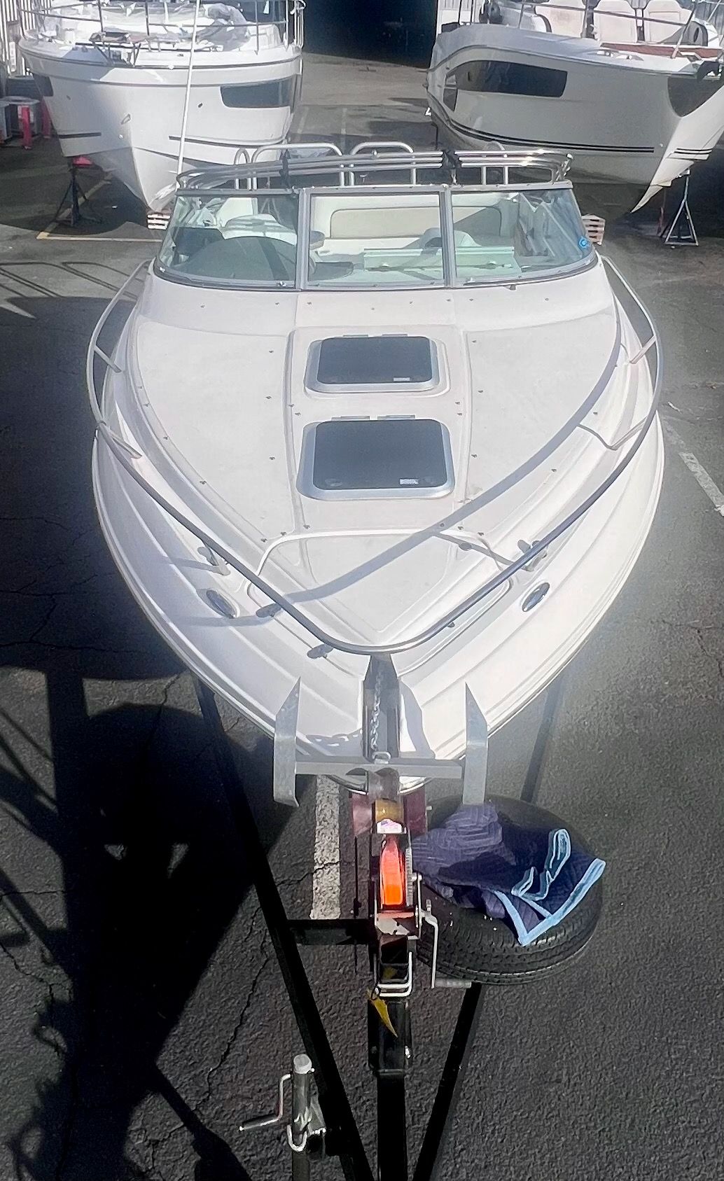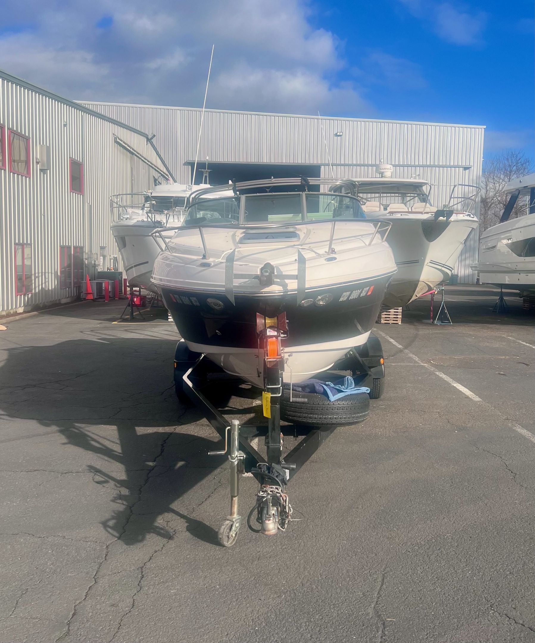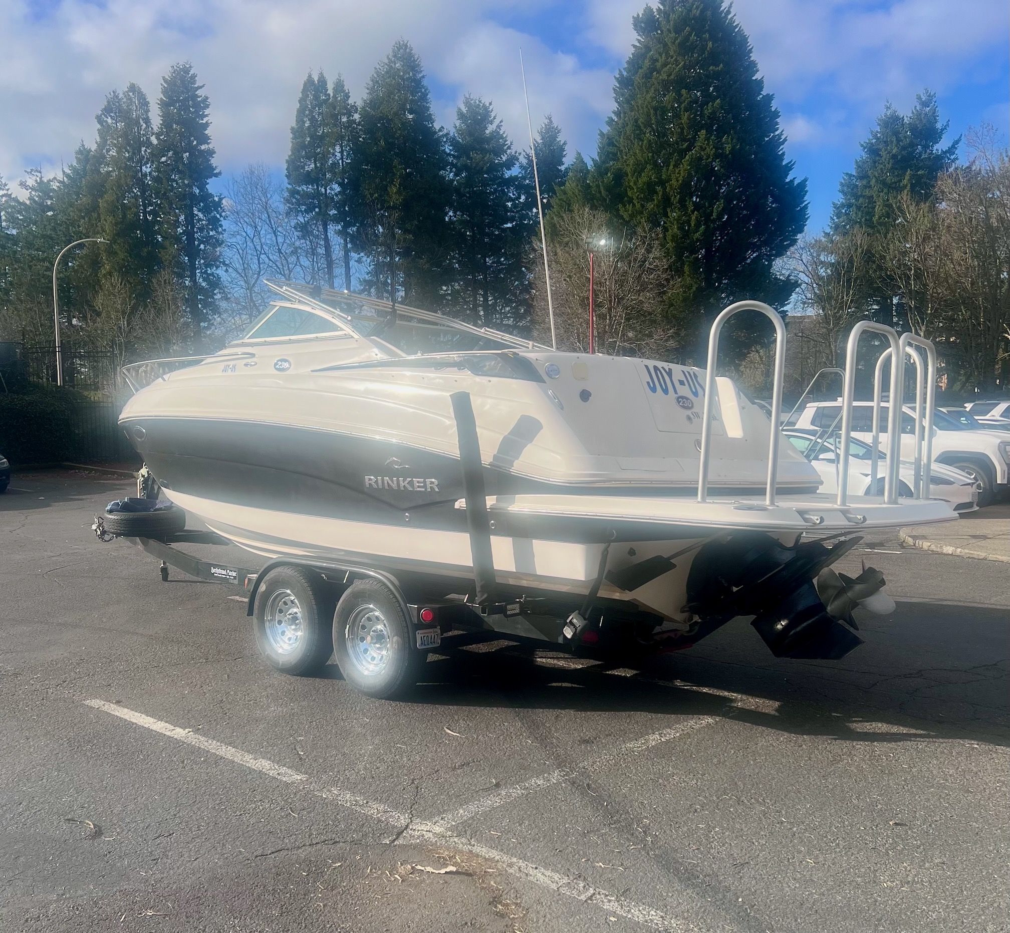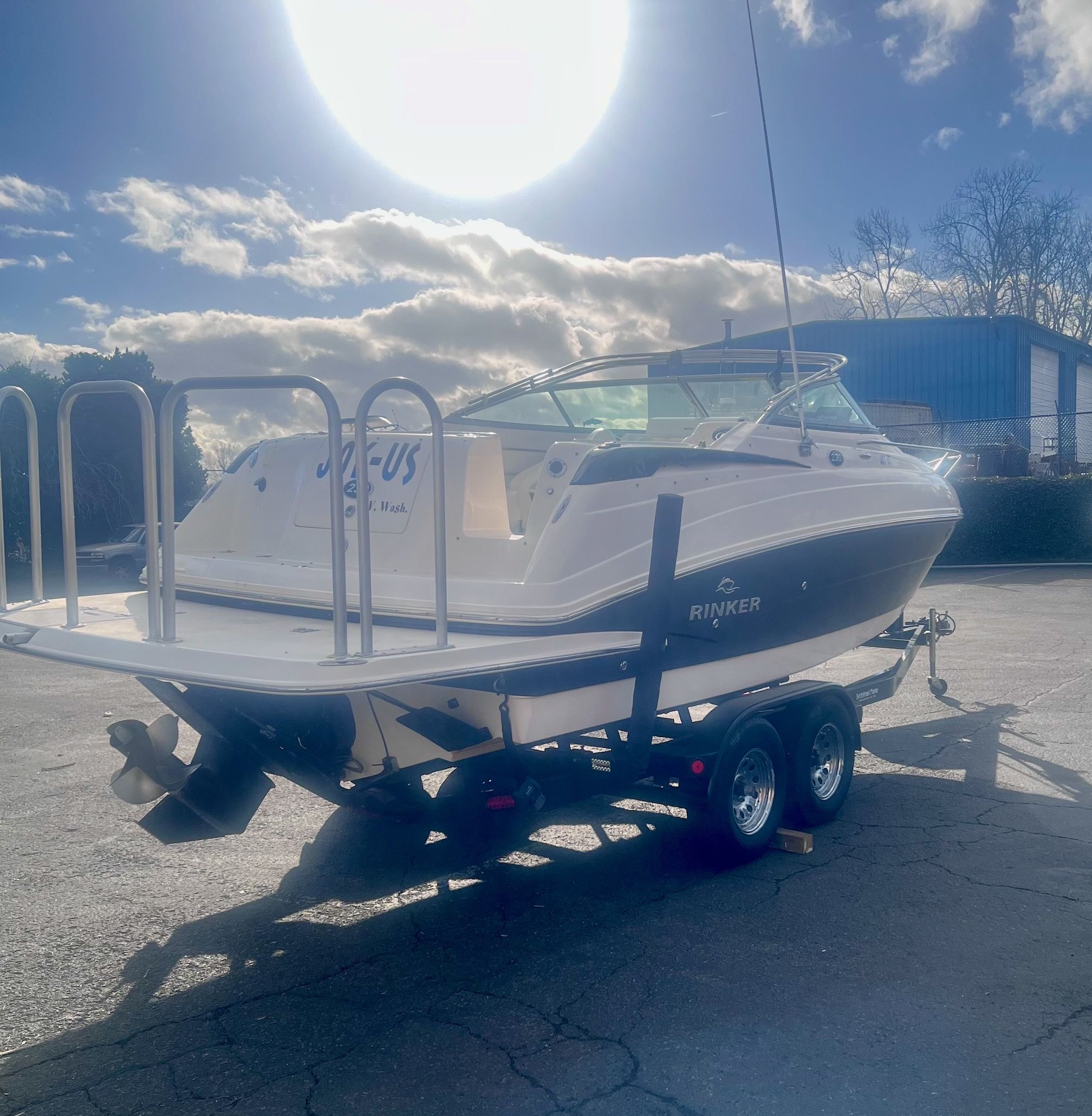 -Dual axle bunk style trailer with LED marker lights, back up lights, electric brakes and boat 2 trailer automatic bow loop catching system.