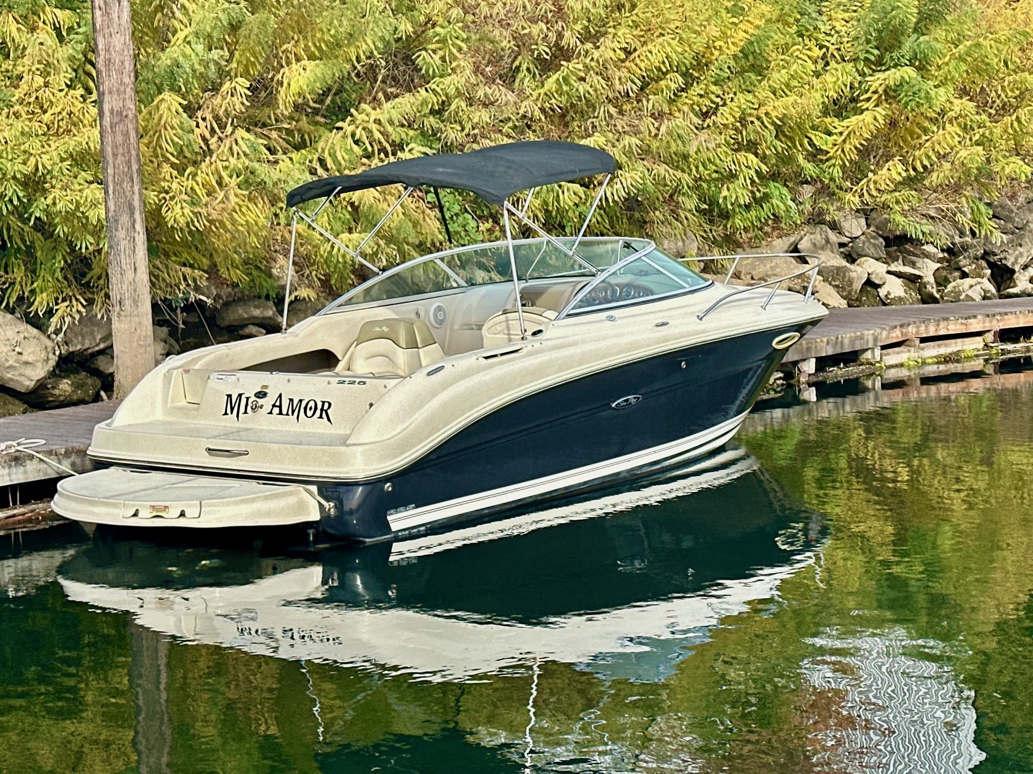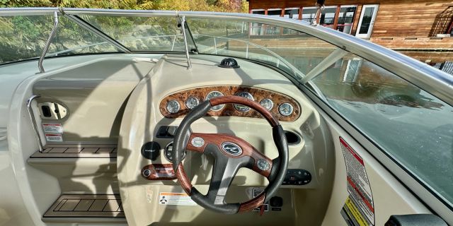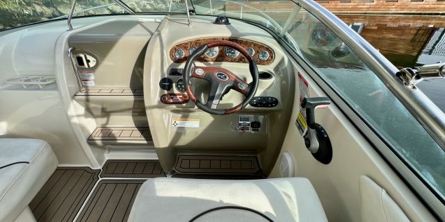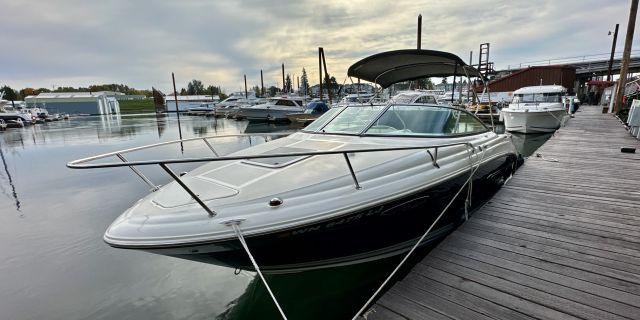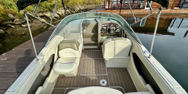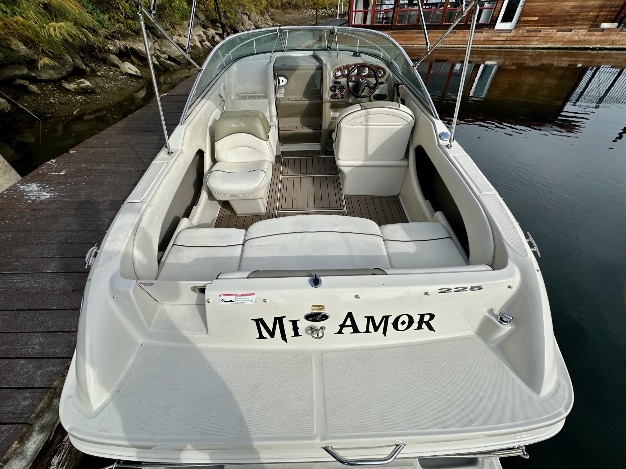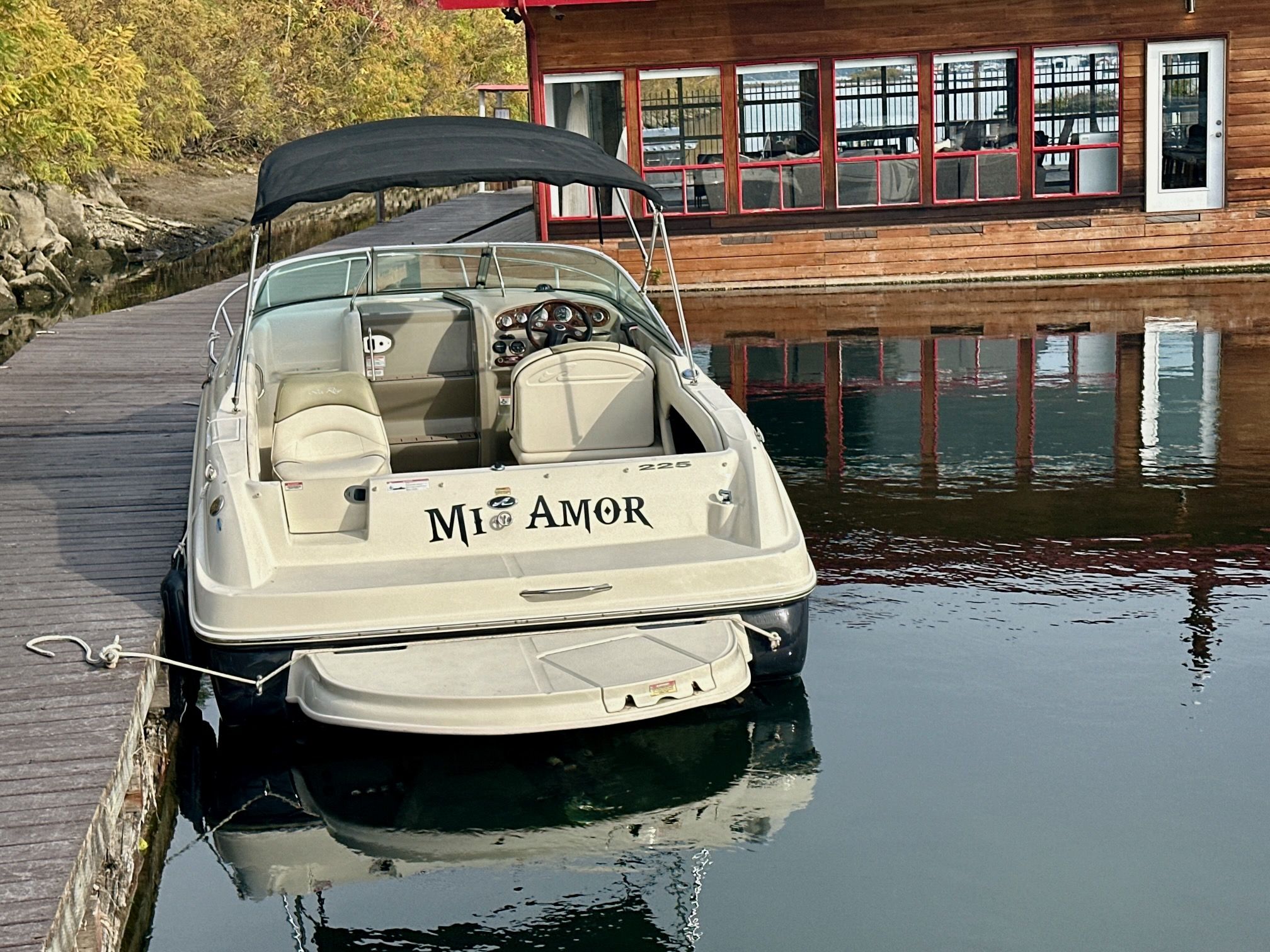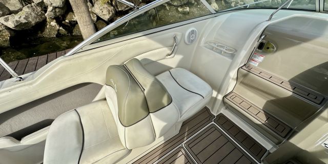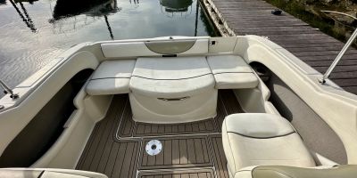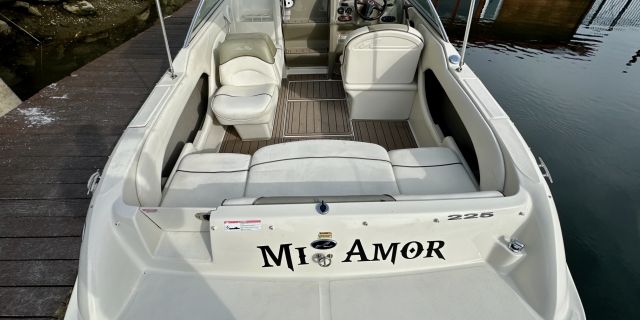 Leave worries behind when you board this luxurious 225 Weekender. The designer cabin features a cozy V-berth that converts to a dinette, enclosed head and galley with sink, faucet and built-in ice chest. Additional features include Sunbrella bimini top, extended swim platform and 12V Clarion AM/FM/CD player w/Sirius Satellite Radio.
