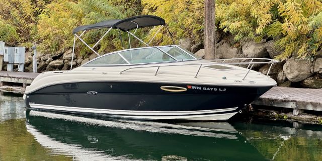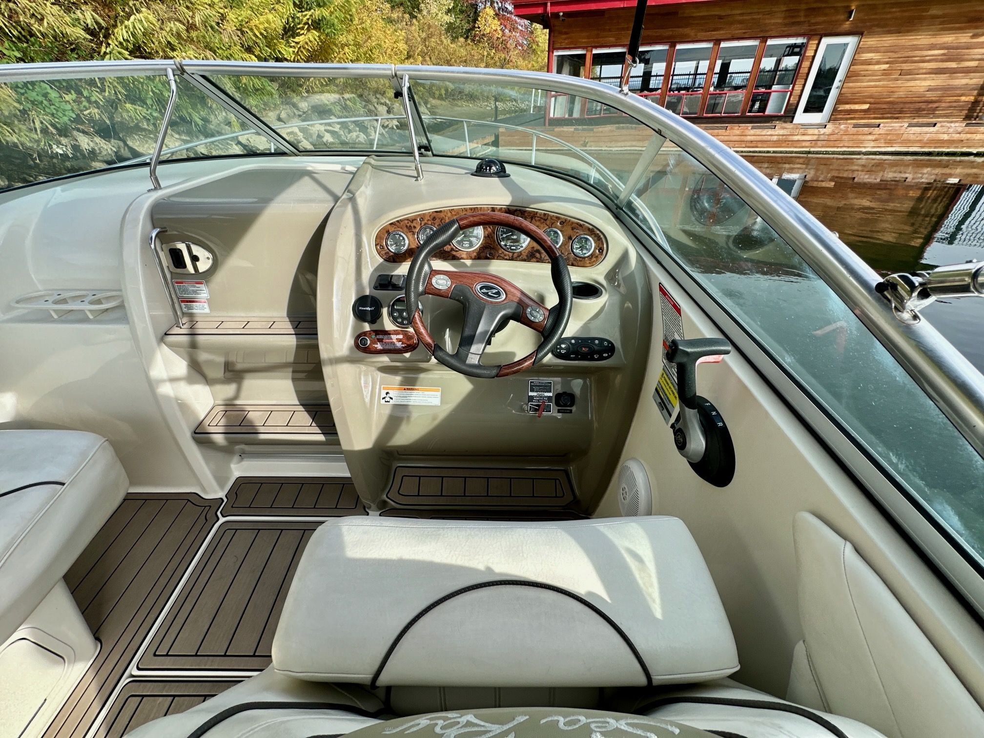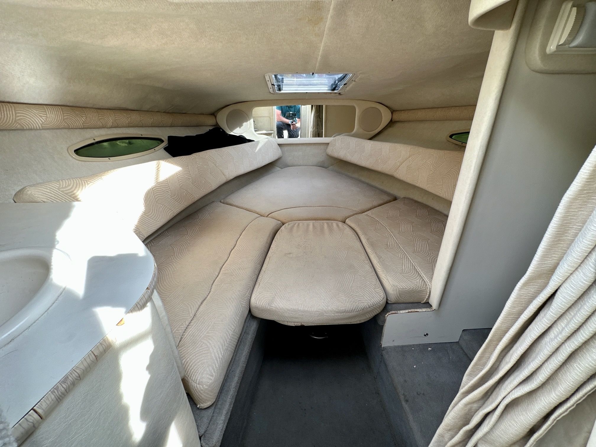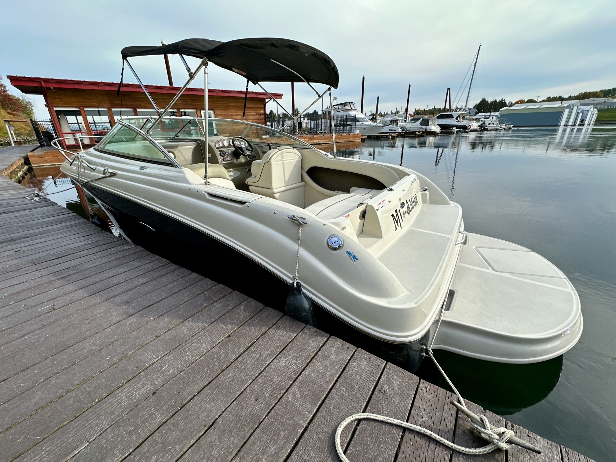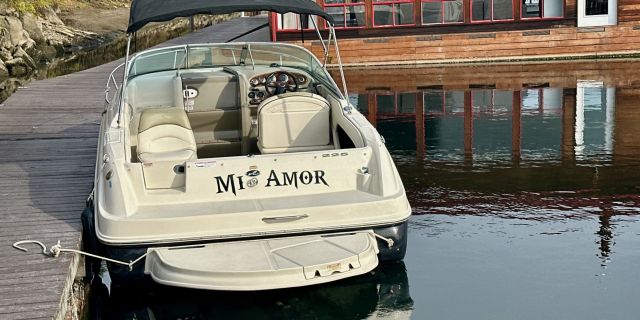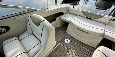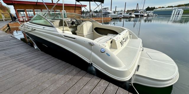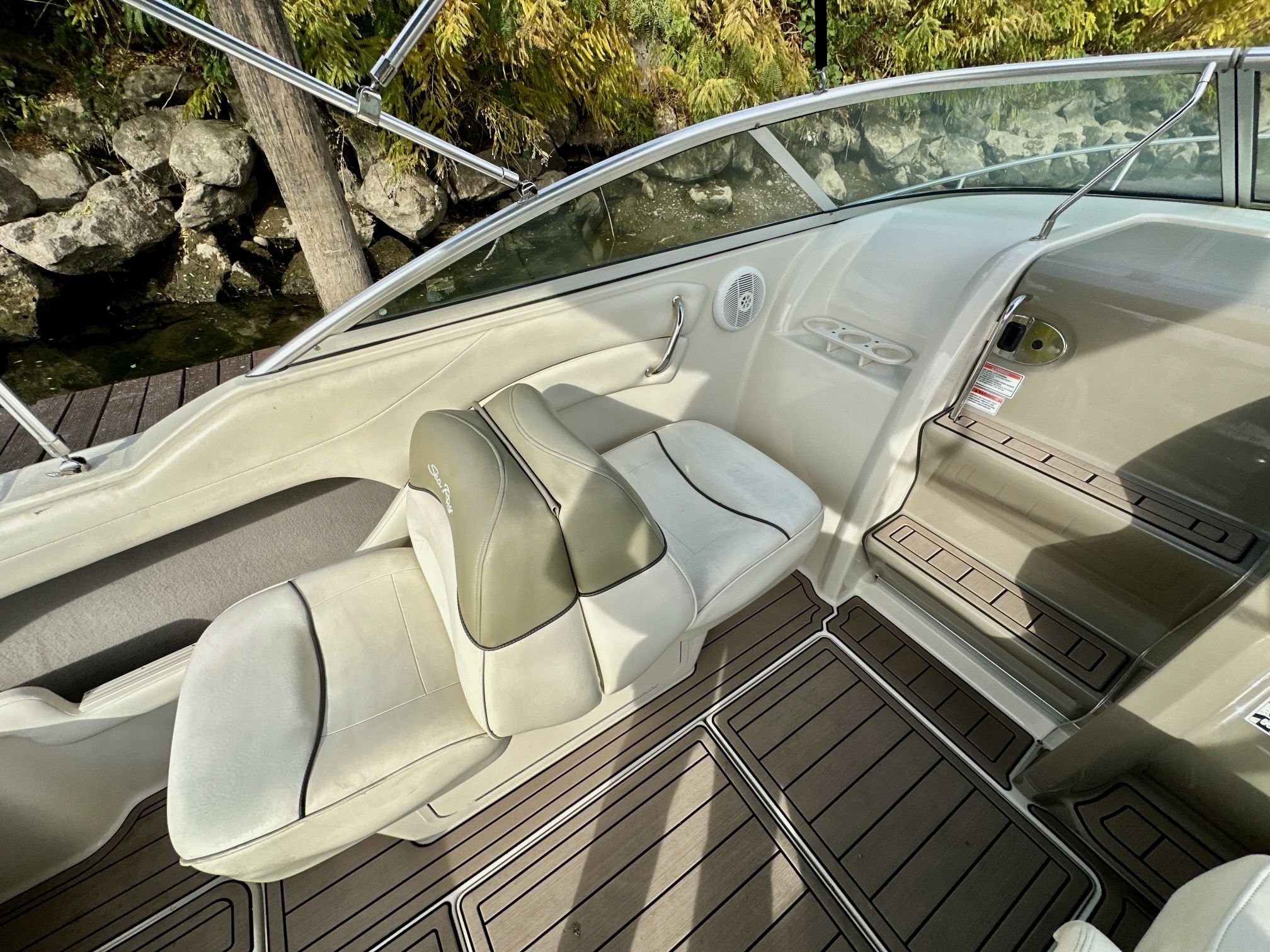 Leave worries behind when you board this luxurious 225 Weekender. The designer cabin features a cozy V-berth that converts to a dinette, enclosed head and galley with sink, faucet and built-in ice chest. Additional features include Sunbrella bimini top, extended swim platform and 12V Clarion AM/FM/CD player w/Sirius Satellite Radio.