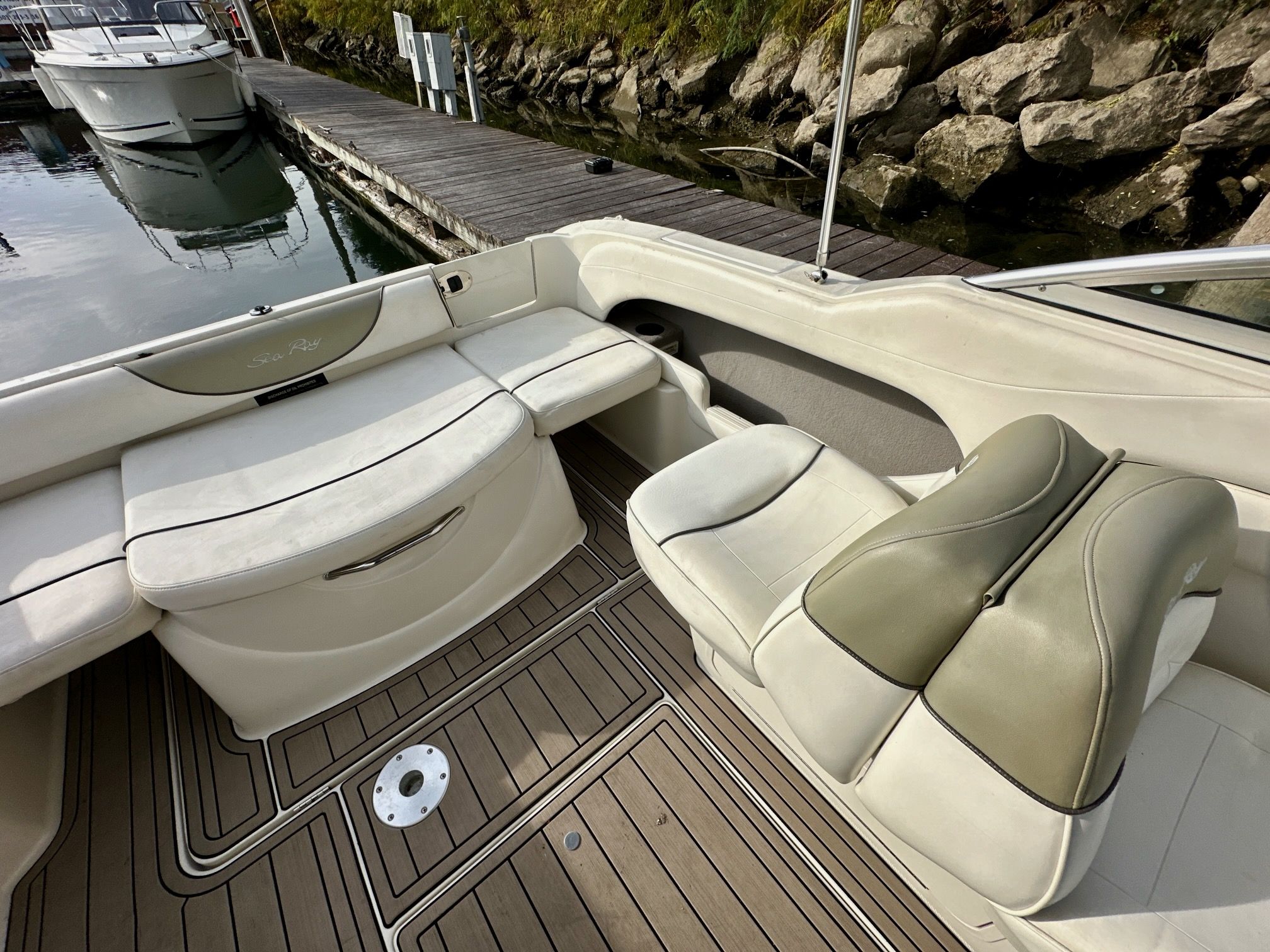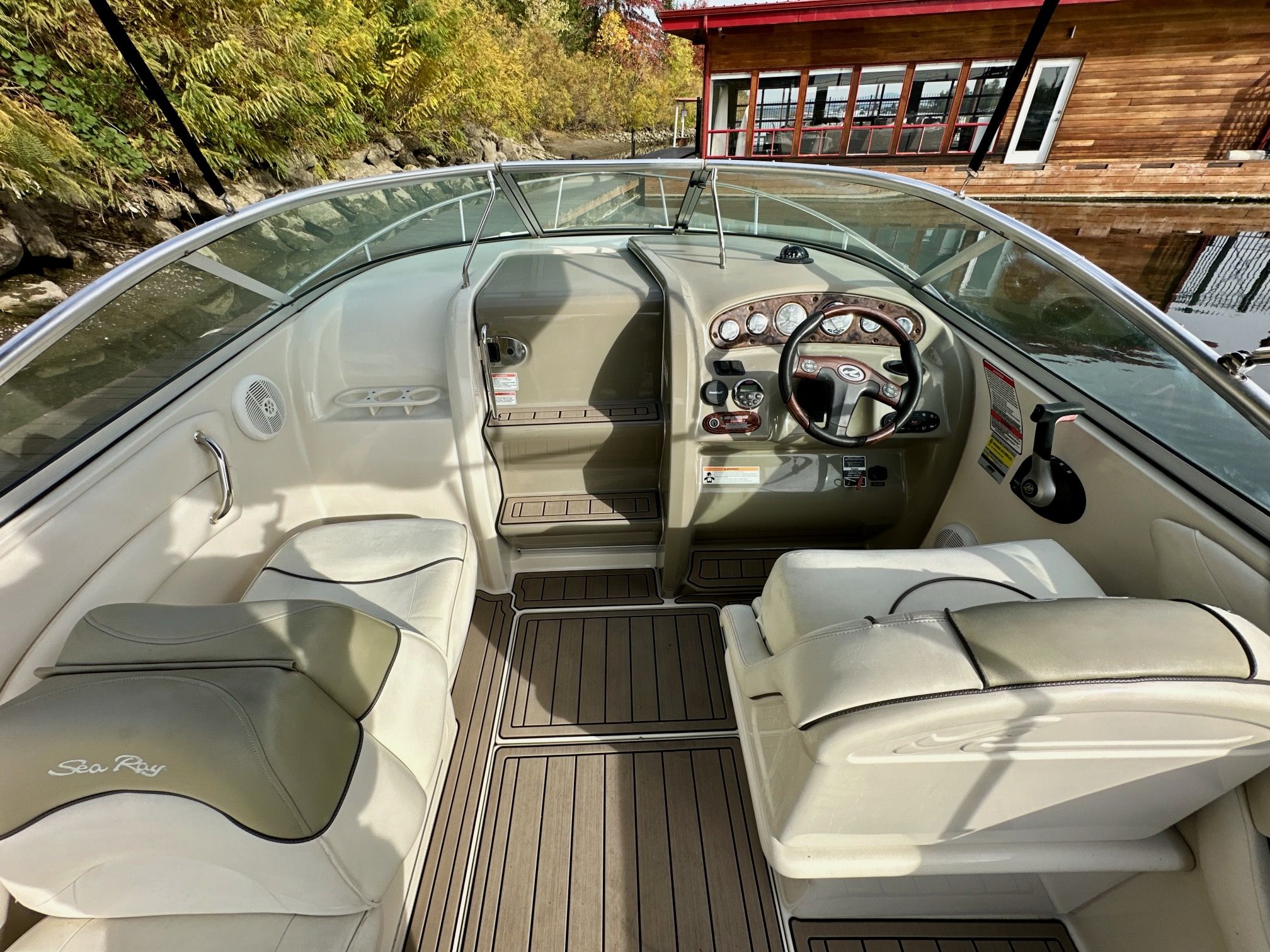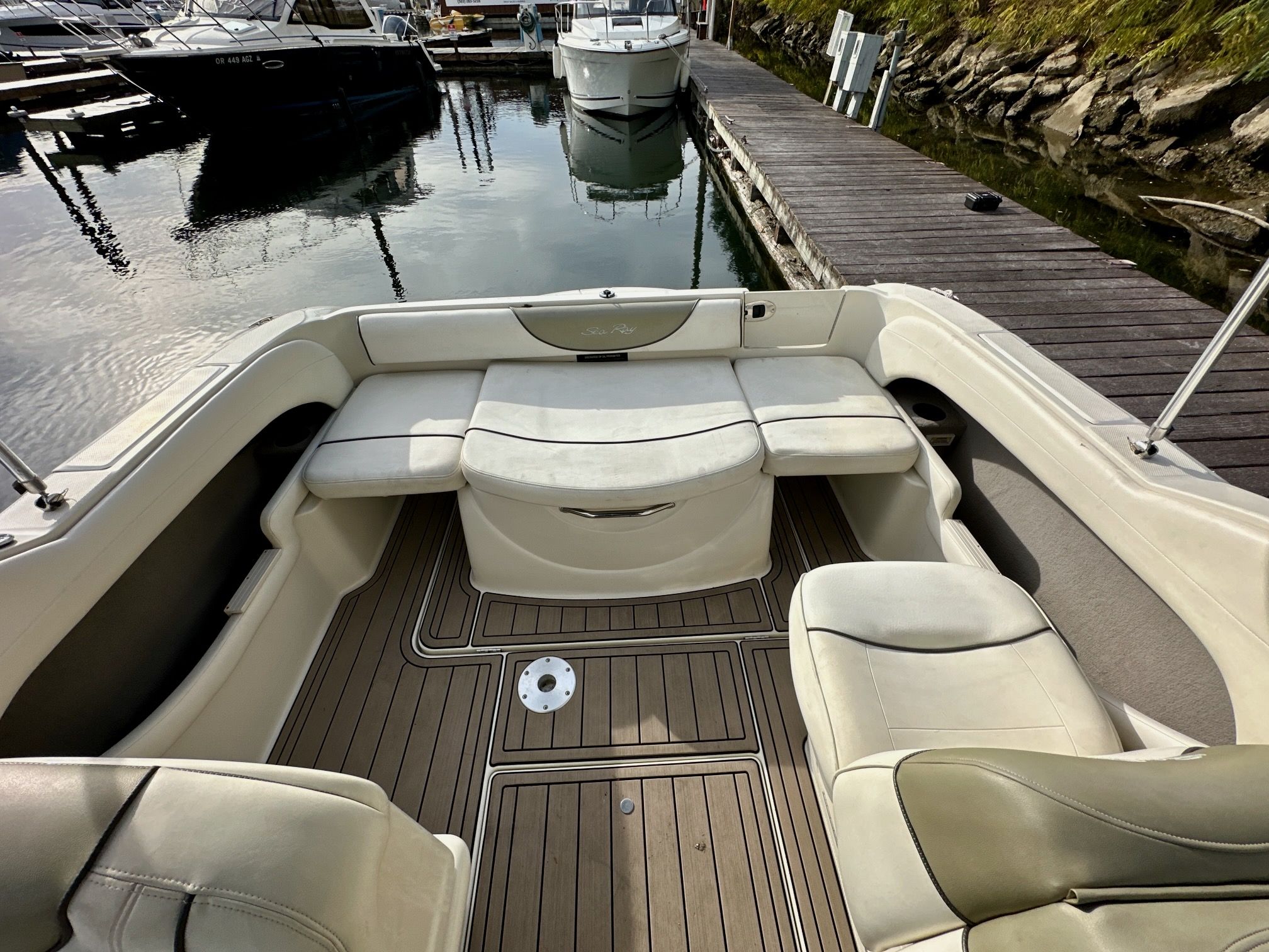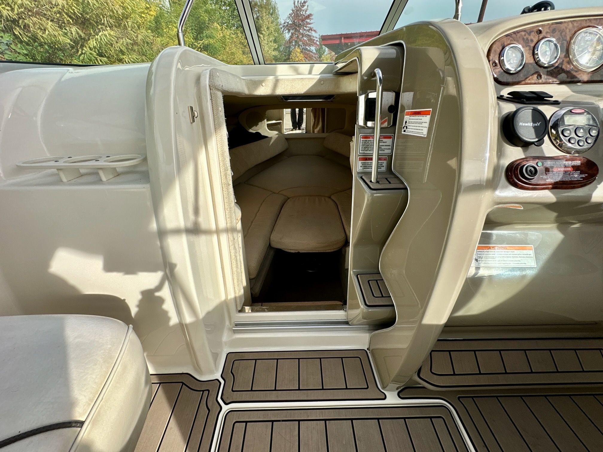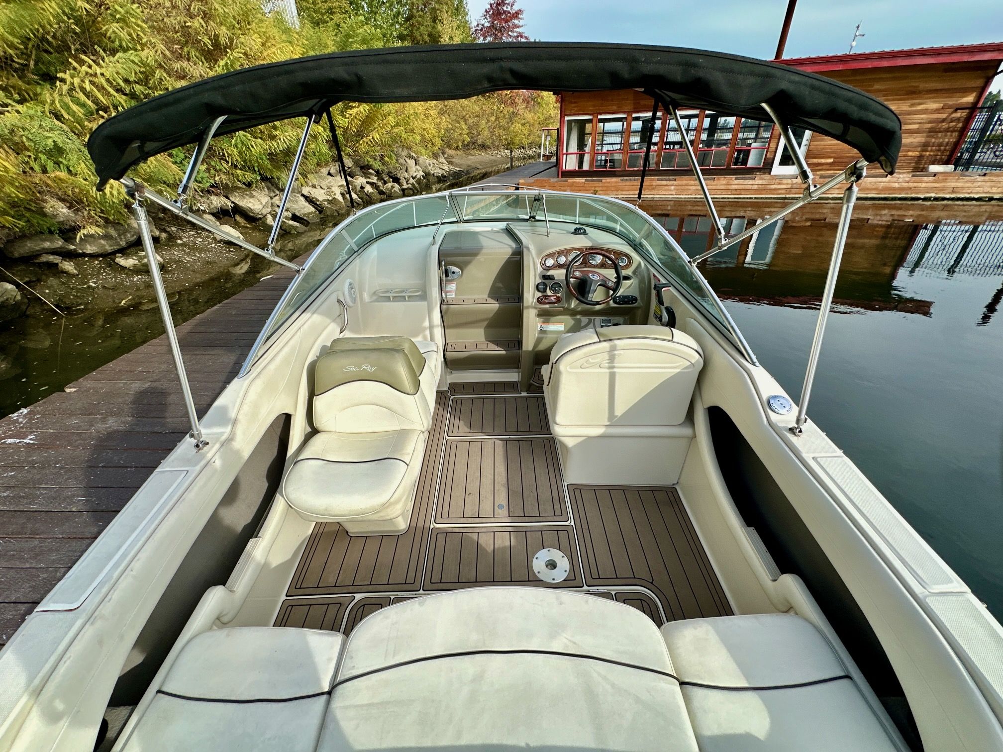 Leave worries behind when you board this luxurious 225 Weekender. The designer cabin features a cozy V-berth that converts to a dinette, enclosed head and galley with sink, faucet and built-in ice chest. Additional features include Sunbrella bimini top, extended swim platform and 12V Clarion AM/FM/CD player w/Sirius Satellite Radio.