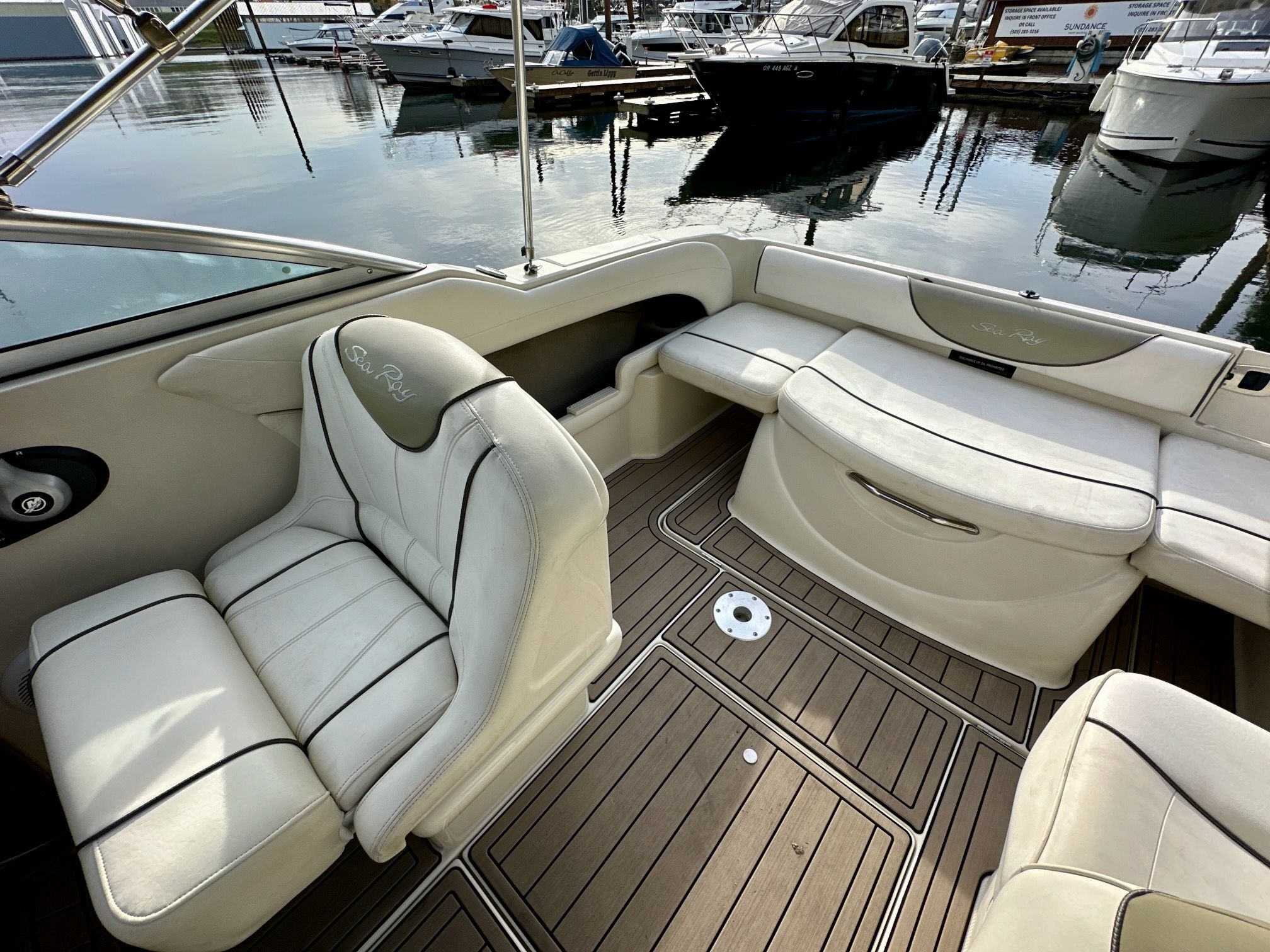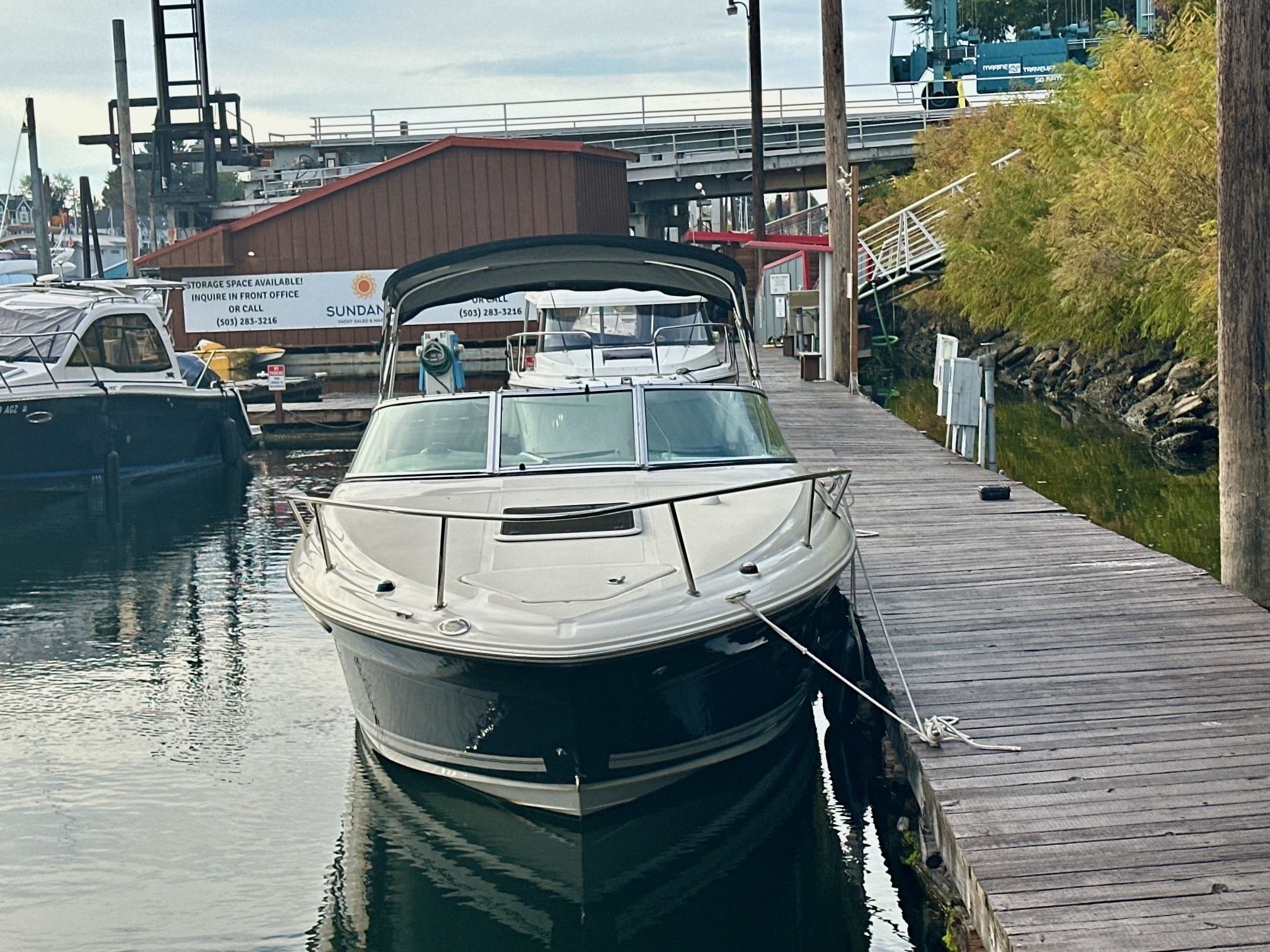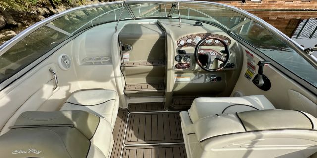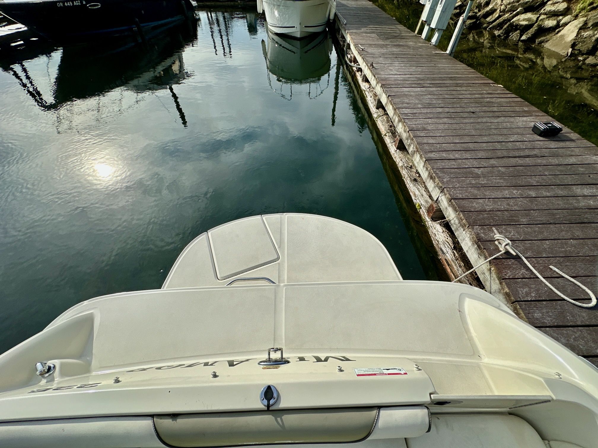 Powered by the reliable 260-hp MerCruiser, the 225 Weekender planes quickly (even with 4–6 adults aboard) and delivers a smooth, dry ride in flat water thanks to its 19-degree deadrise. It slices waves cleanly without excessive spray, and fuel efficiency is decent at ~1–1.5 mpg cruising. In rougher conditions, it can pound a bit due to its size and weight distribution—best for protected waters.