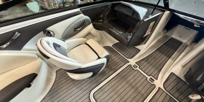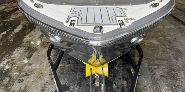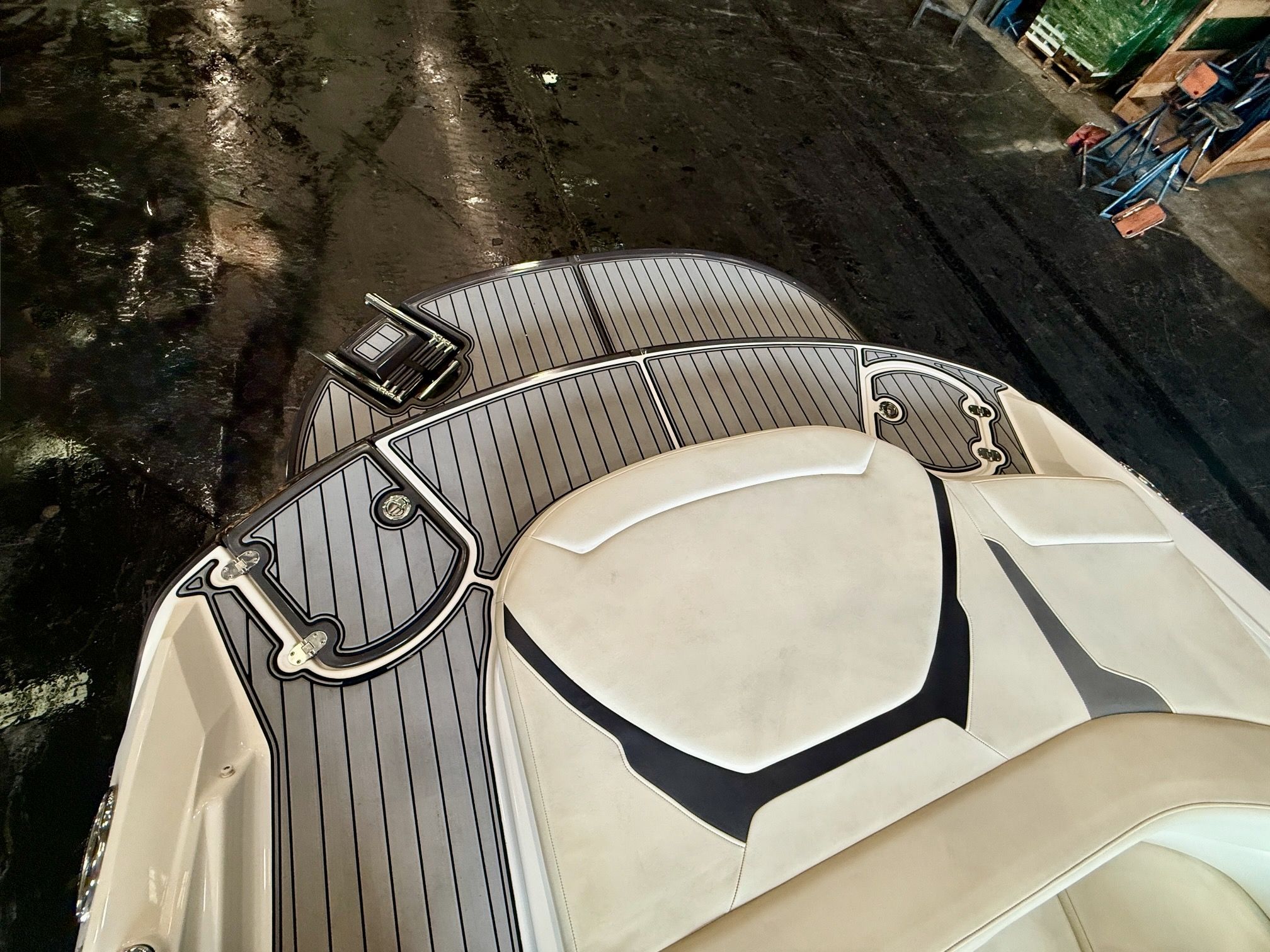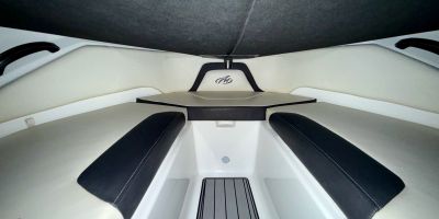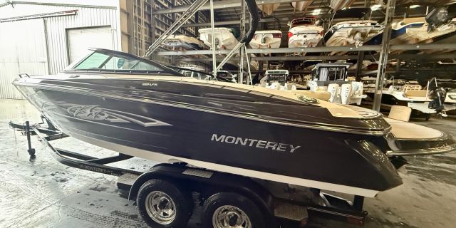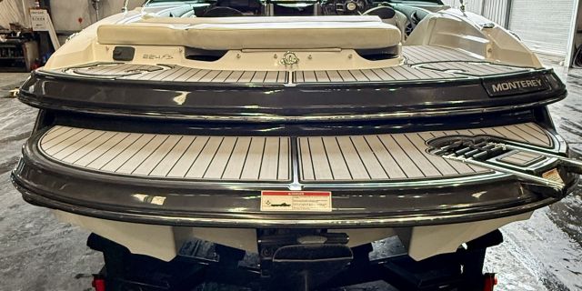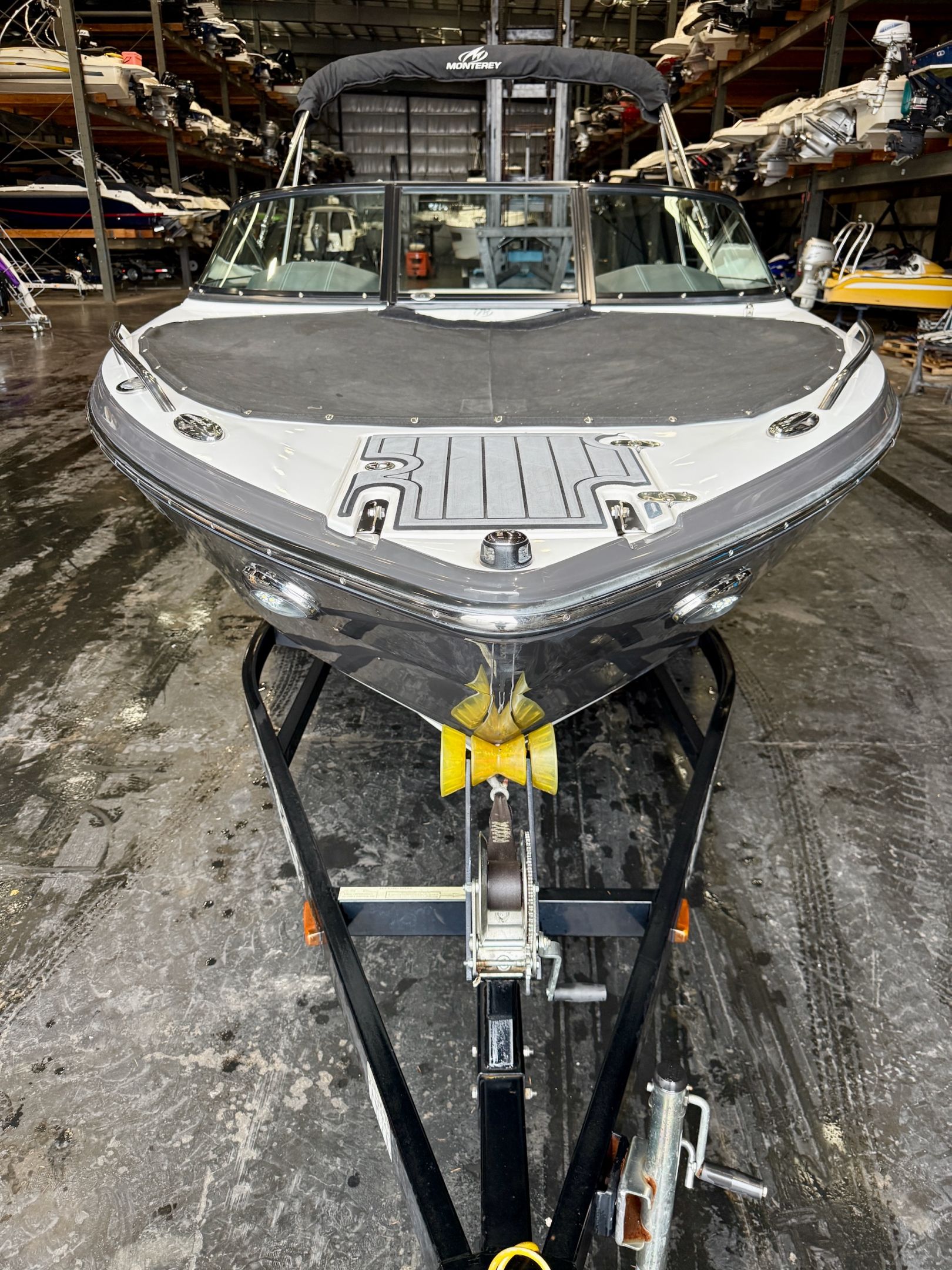 The boat is loaded with Monterey’s signature features, including eye-catching Facet Series styling with a sleek wraparound windshield, an extended swim platform and spacious sun pad that’s perfect for lounging or easy boarding, and roomy bow and cockpit seating for up to 10 people. There is plenty of storage throughout the boat, including under the seats and in the console.