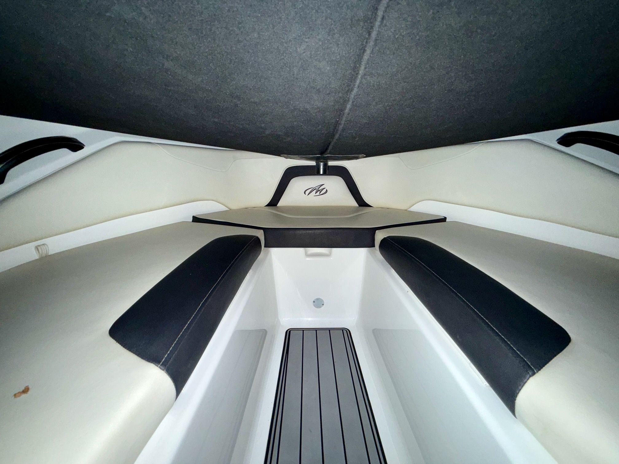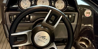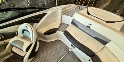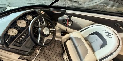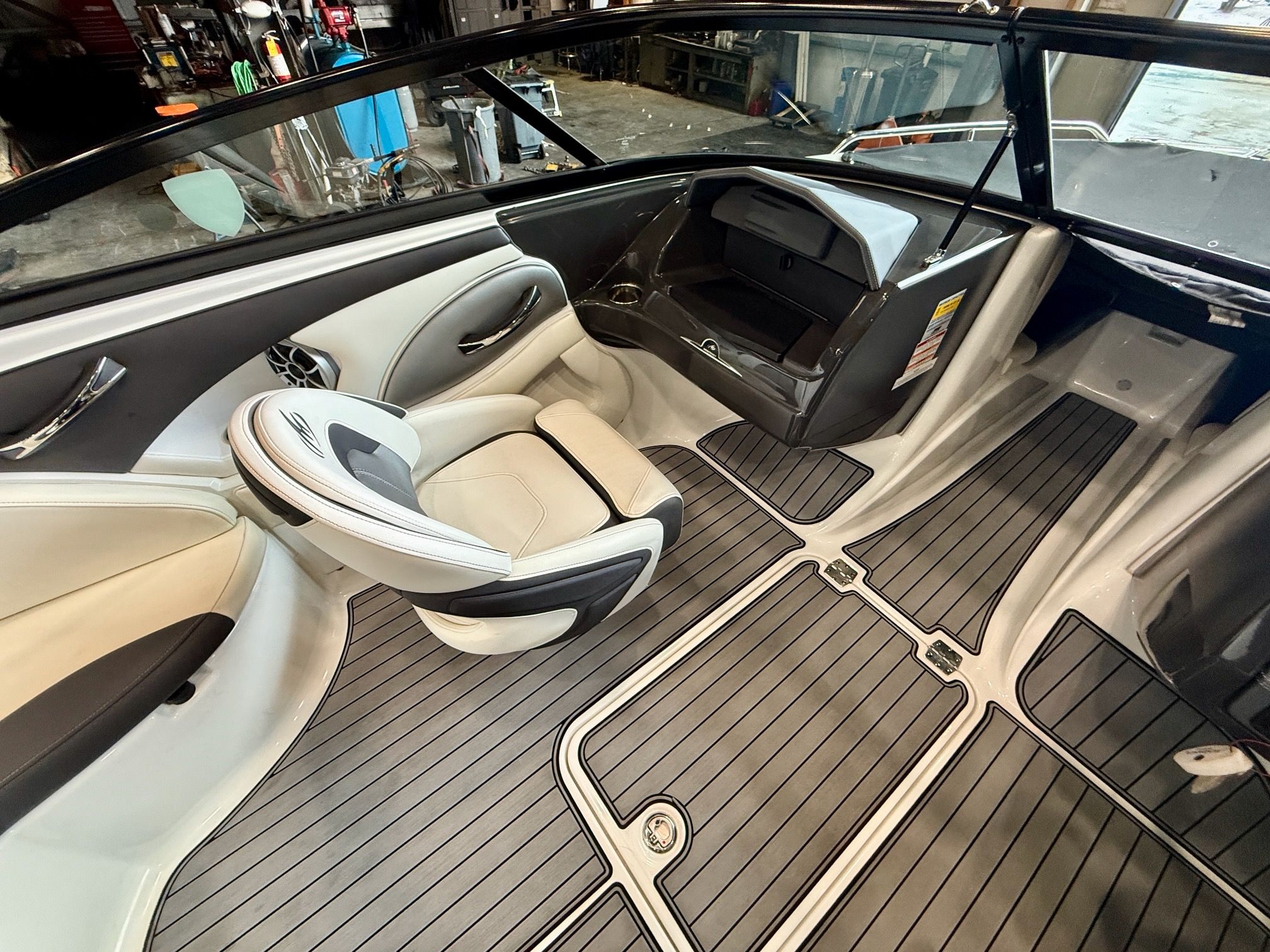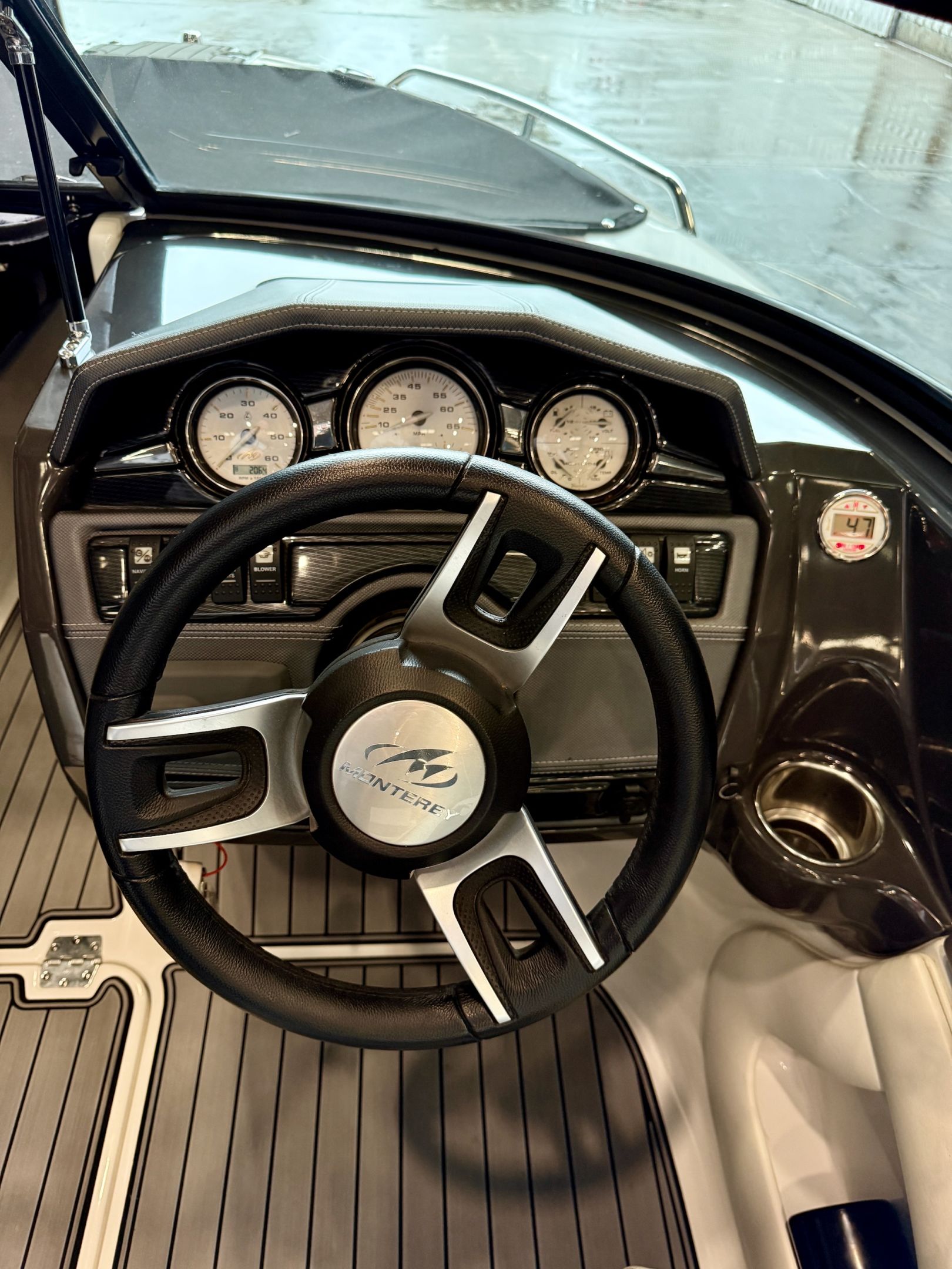 At the helm you’ll find recessed cleats, back-lit Faria gauges with stainless bezels, and a premium helm layout, while the Bimini top with boot provides shade on sunny days. The hull features Monterey’s Air Assist Chine design, which helps reduce drag, improves planing performance, and delivers sporty, confident handling.