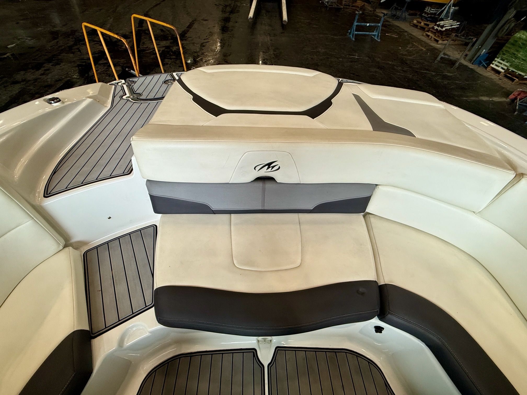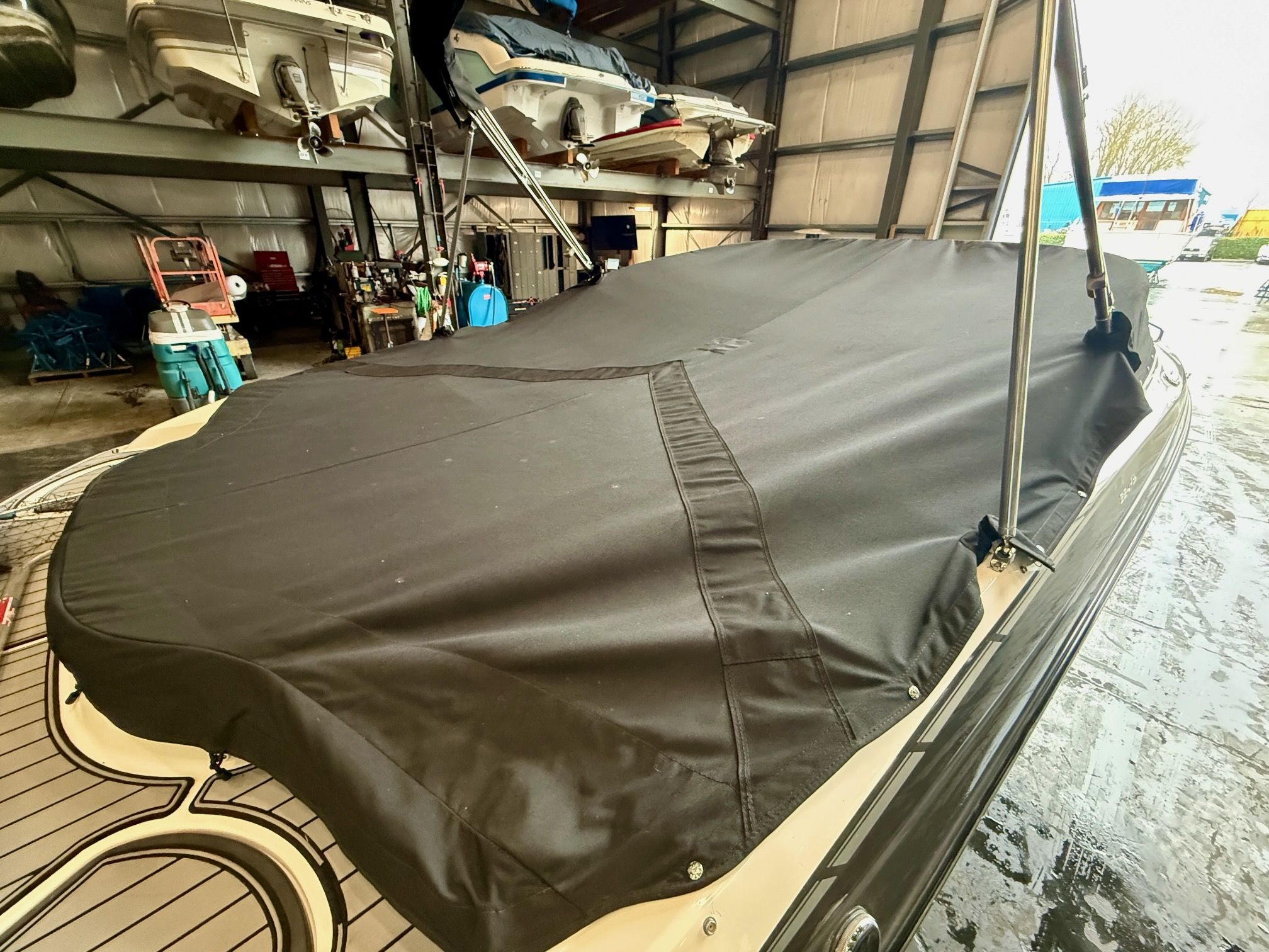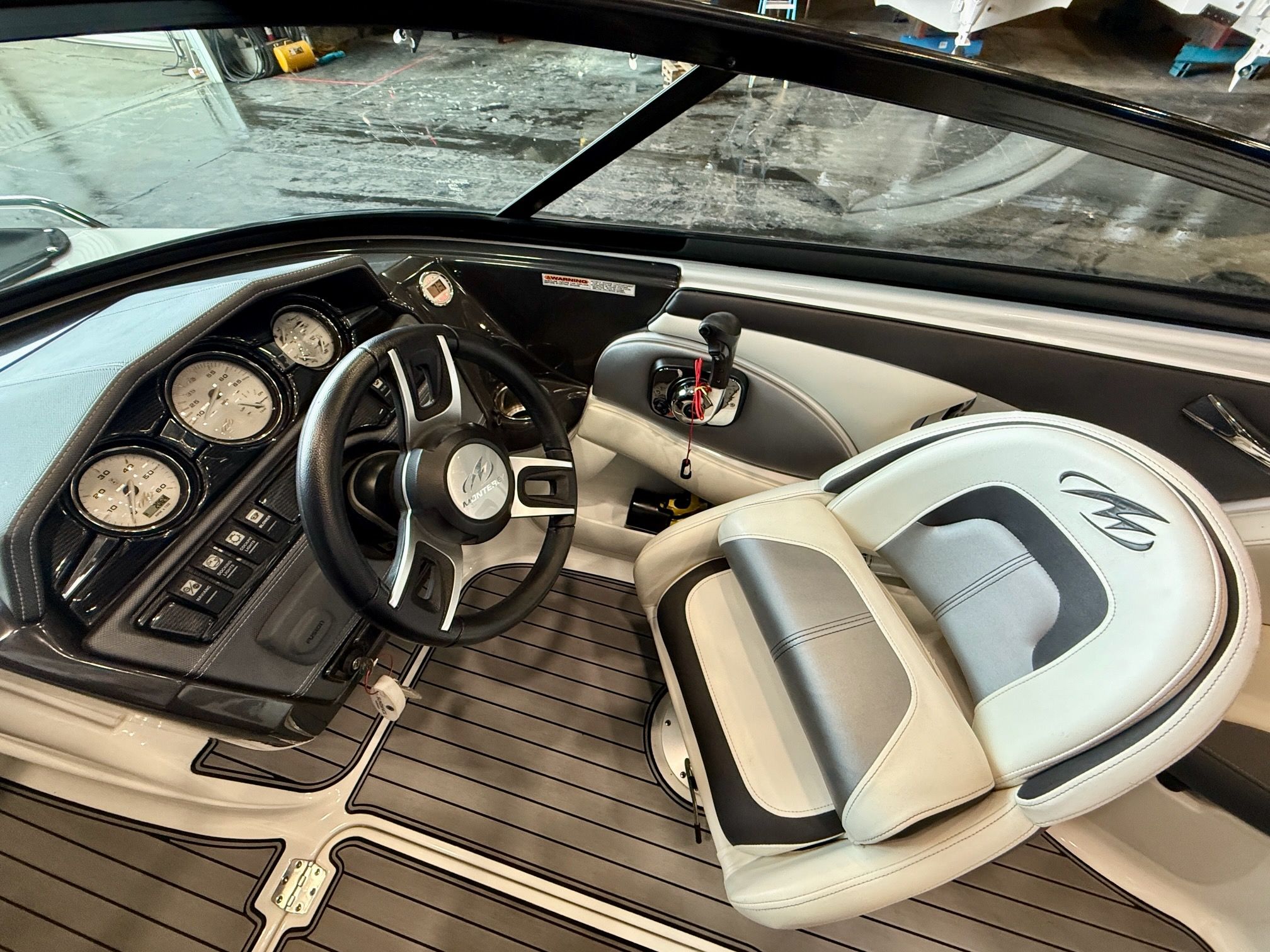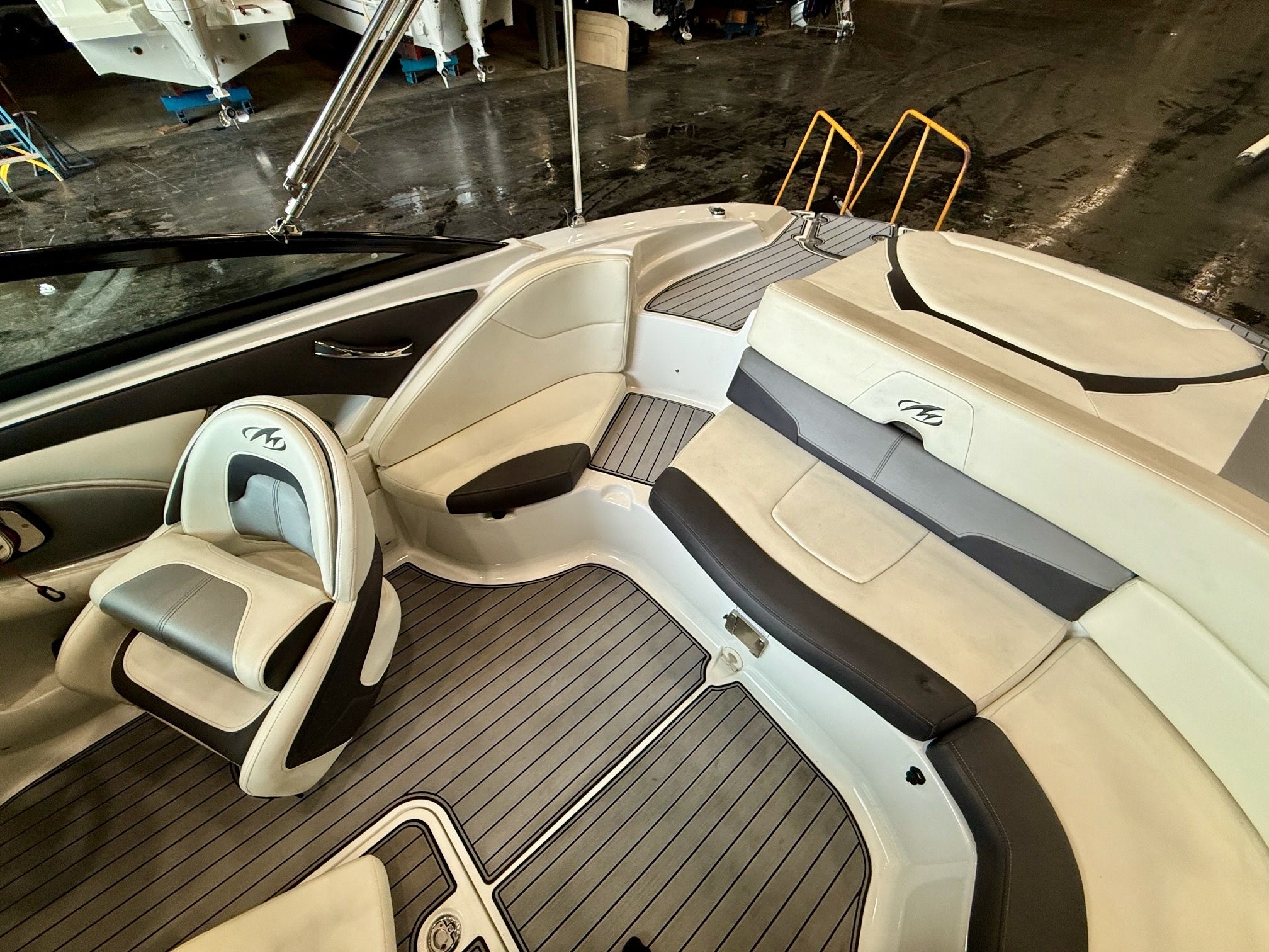 At the helm you’ll find recessed cleats, back-lit Faria gauges with stainless bezels, and a premium helm layout, while the Bimini top with boot provides shade on sunny days. The hull features Monterey’s Air Assist Chine design, which helps reduce drag, improves planing performance, and delivers sporty, confident handling.