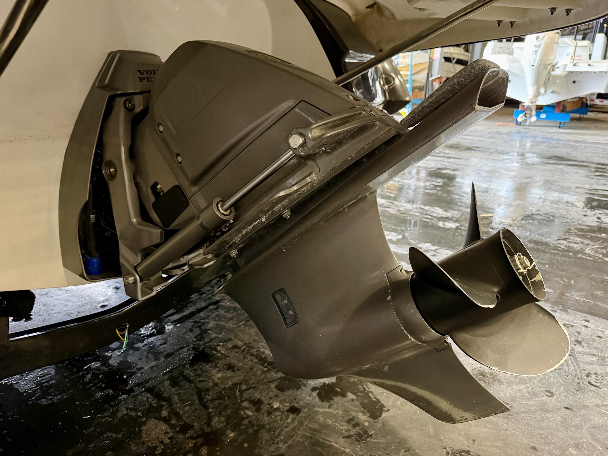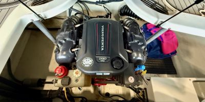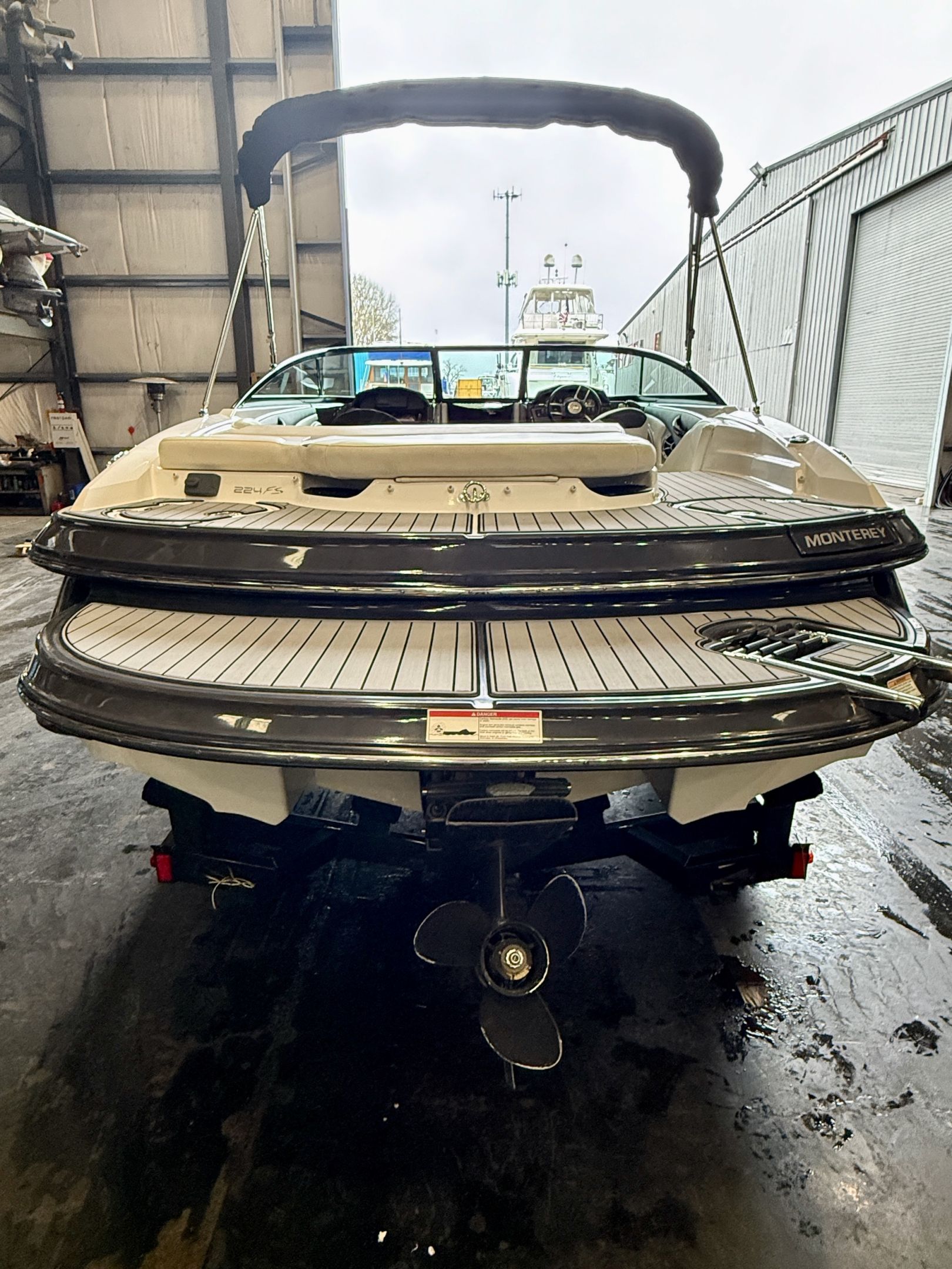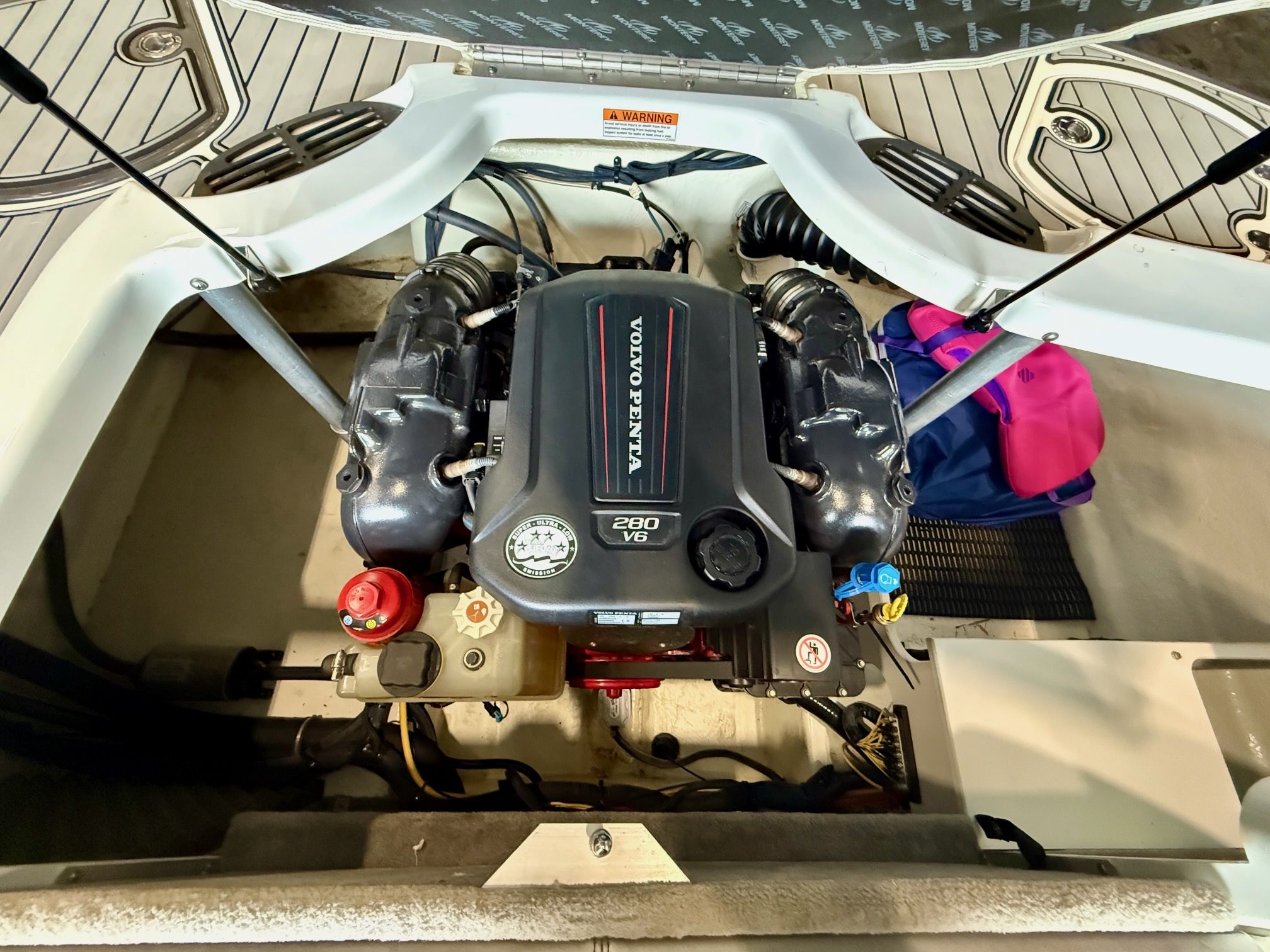 This Monterey 224FS measures 22’9” overall including the swim platform, with an 8’6” beam and a dry weight of approximately 3,500 lbs. Fuel capacity is 55 gallons, and it’s powered by a Volvo Penta V6 sterndrive (280 HP) delivering smooth, reliable power and excellent throttle response.