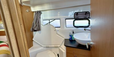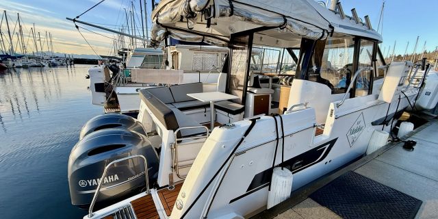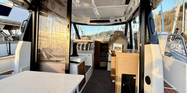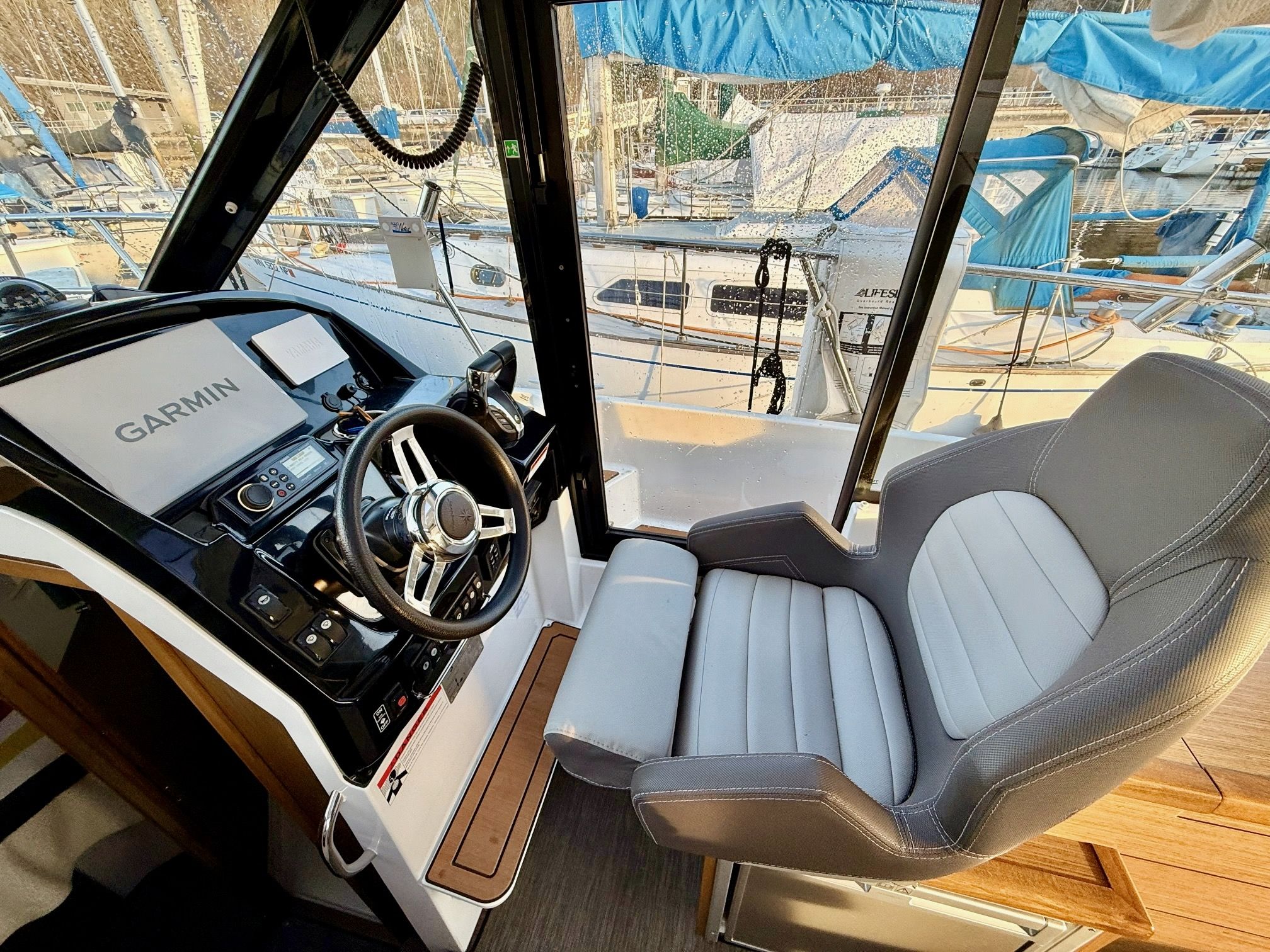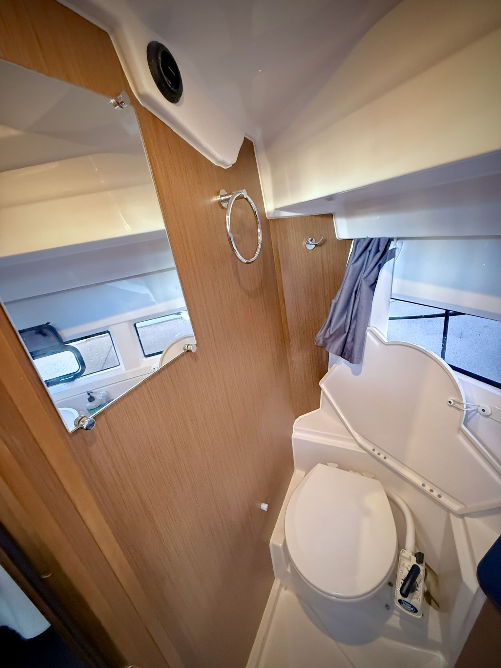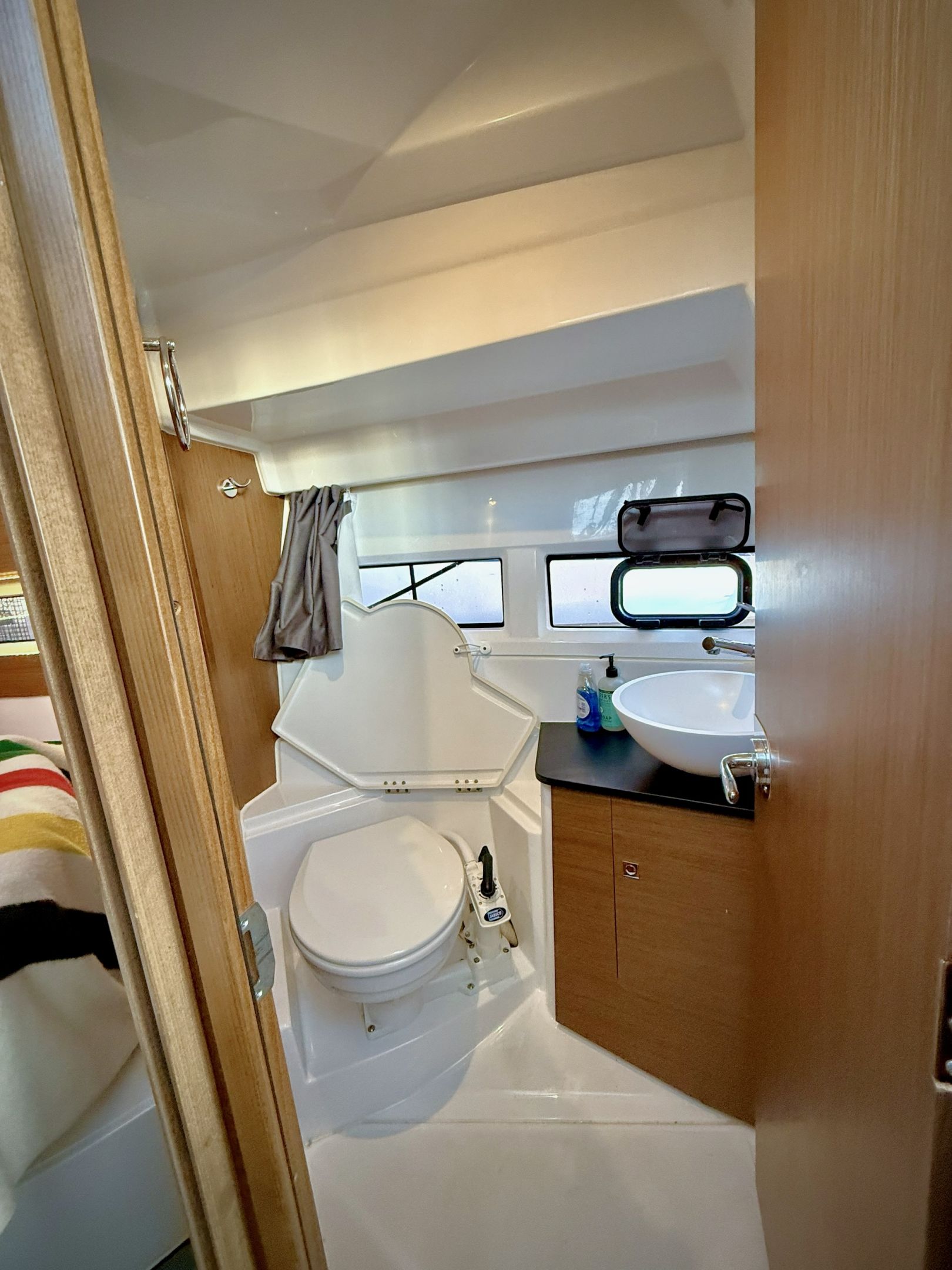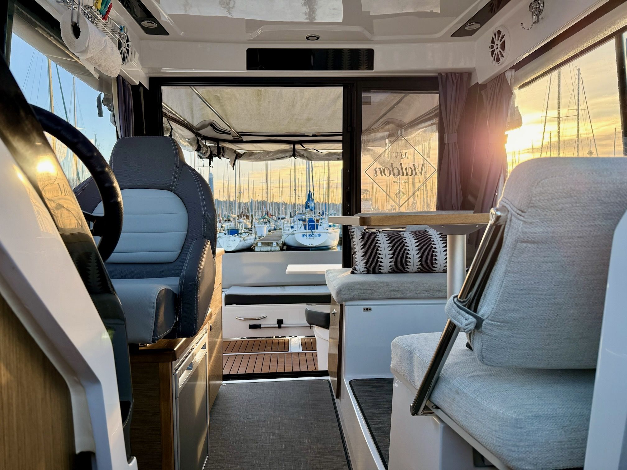 Step aboard and you’ll find a bright, open salon with panoramic windows, a fully equipped galley, and a convertible dinette that expands your sleeping capacity. Two private cabins provide true overnight comfort, while the enclosed head with shower makes extended trips easy.