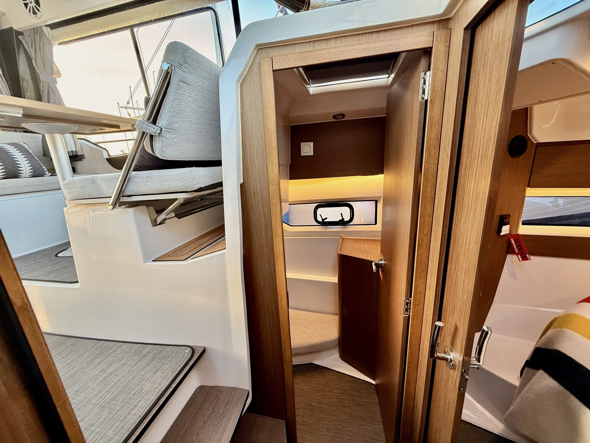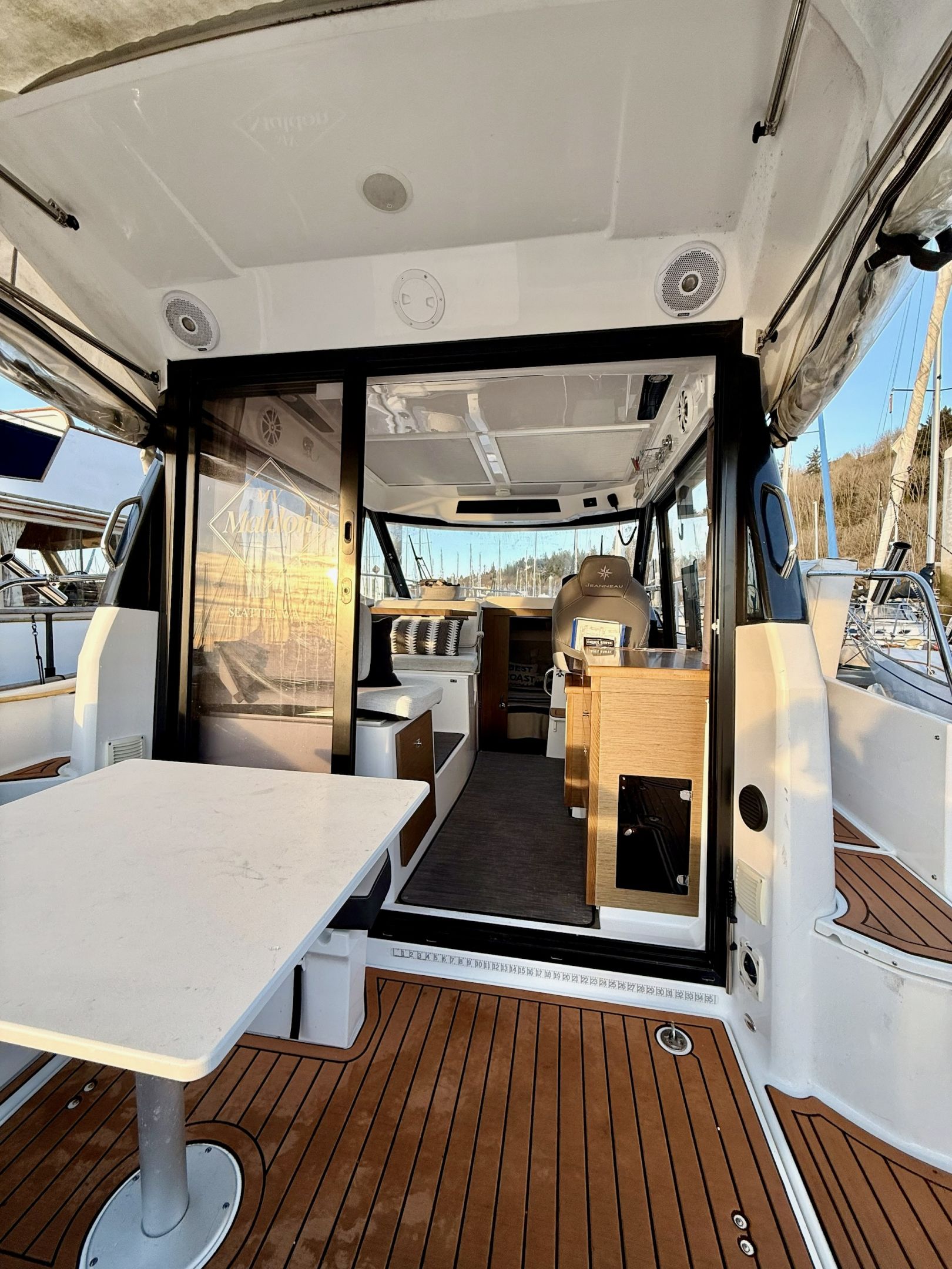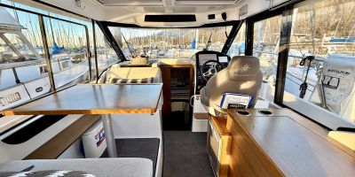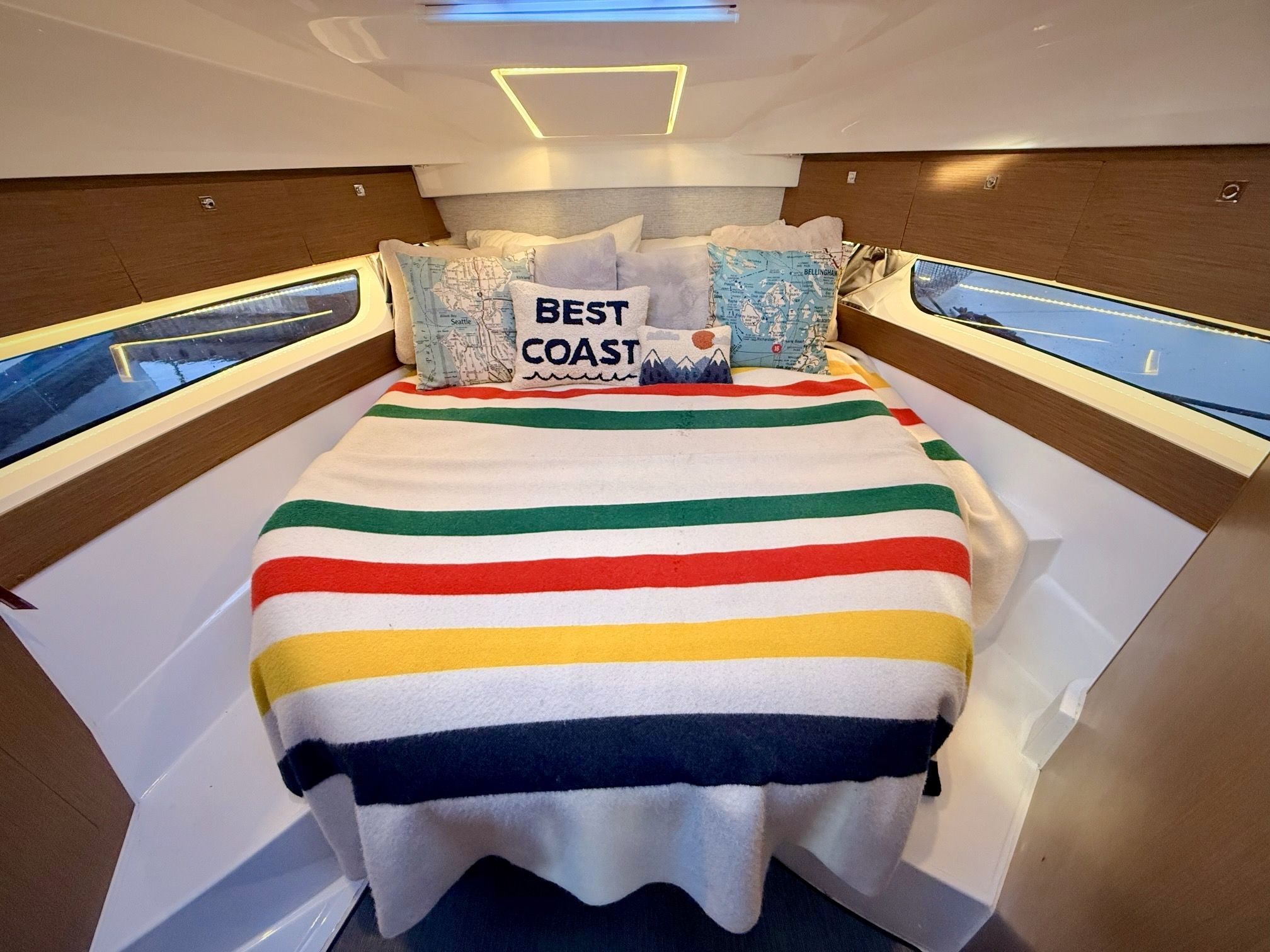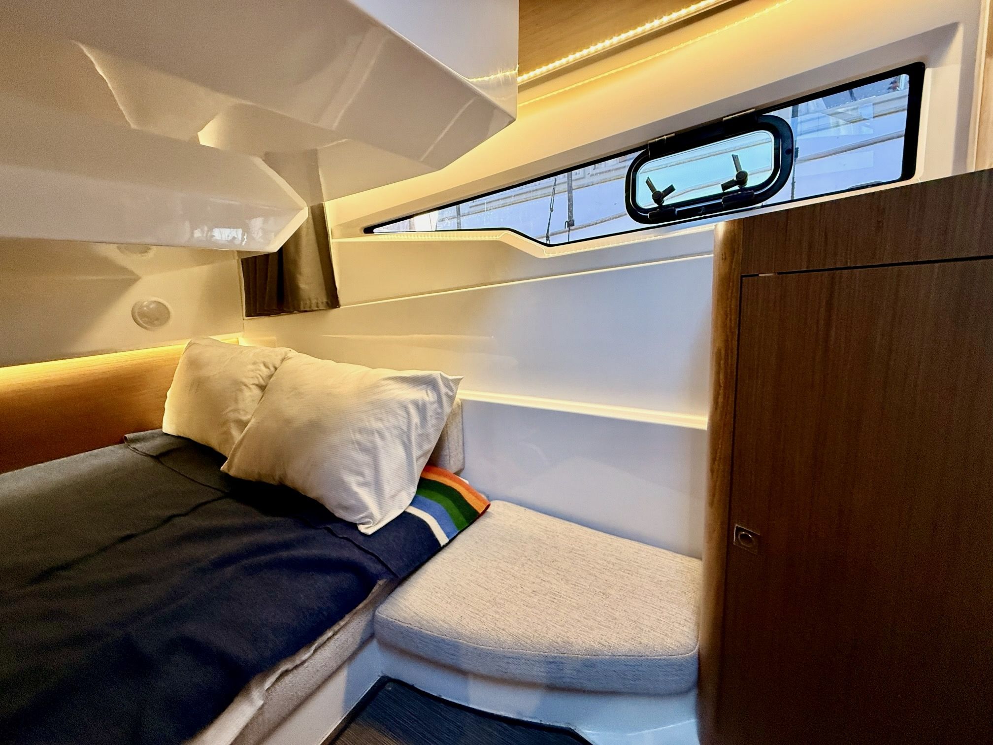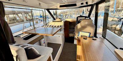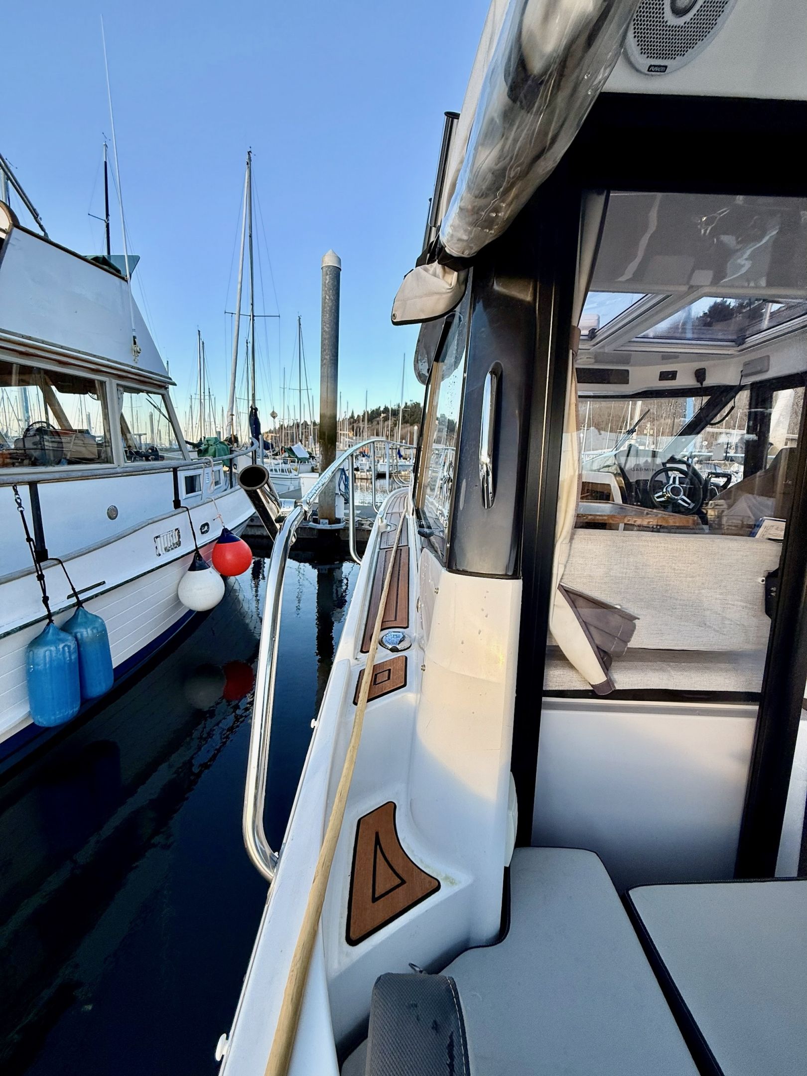Step aboard and you’ll find a bright, open salon with panoramic windows, a fully equipped galley, and a convertible dinette that expands your sleeping capacity. Two private cabins provide true overnight comfort, while the enclosed head with shower makes extended trips easy.