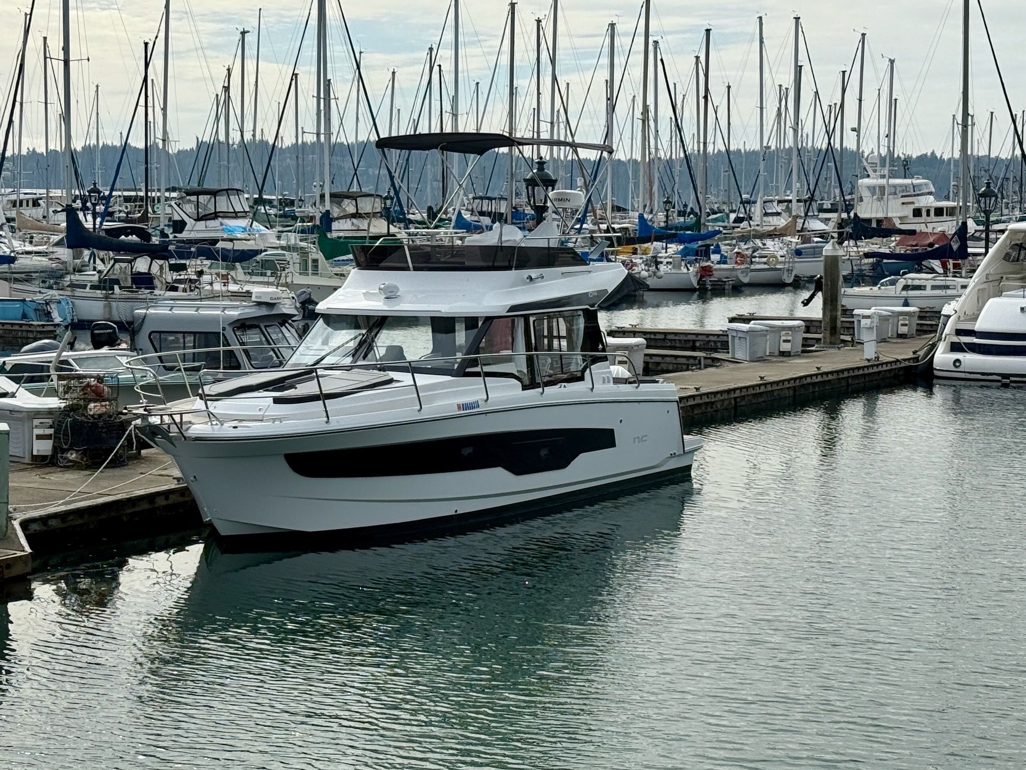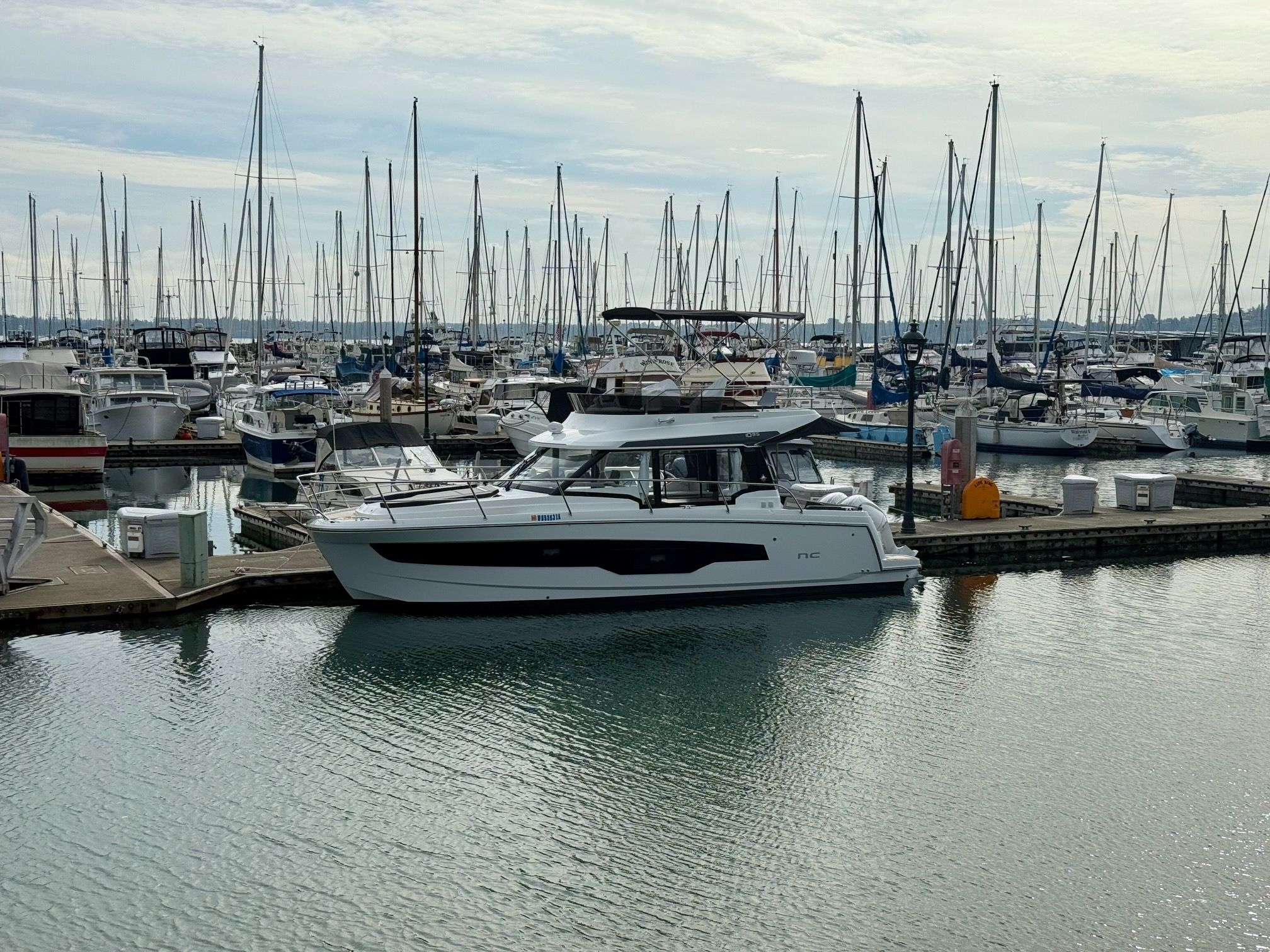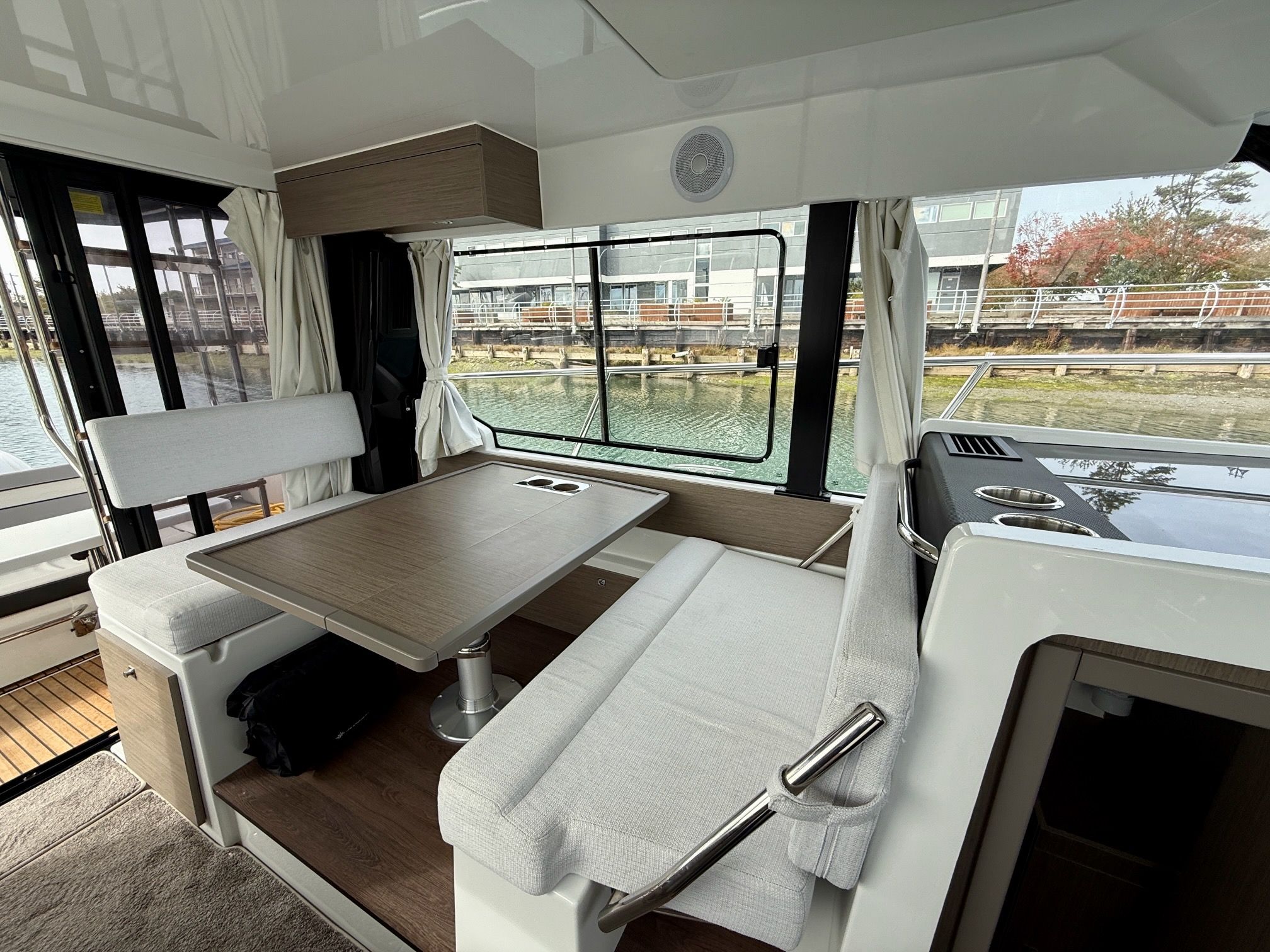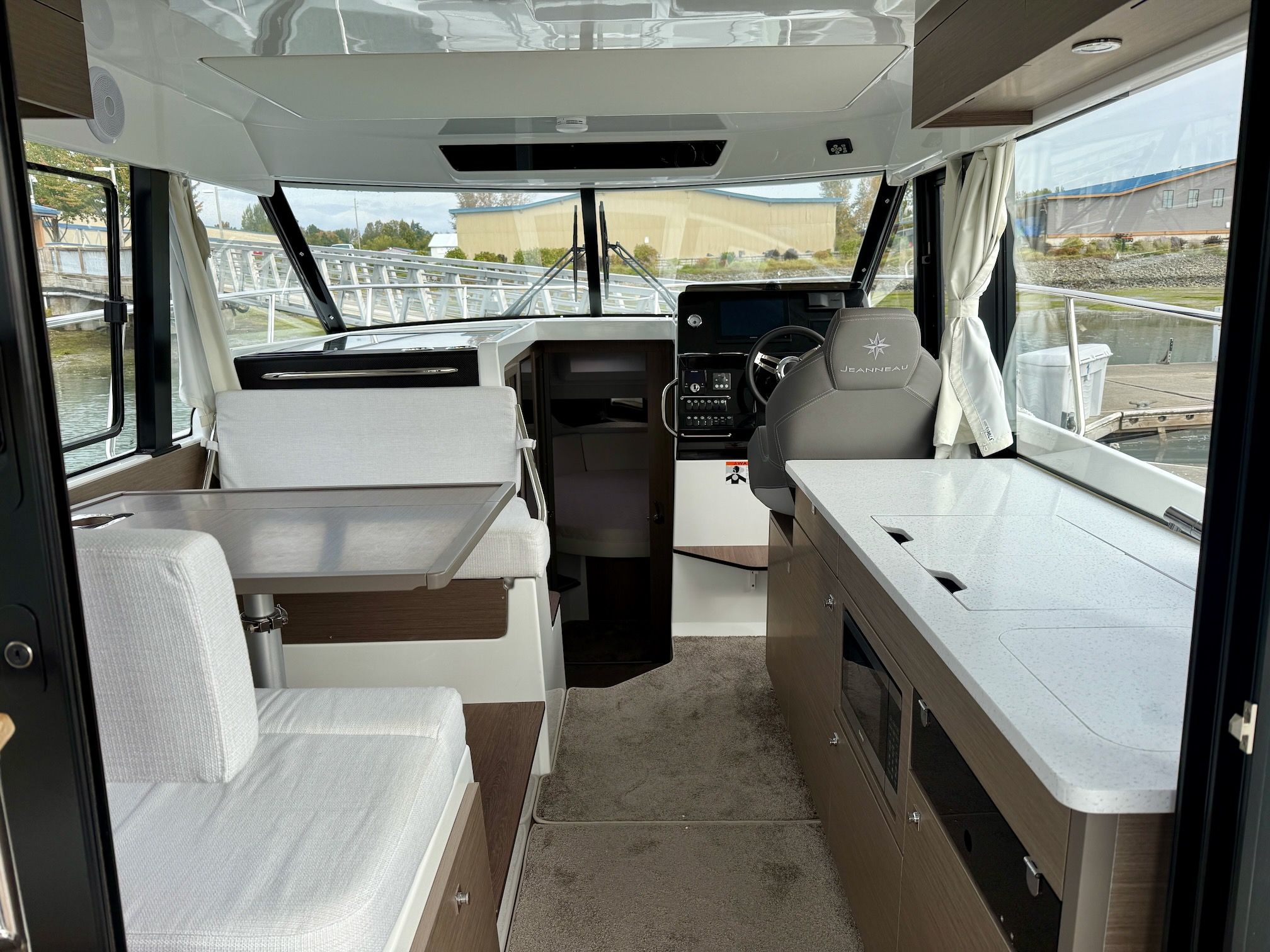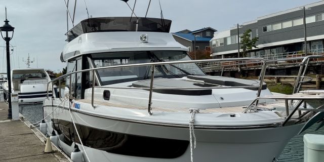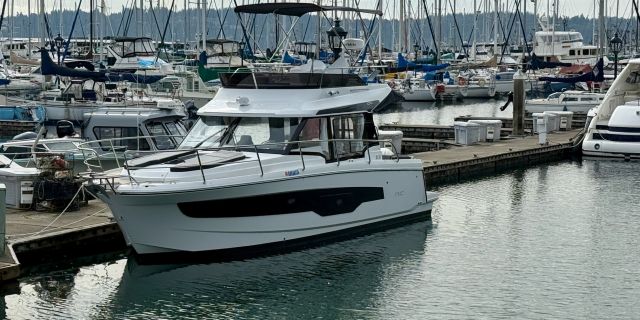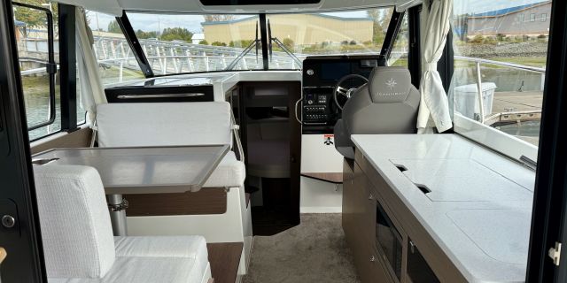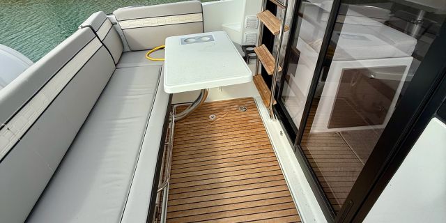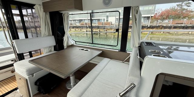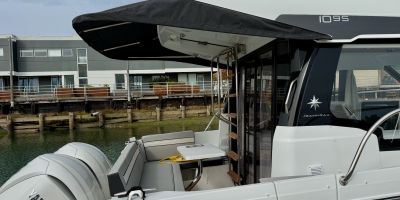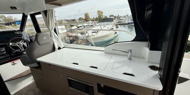 Like all Jeanneaus, the NC 1095 has been designed for life underway and include some clever features like recessed side-decks allowing for safe movement about the boat with easy access to the helm. A large L-shaped lounge comfortably fits a large group and easily converts into a large lounging area. Large transom platforms on either side of the outboard engines, make boarding safe and easy. To fully enjoy life on the water, the forward sundeck with its lifting back rests, provides for additional living space while on deck.
