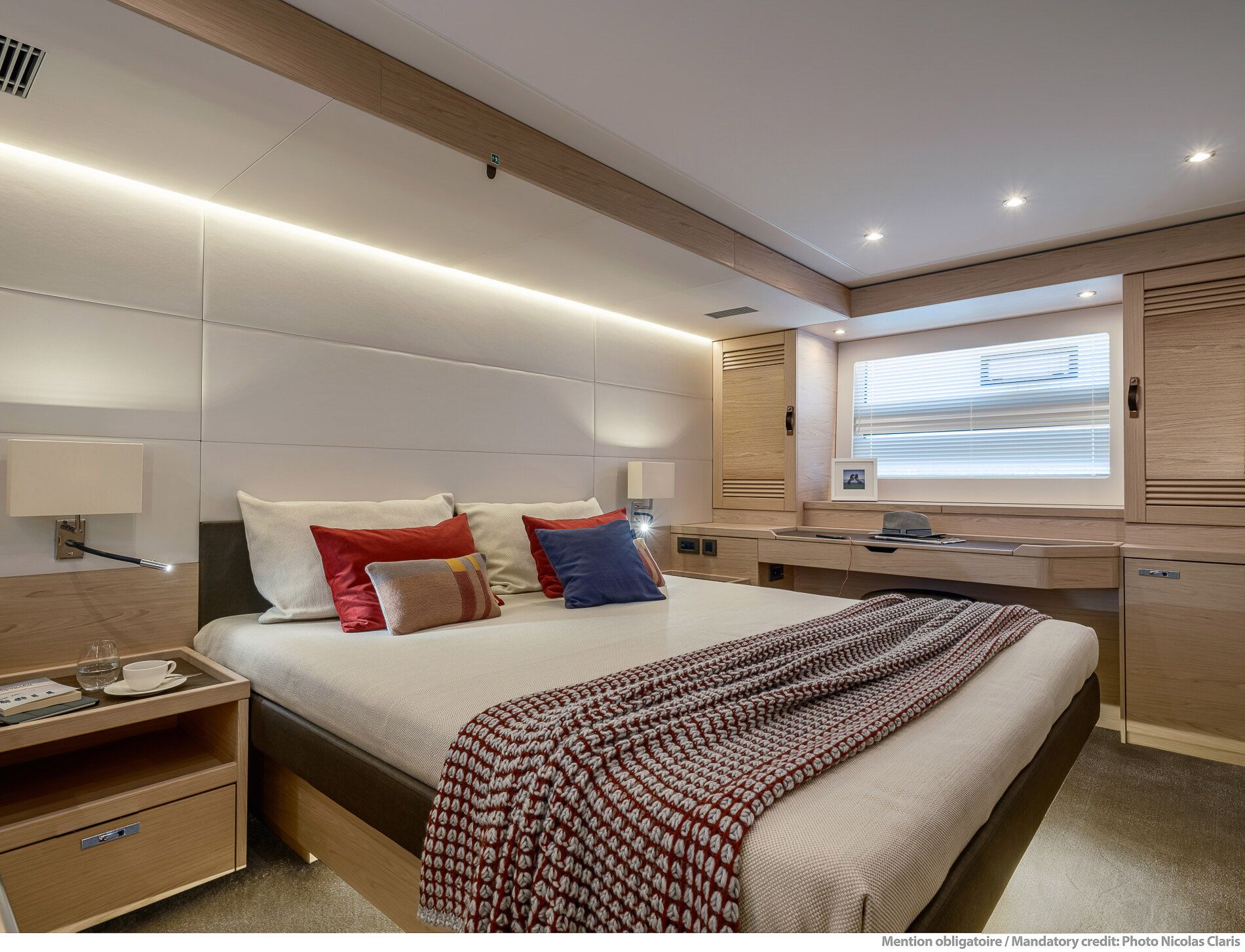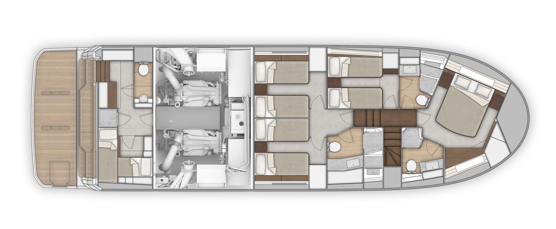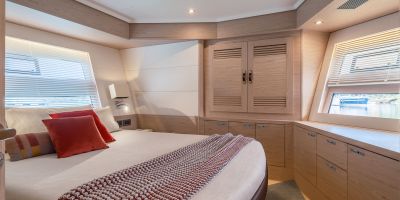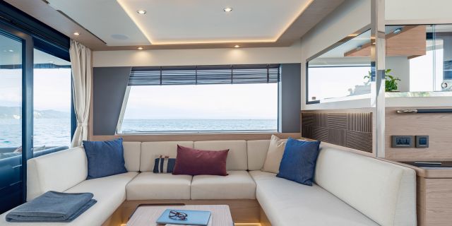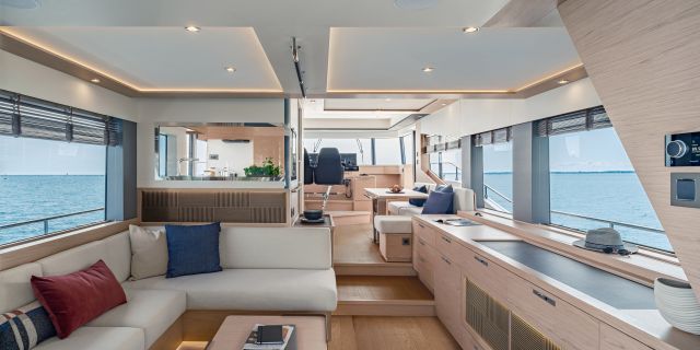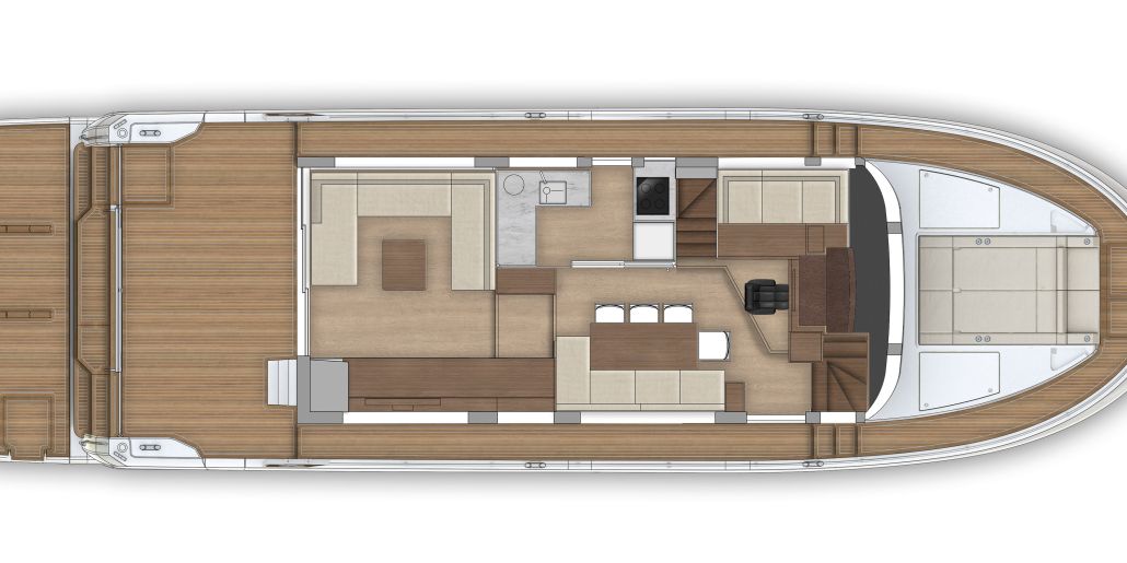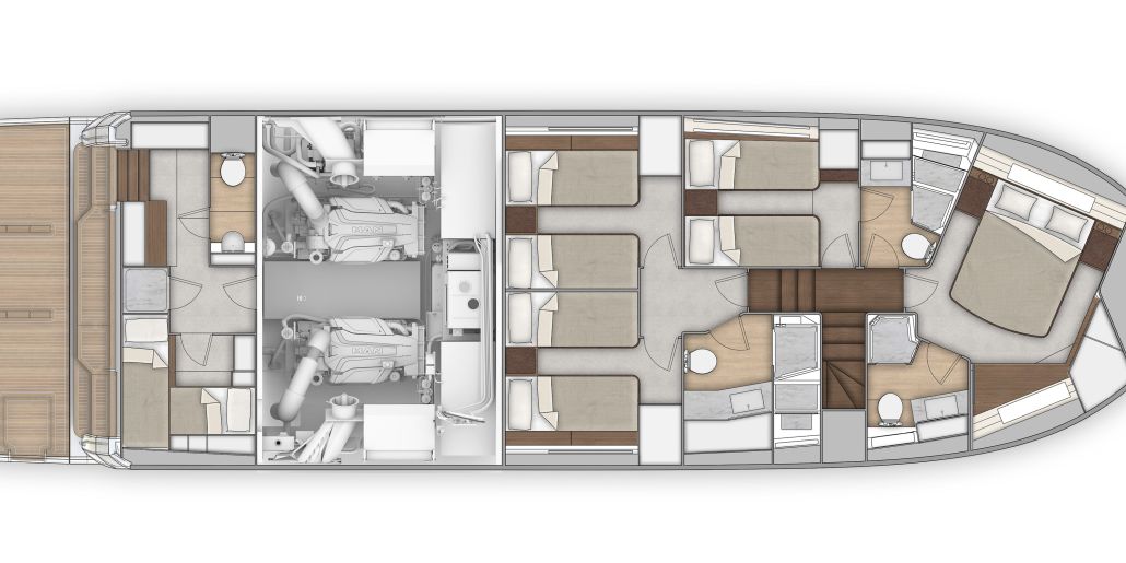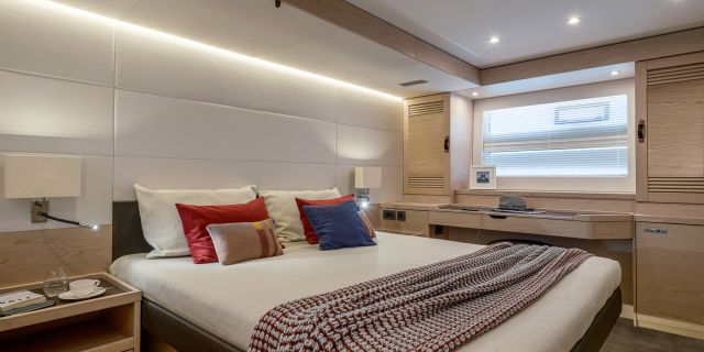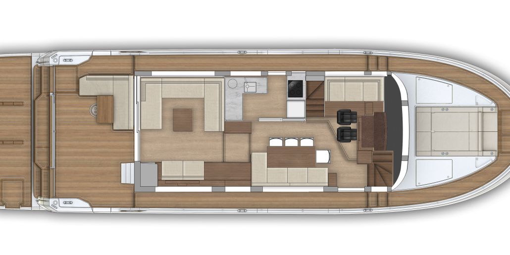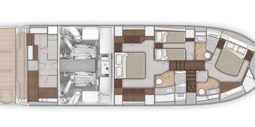 Inside, the raised pilothouse leads to the aft owner’s cabin across the full beam: island berth, walk-in closet, and head with dual sinks and separate rain shower. Forward VIP has convertible berths and en-suite access; midship twin shares a guest head. Choose the four-cabin layout for an extra bunk below. Main saloon’s forward galley includes island counters, oven, and wine cooler opposite a U-shaped dinette under skylights, finished in linen and oak for quiet passages.