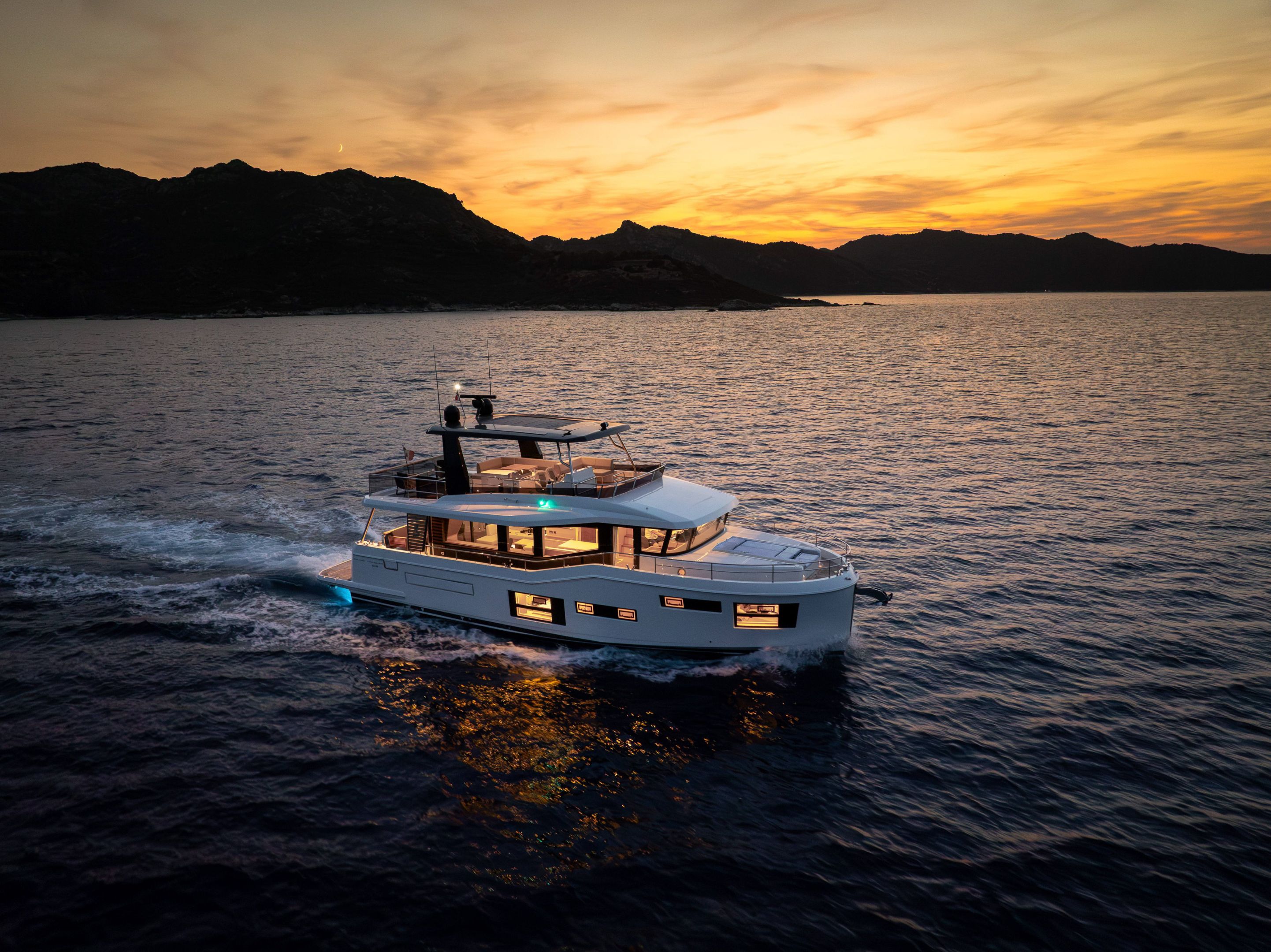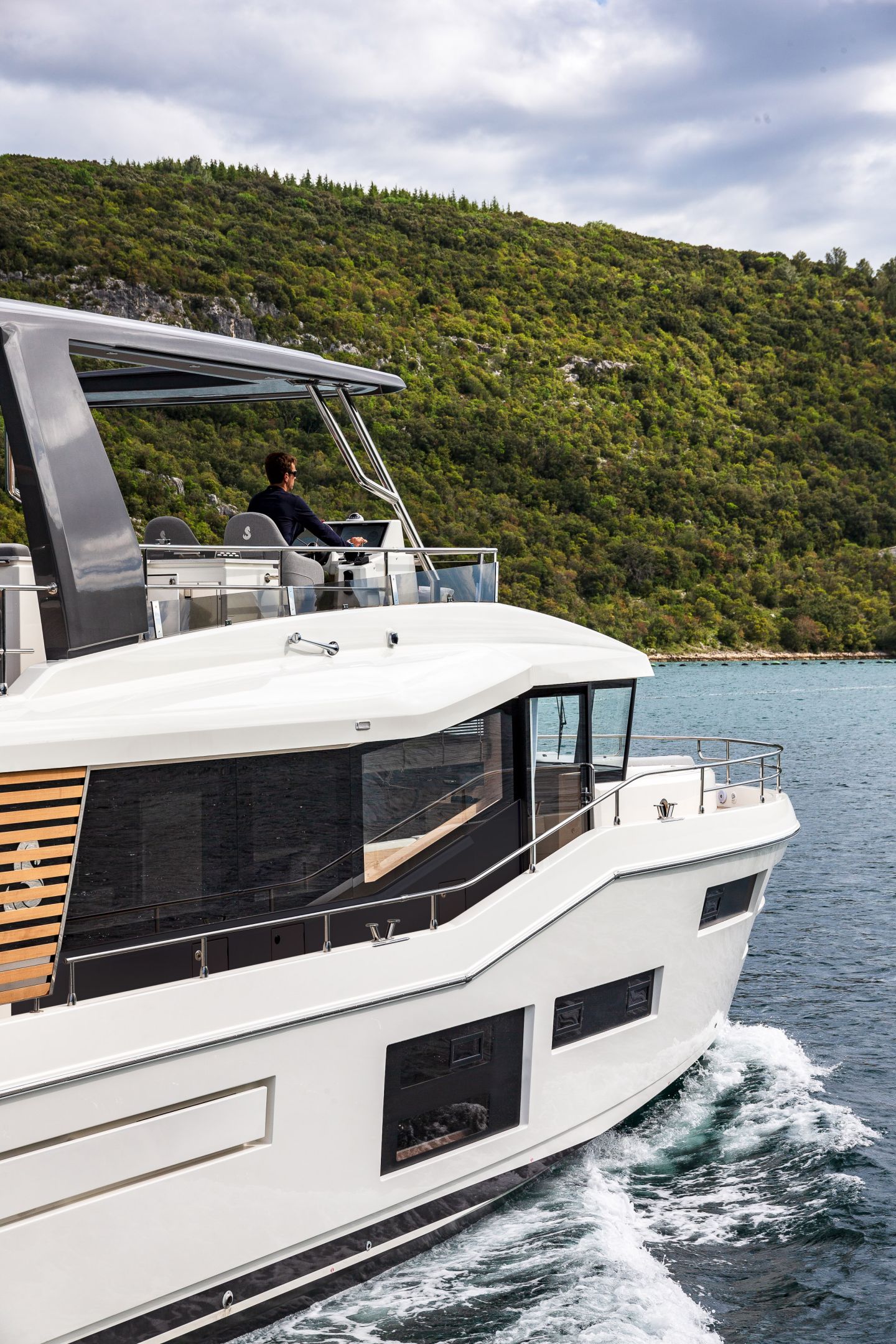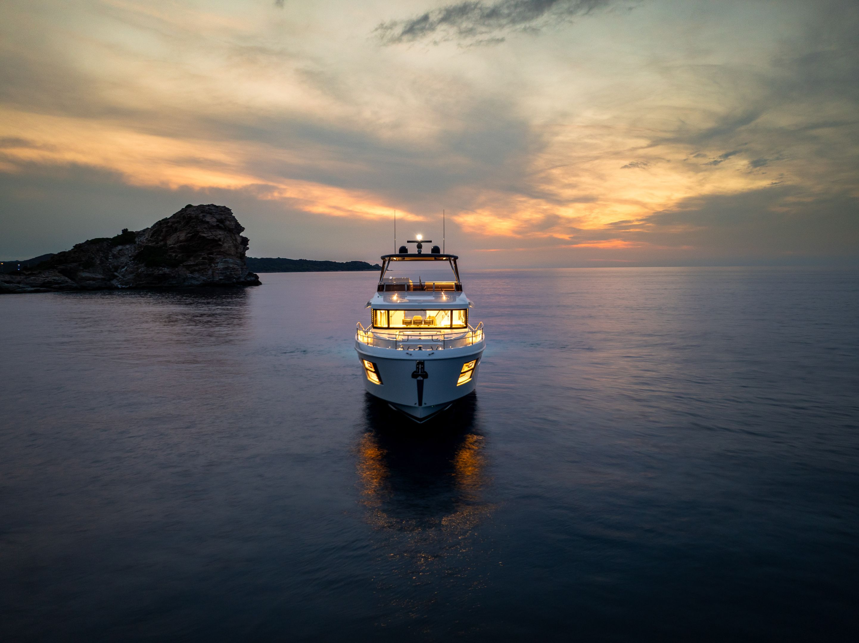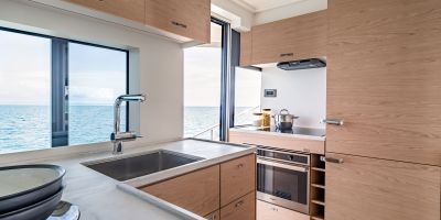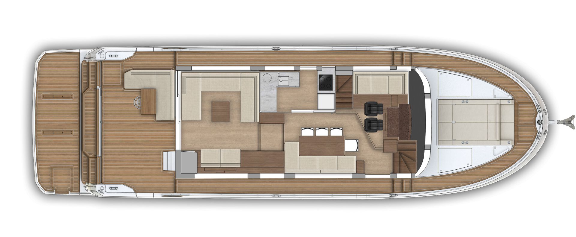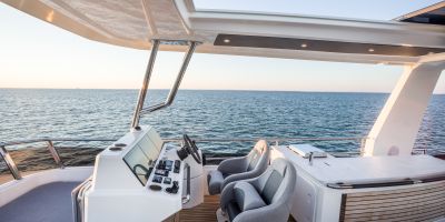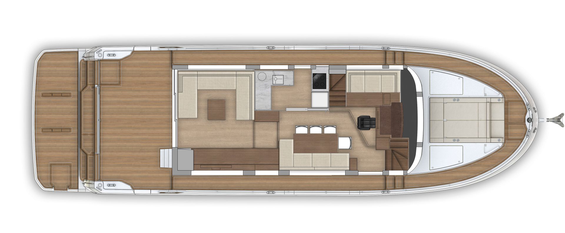 Inside, the raised pilothouse leads to the aft owner’s cabin across the full beam: island berth, walk-in closet, and head with dual sinks and separate rain shower. Forward VIP has convertible berths and en-suite access; midship twin shares a guest head. Choose the four-cabin layout for an extra bunk below. Main saloon’s forward galley includes island counters, oven, and wine cooler opposite a U-shaped dinette under skylights, finished in linen and oak for quiet passages.