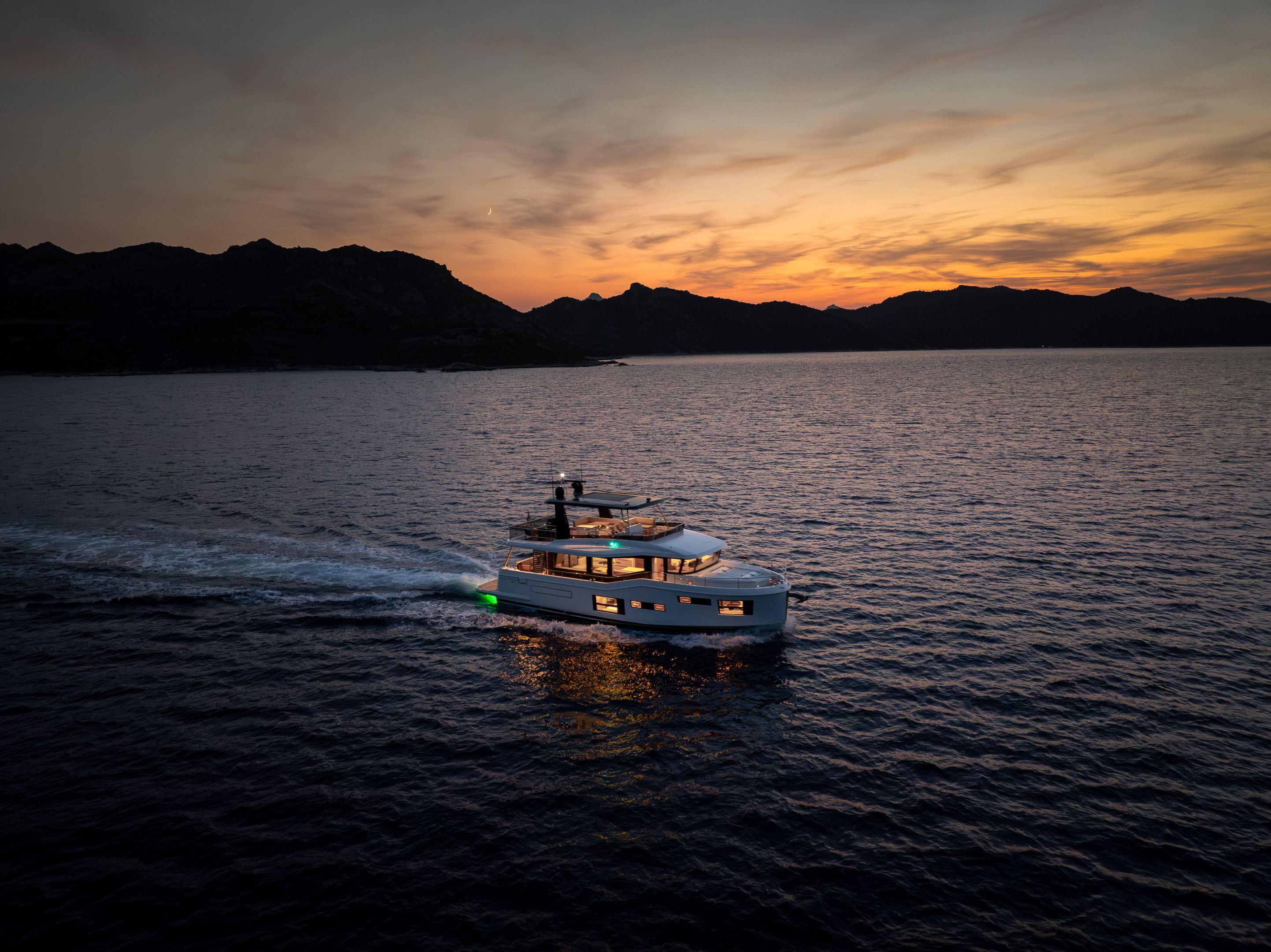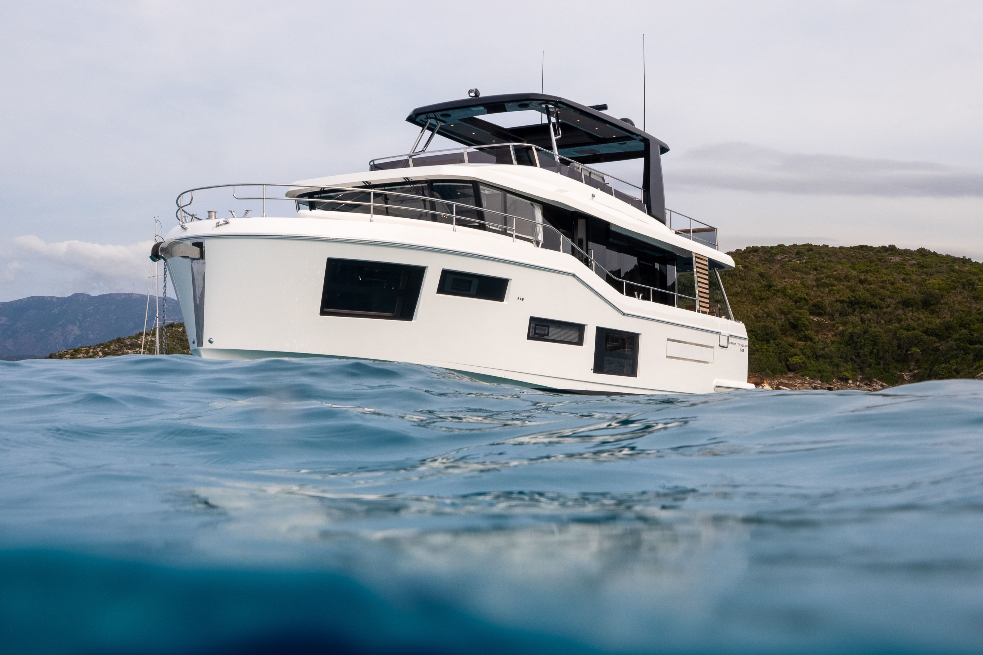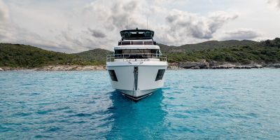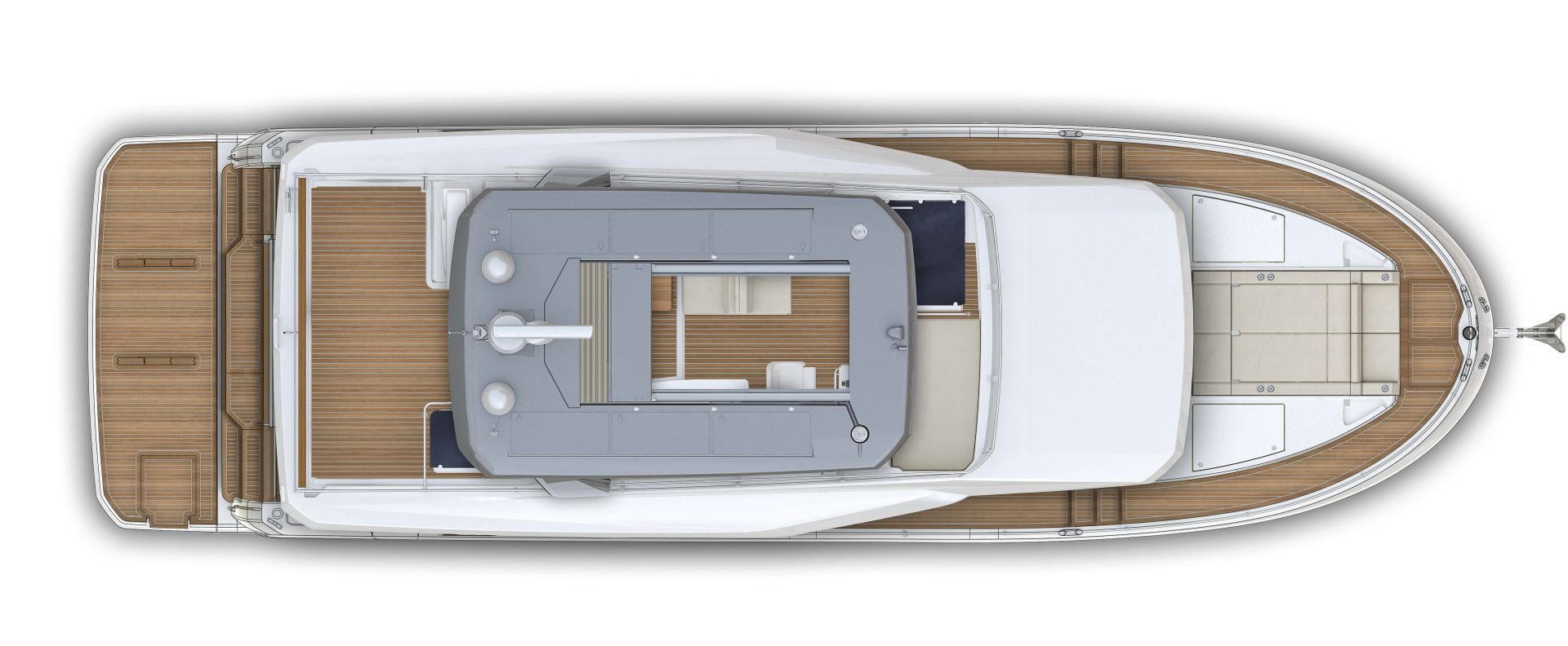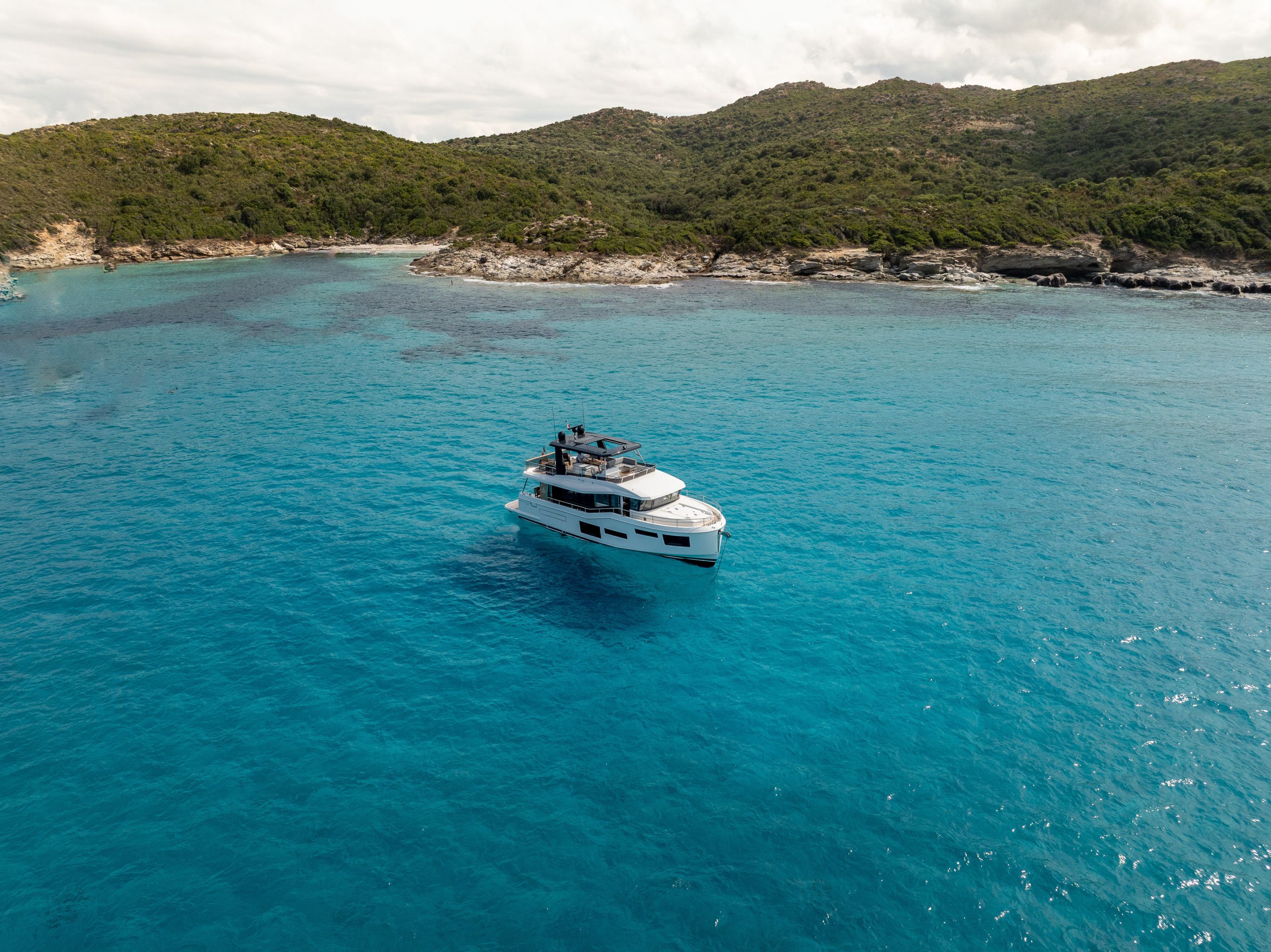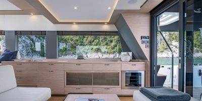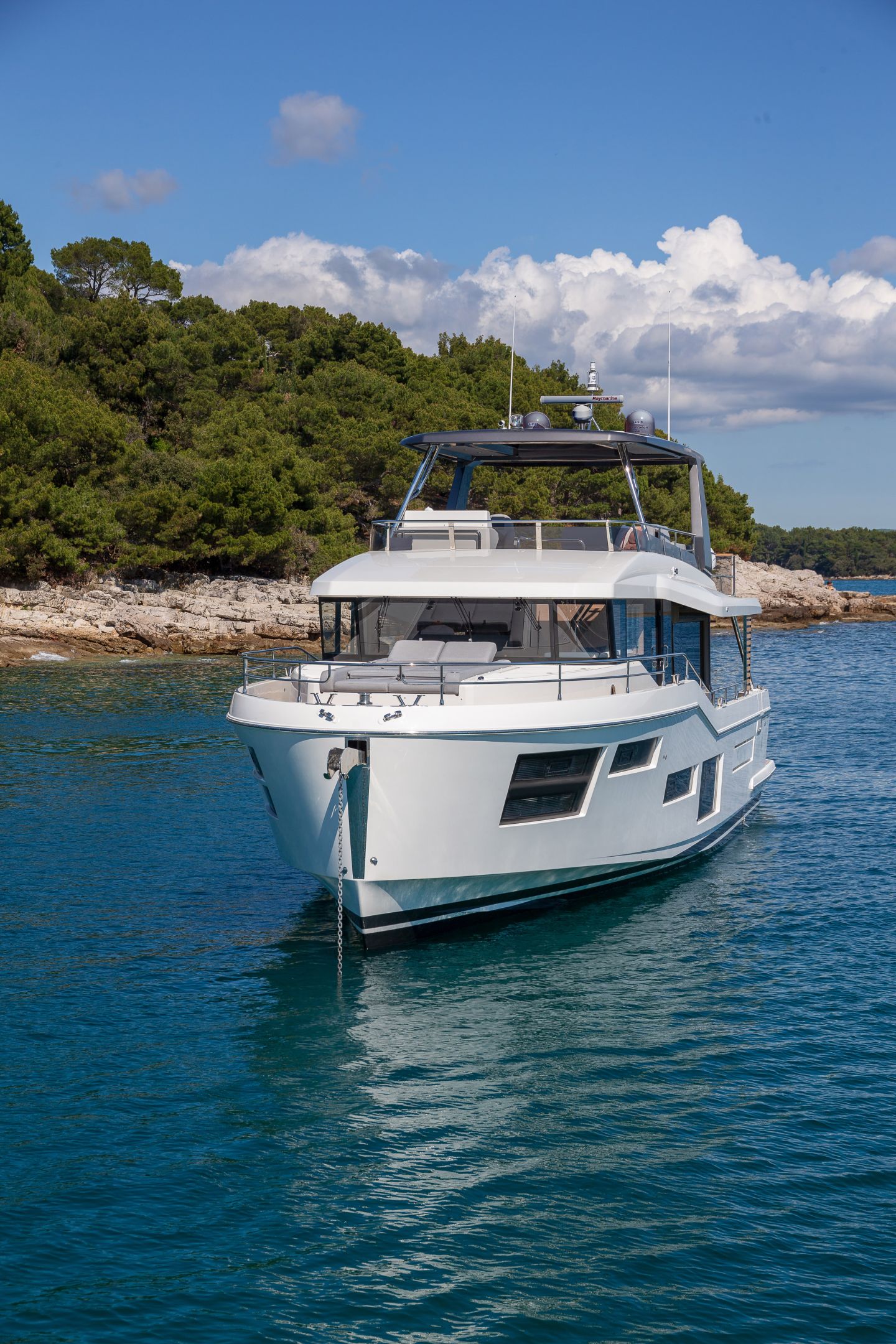 Inside, the raised pilothouse leads to the aft owner’s cabin across the full beam: island berth, walk-in closet, and head with dual sinks and separate rain shower. Forward VIP has convertible berths and en-suite access; midship twin shares a guest head. Choose the four-cabin layout for an extra bunk below. Main saloon’s forward galley includes island counters, oven, and wine cooler opposite a U-shaped dinette under skylights, finished in linen and oak for quiet passages.
