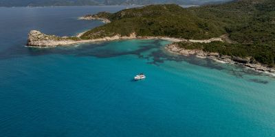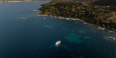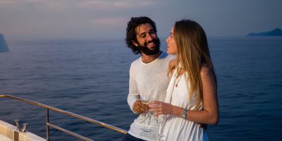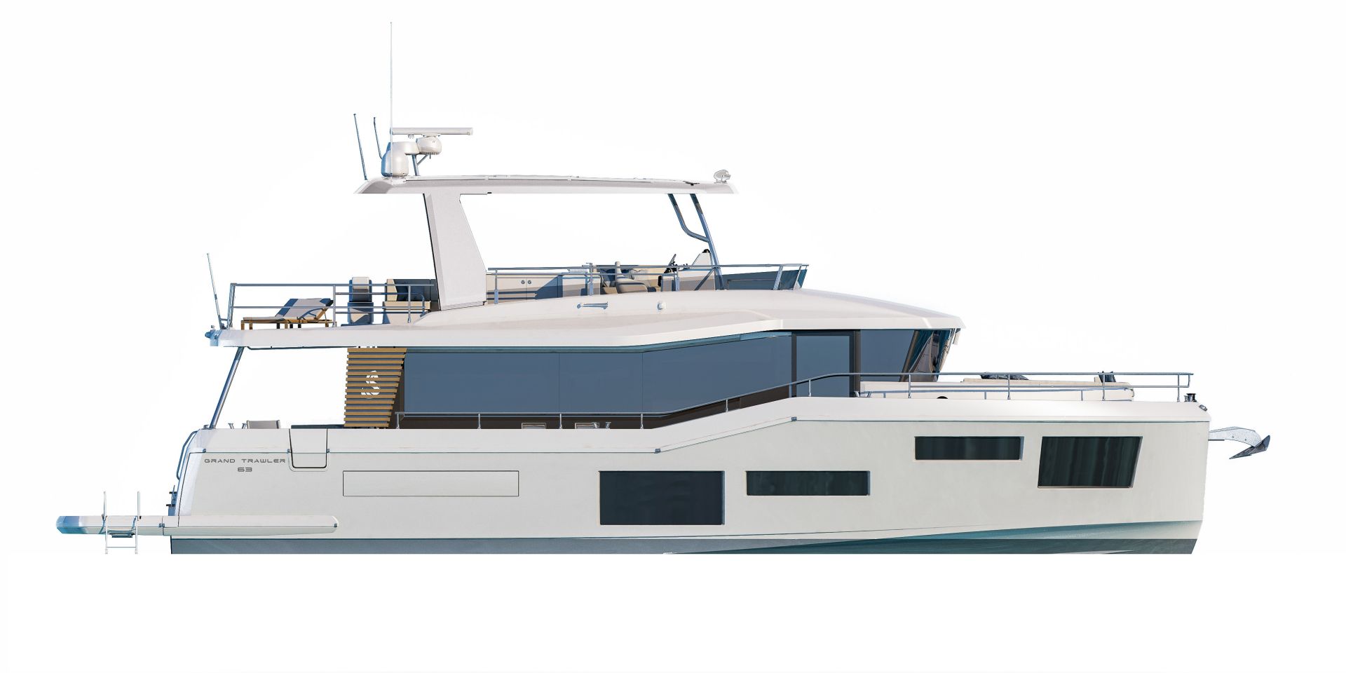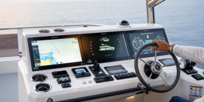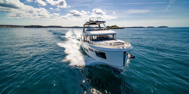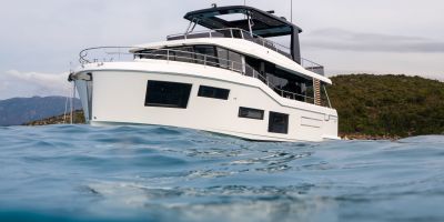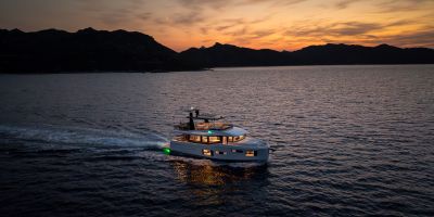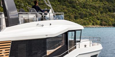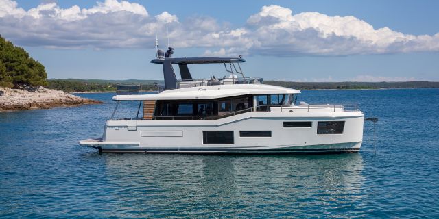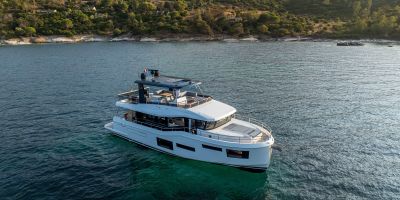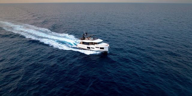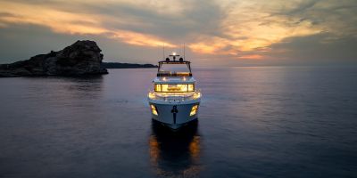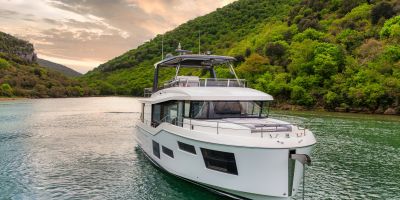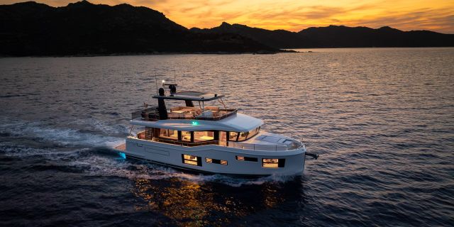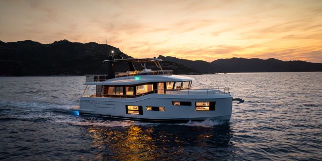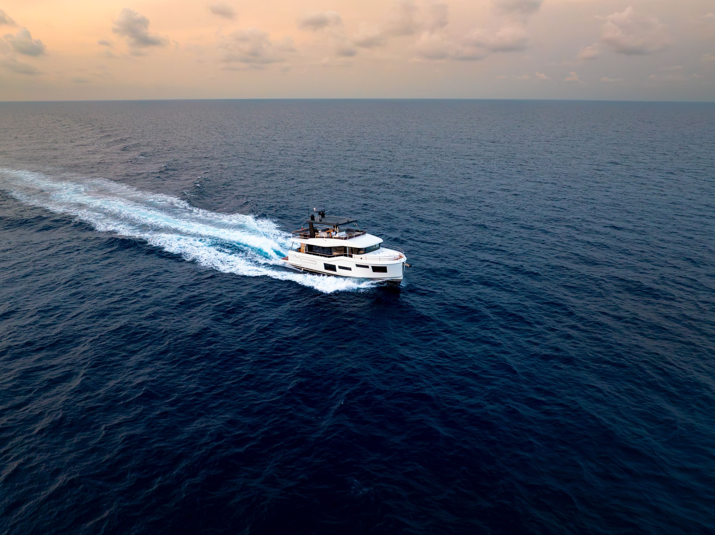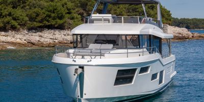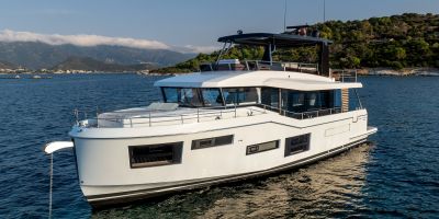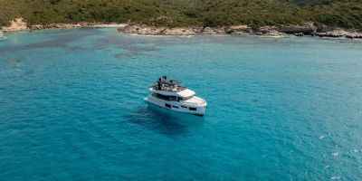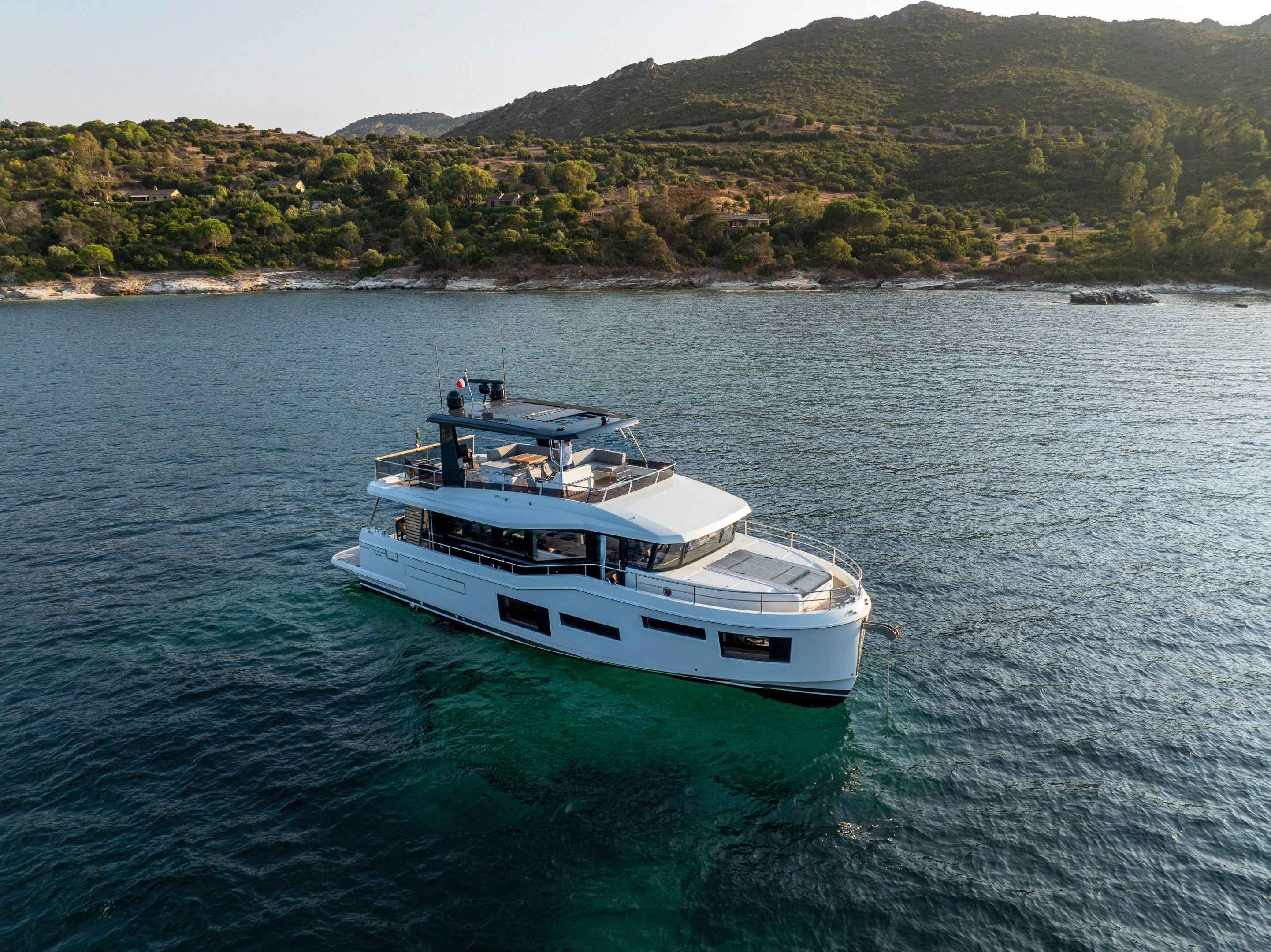 Inside, the raised pilothouse leads to the aft owner’s cabin across the full beam: island berth, walk-in closet, and head with dual sinks and separate rain shower. Forward VIP has convertible berths and en-suite access; midship twin shares a guest head. Choose the four-cabin layout for an extra bunk below. Main saloon’s forward galley includes island counters, oven, and wine cooler opposite a U-shaped dinette under skylights, finished in linen and oak for quiet passages.