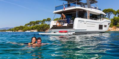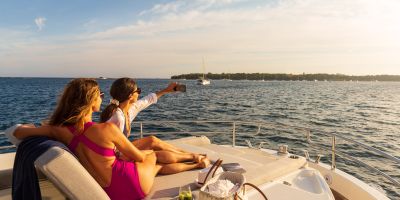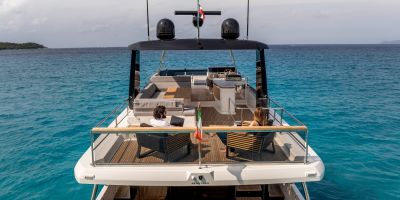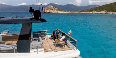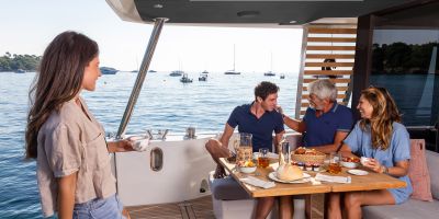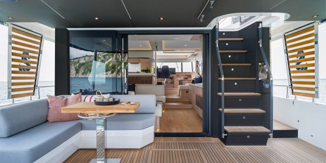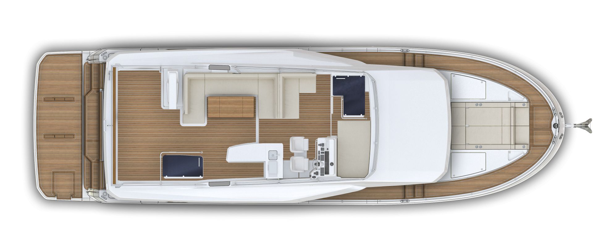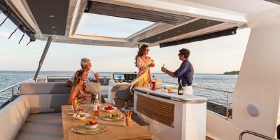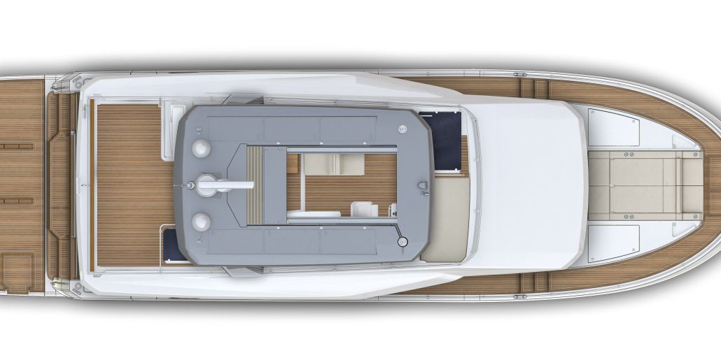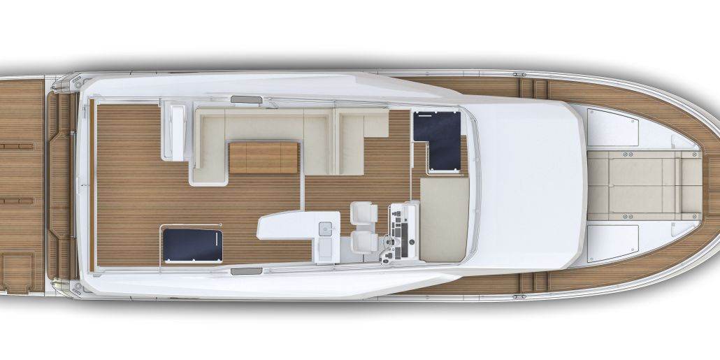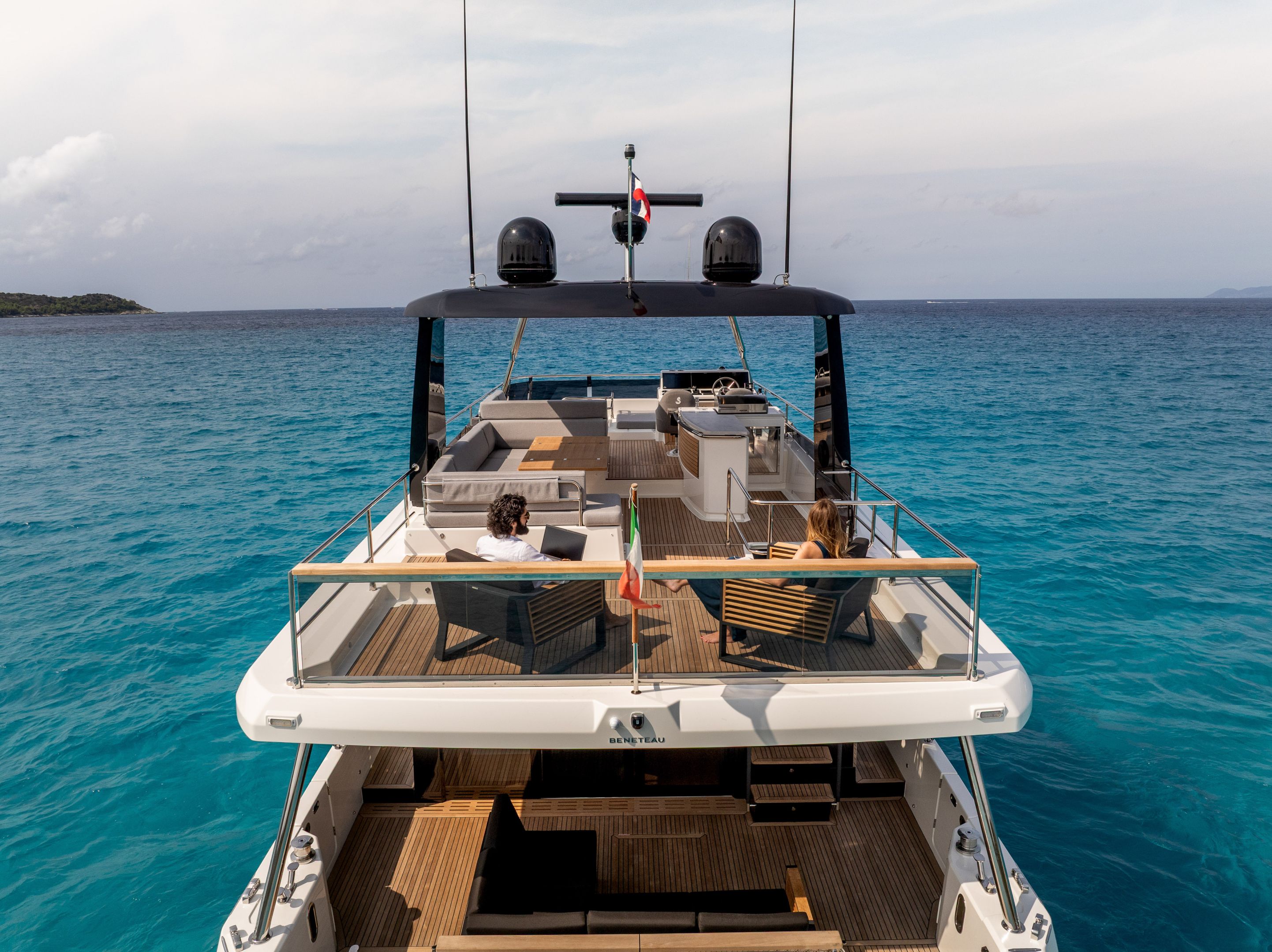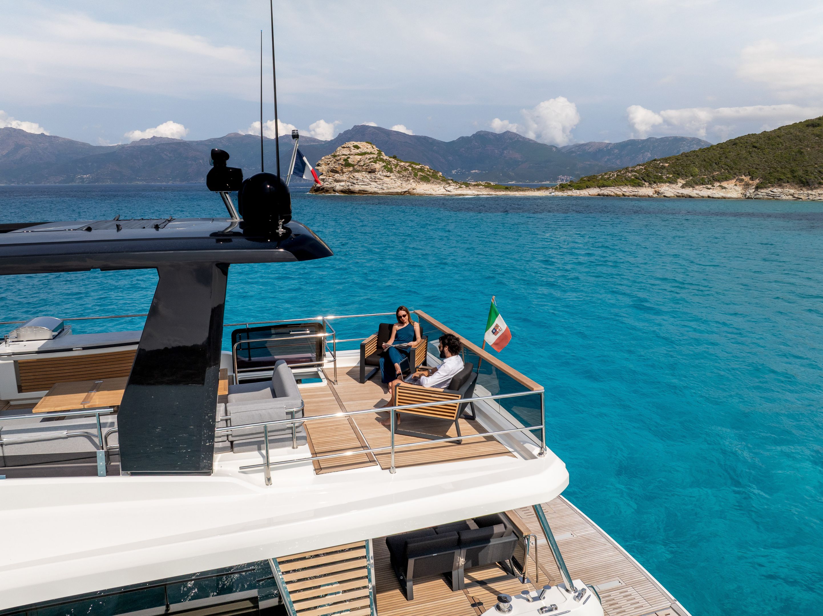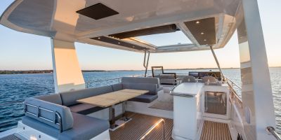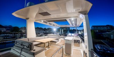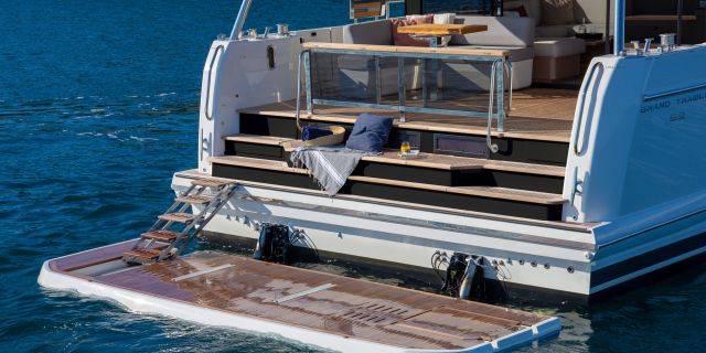 The flybridge serves as a shaded upper deck: curved bench and teak table fit a group for meals, with a grill, icemaker, and cooler drawer nearby under the optional hardtop. The helm has clear screens for navigation. Cockpit below offers facing benches that adjust for dining or relaxing, and the hydraulic platform lowers to launch a 12-foot tender or jet ski while the transom gate opens for easy boarding from the dinghy - ideal for anchoring in a bay and moving gear without extra steps.