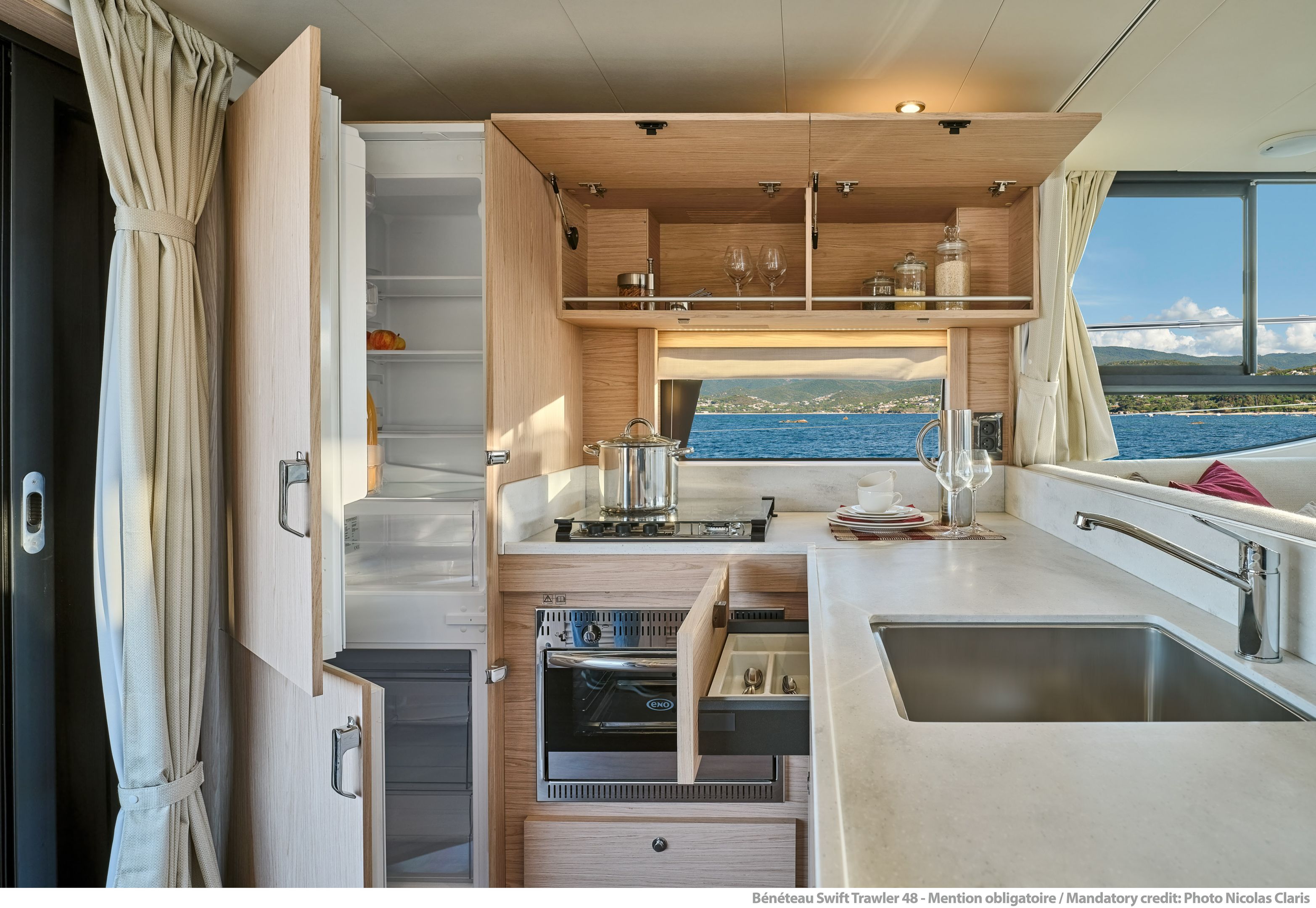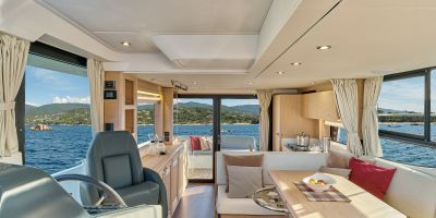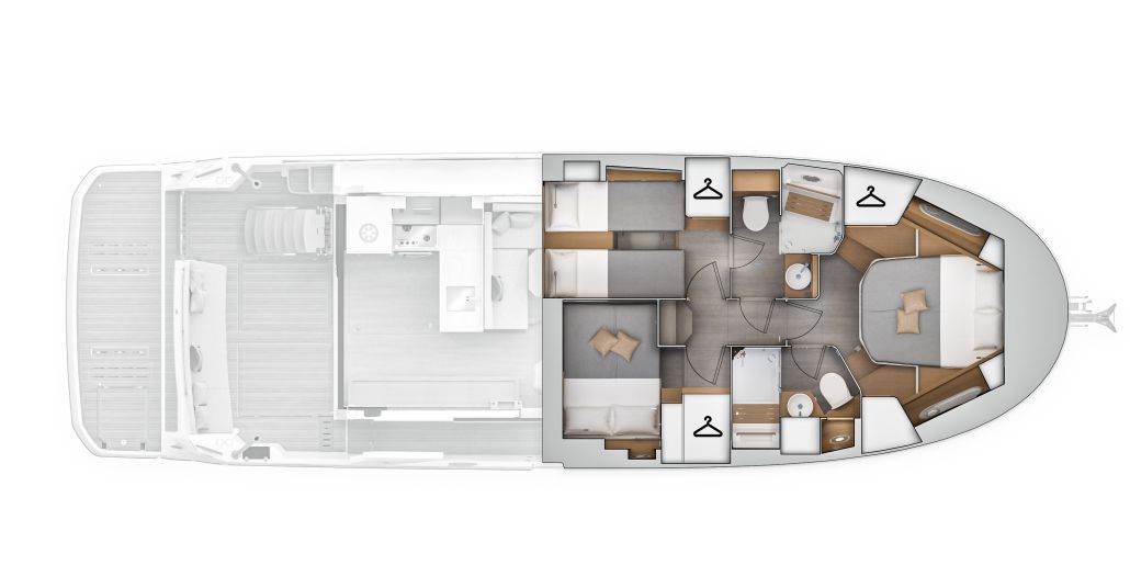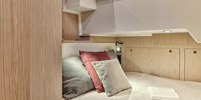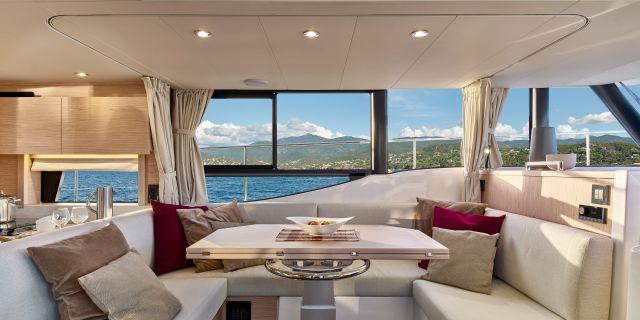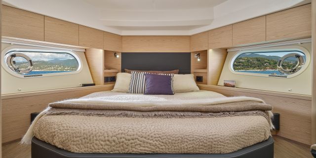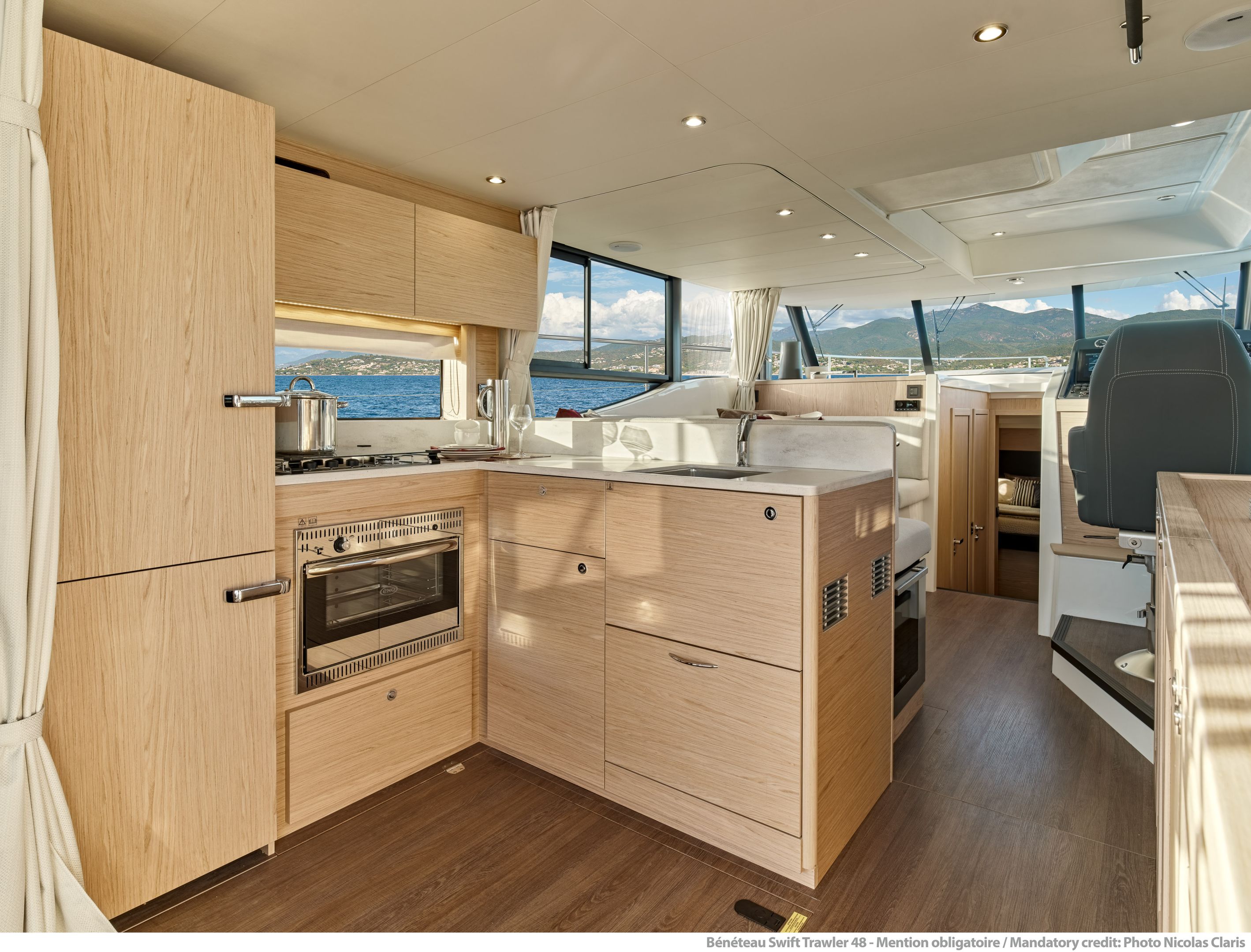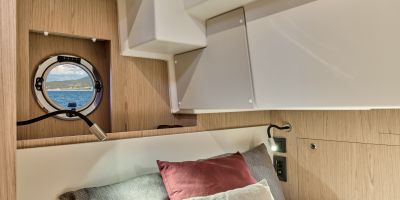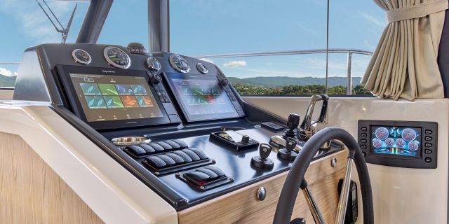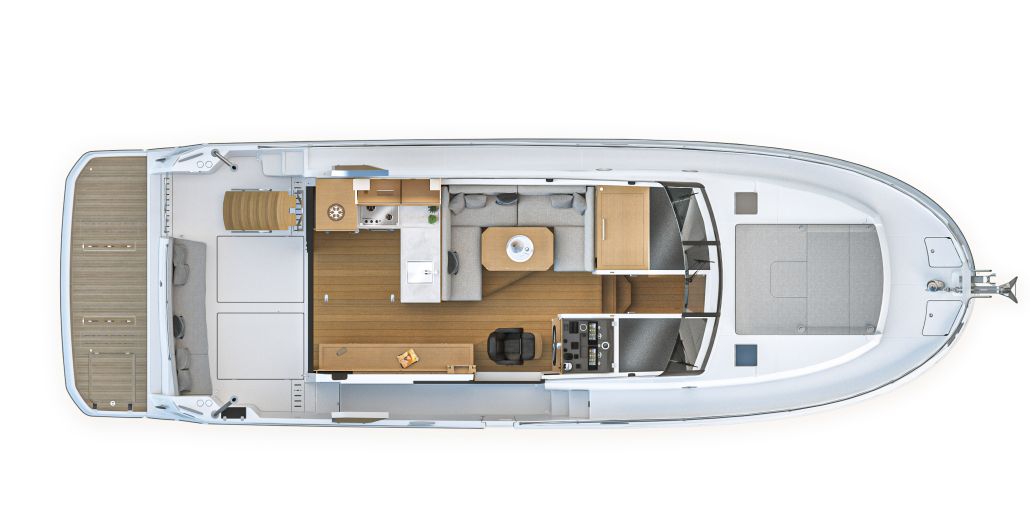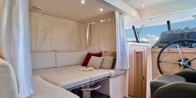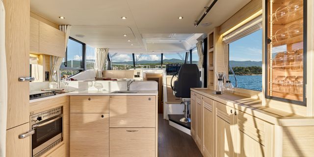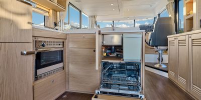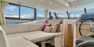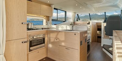 Inside, the forward owner’s cabin has a walkaround berth, hanging lockers, and en-suite head with separate shower. Midship port cabin offers convertible twins; starboard bunk sits under the helm. Galley runs port with Corian countertops, stove, and fridge opposite a U-dinette that drops to a berth. Hull windows keep it bright.