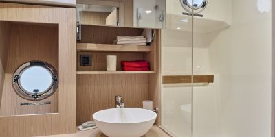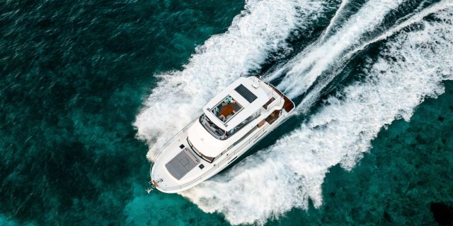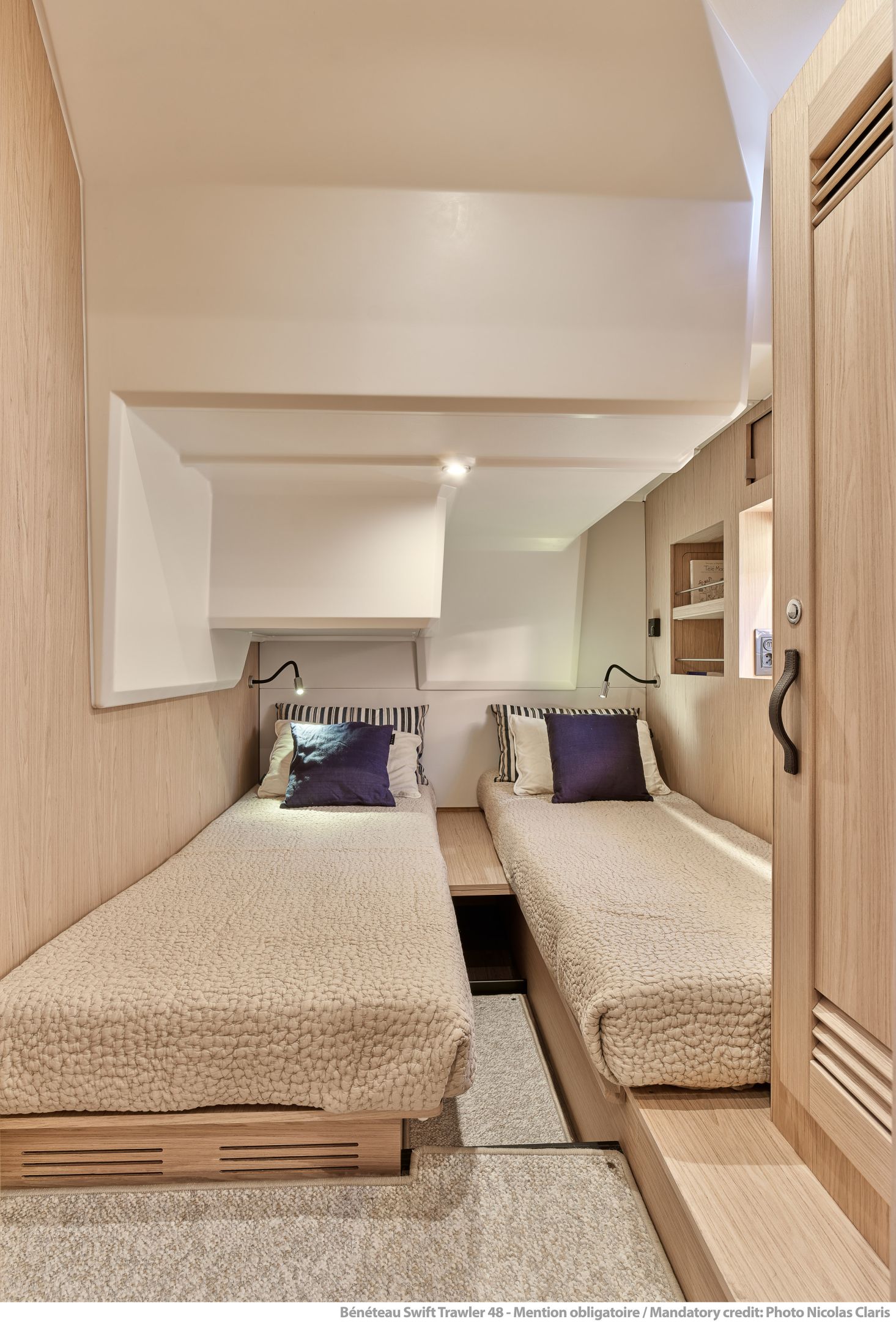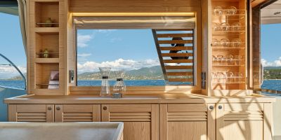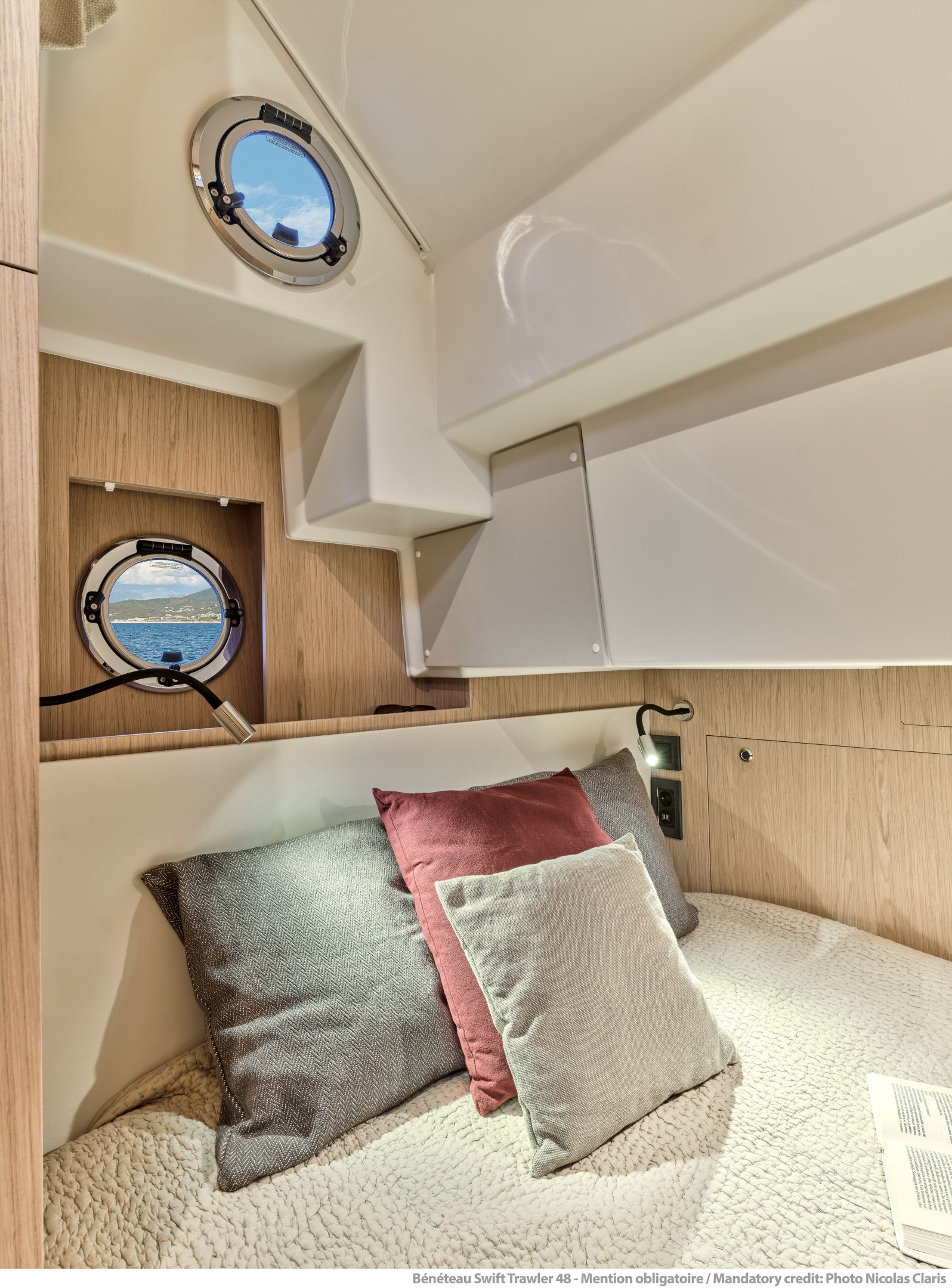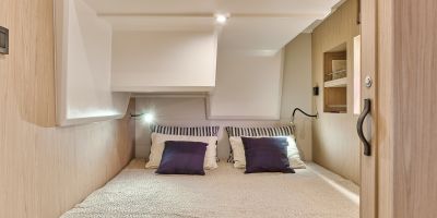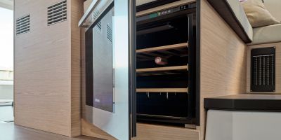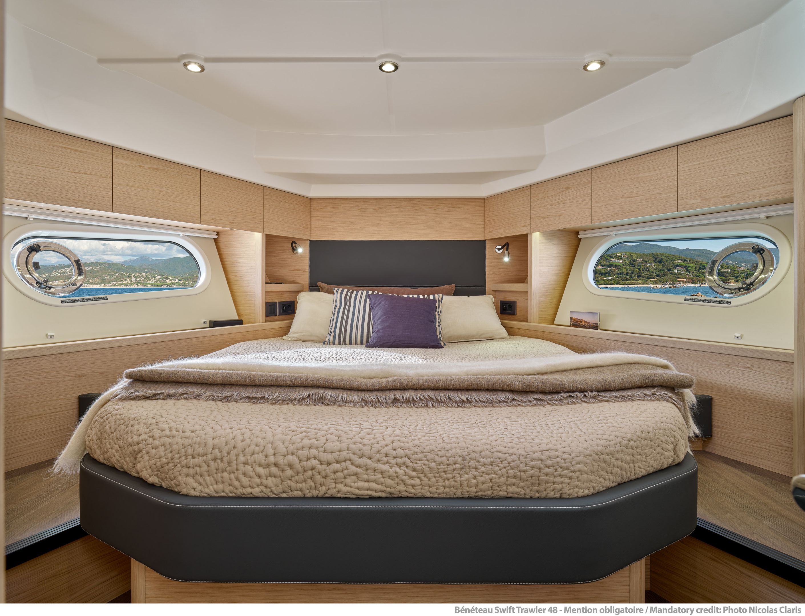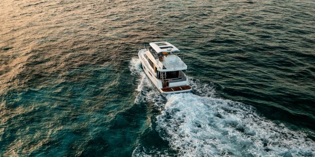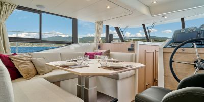 Inside, the forward owner’s cabin has a walkaround berth, hanging lockers, and en-suite head with separate shower. Midship port cabin offers convertible twins; starboard bunk sits under the helm. Galley runs port with Corian countertops, stove, and fridge opposite a U-dinette that drops to a berth. Hull windows keep it bright.