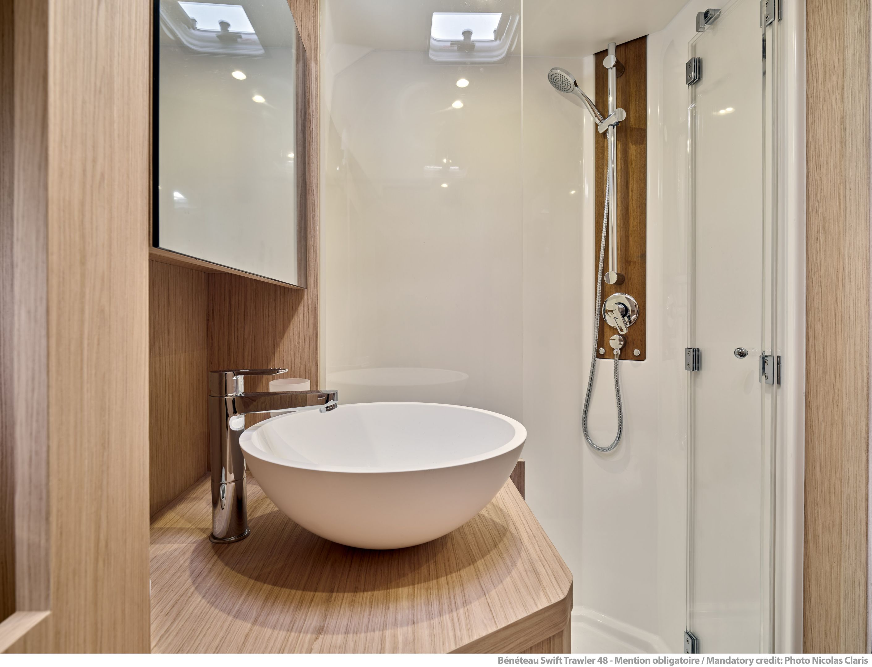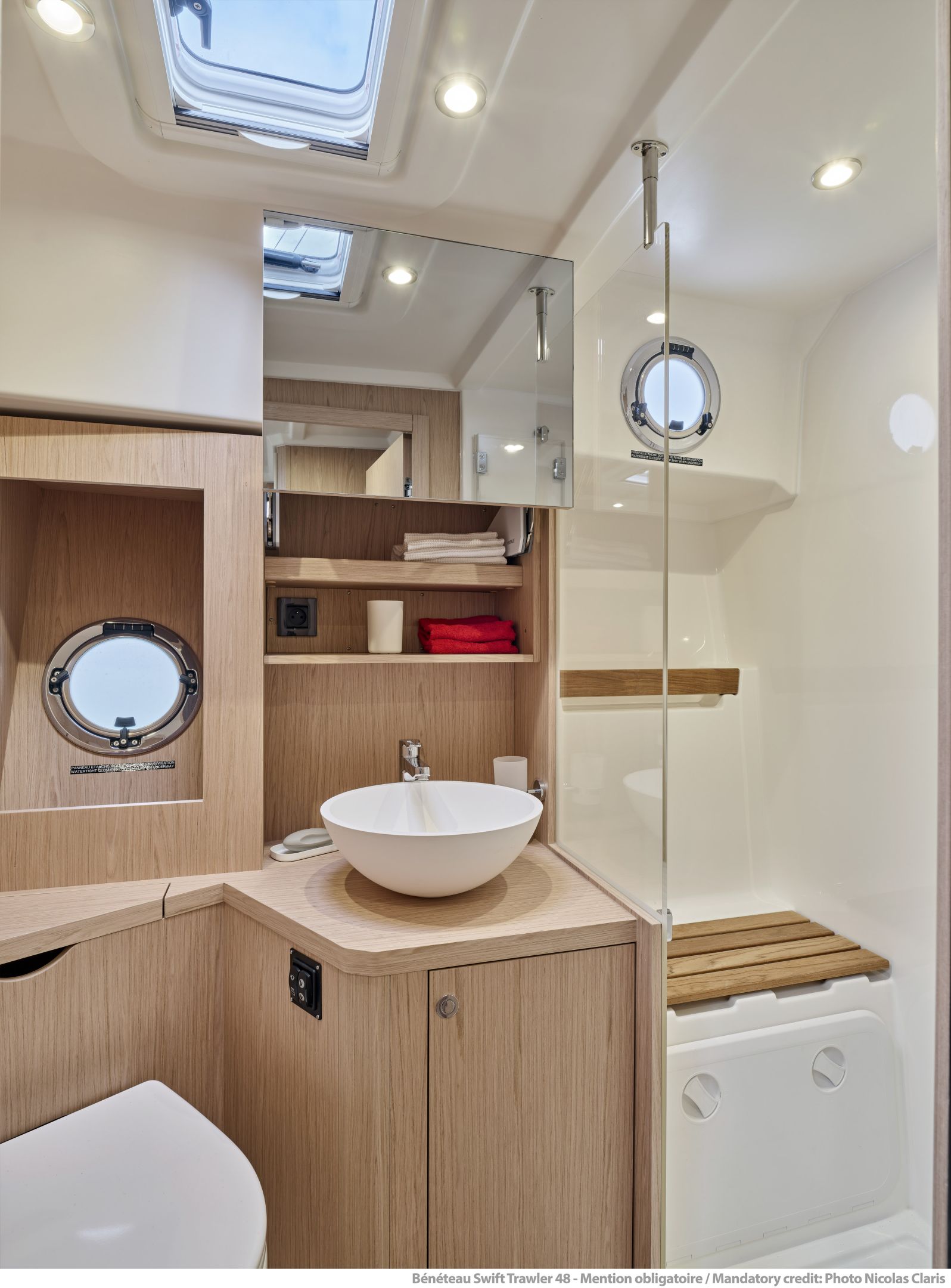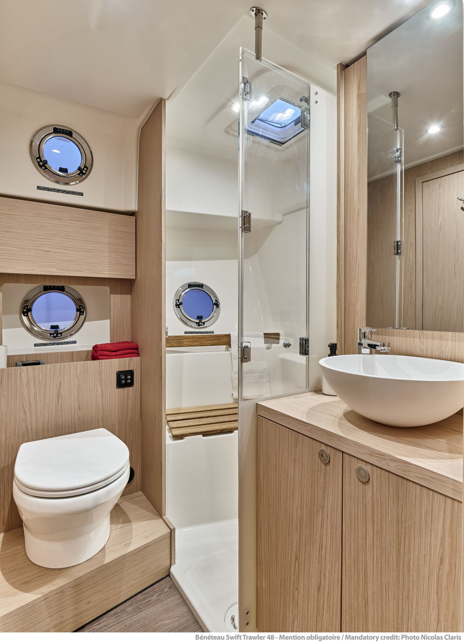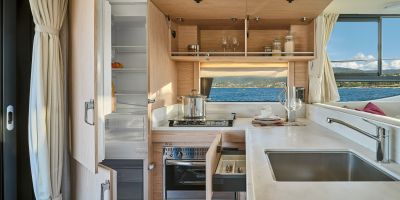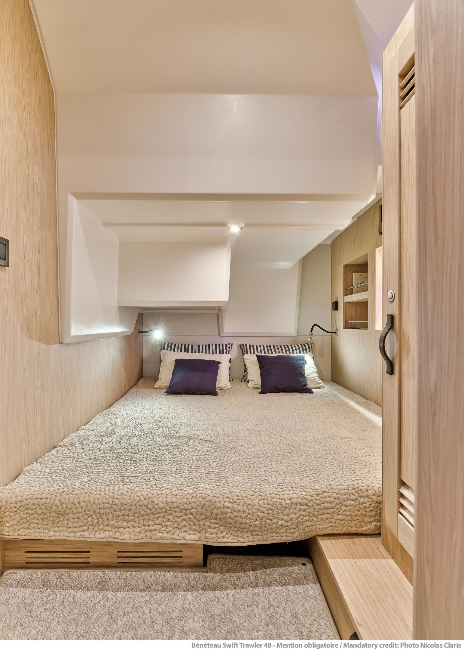 Inside, the forward owner’s cabin has a walkaround berth, hanging lockers, and en-suite head with separate shower. Midship port cabin offers convertible twins; starboard bunk sits under the helm. Galley runs port with Corian countertops, stove, and fridge opposite a U-dinette that drops to a berth. Hull windows keep it bright.