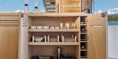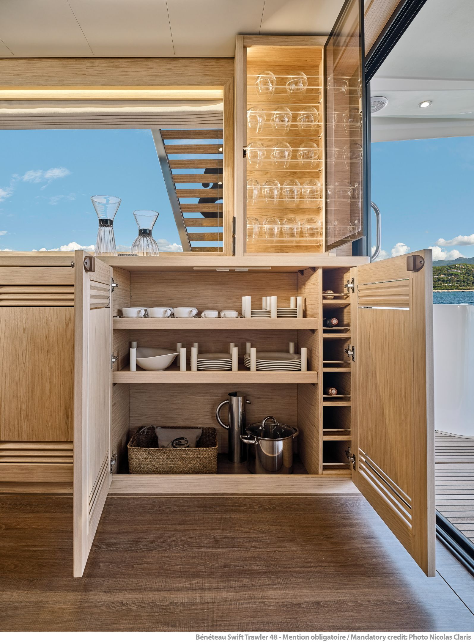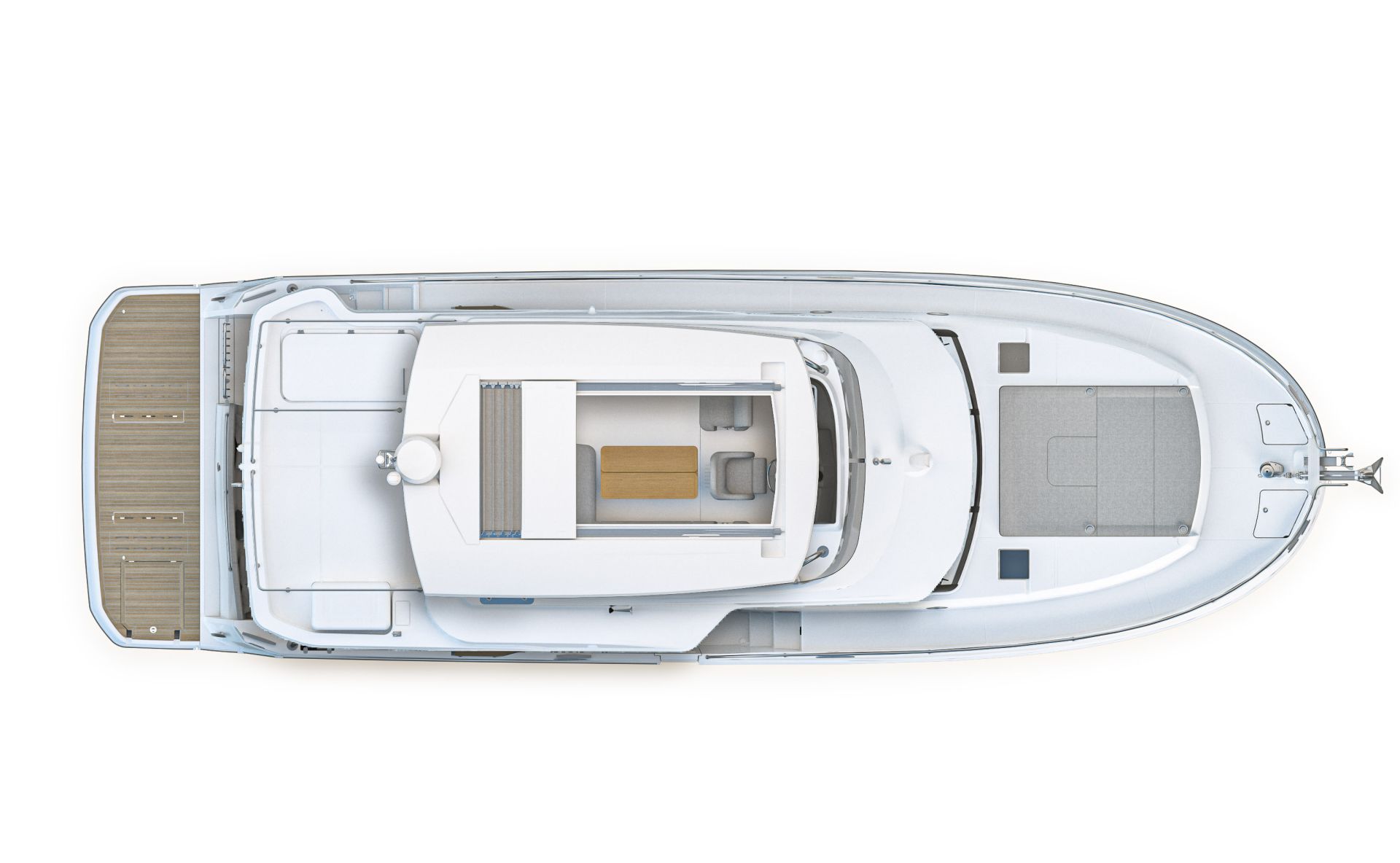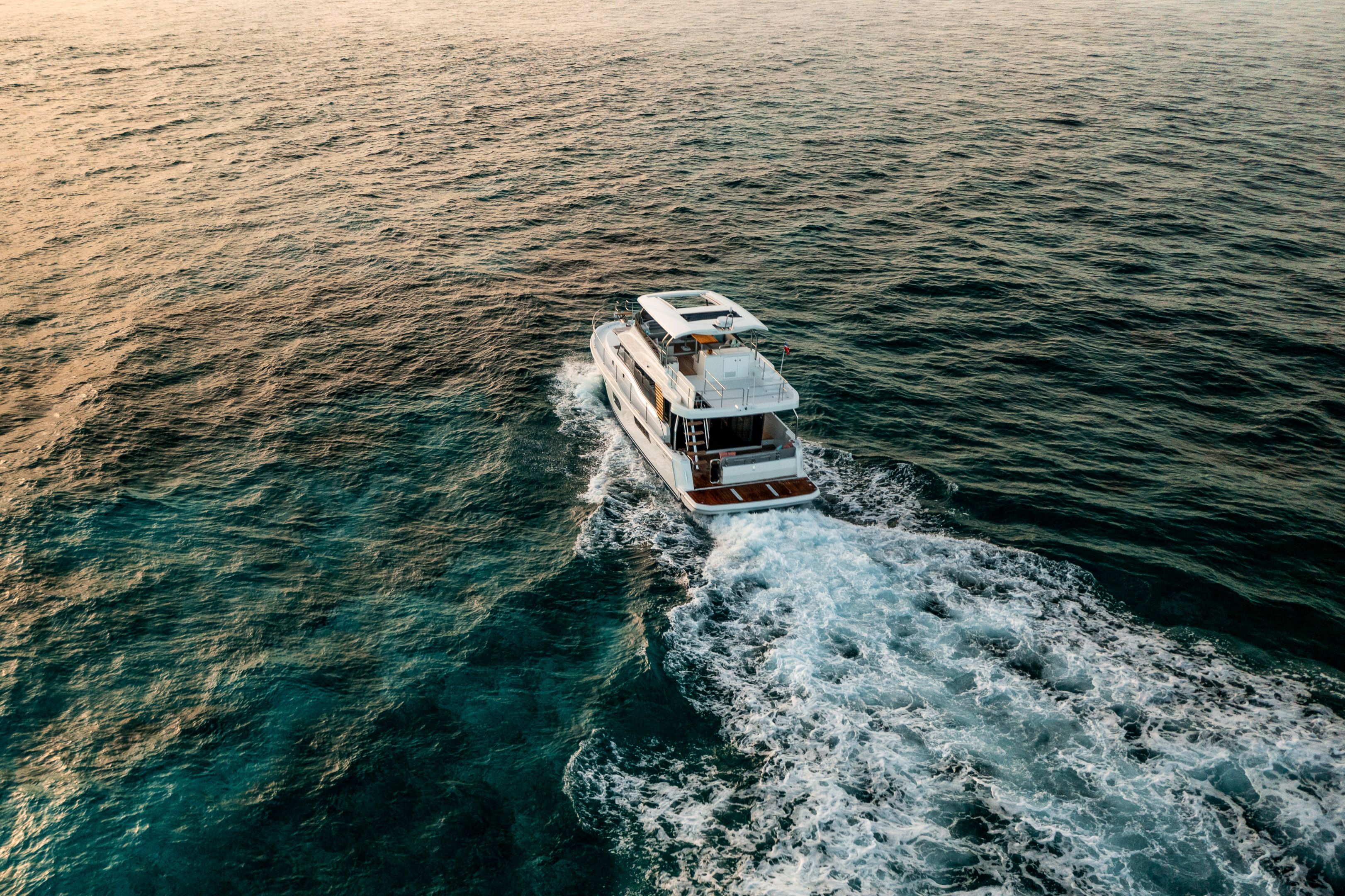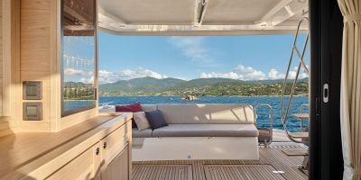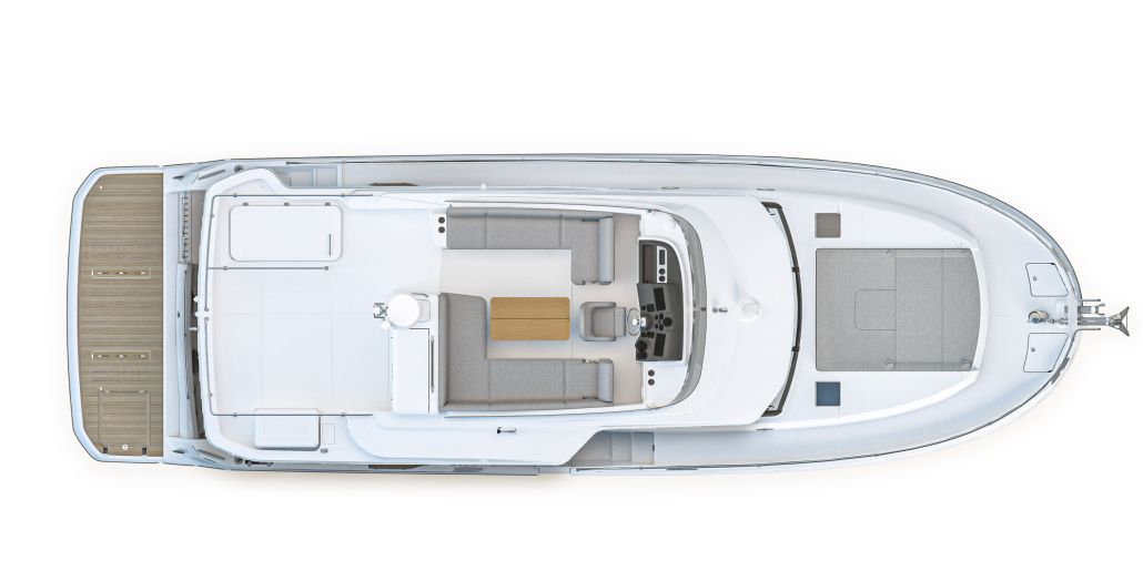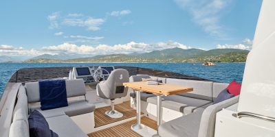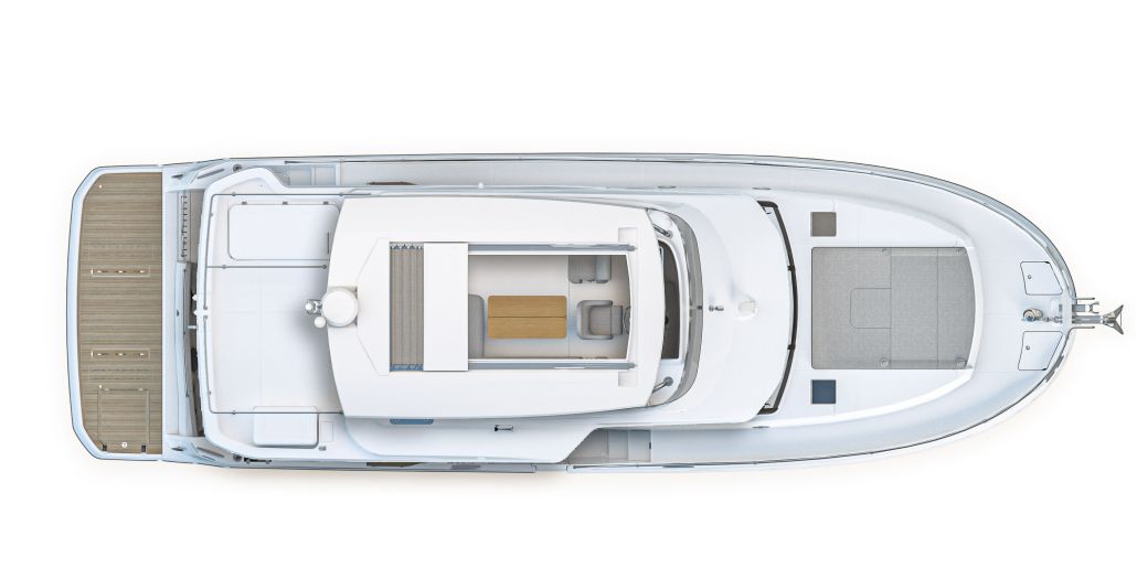 Flybridge has an L-settee, teak table, and helm with dual screens; wet bar includes sink, fridge, and optional grill under bimini or hard top. Cockpit mirrors with fold-leaf table and sliding bench to open transom; hydraulic platform lowers for tender or swim. Wide side decks and starboard door allow direct dock access.
