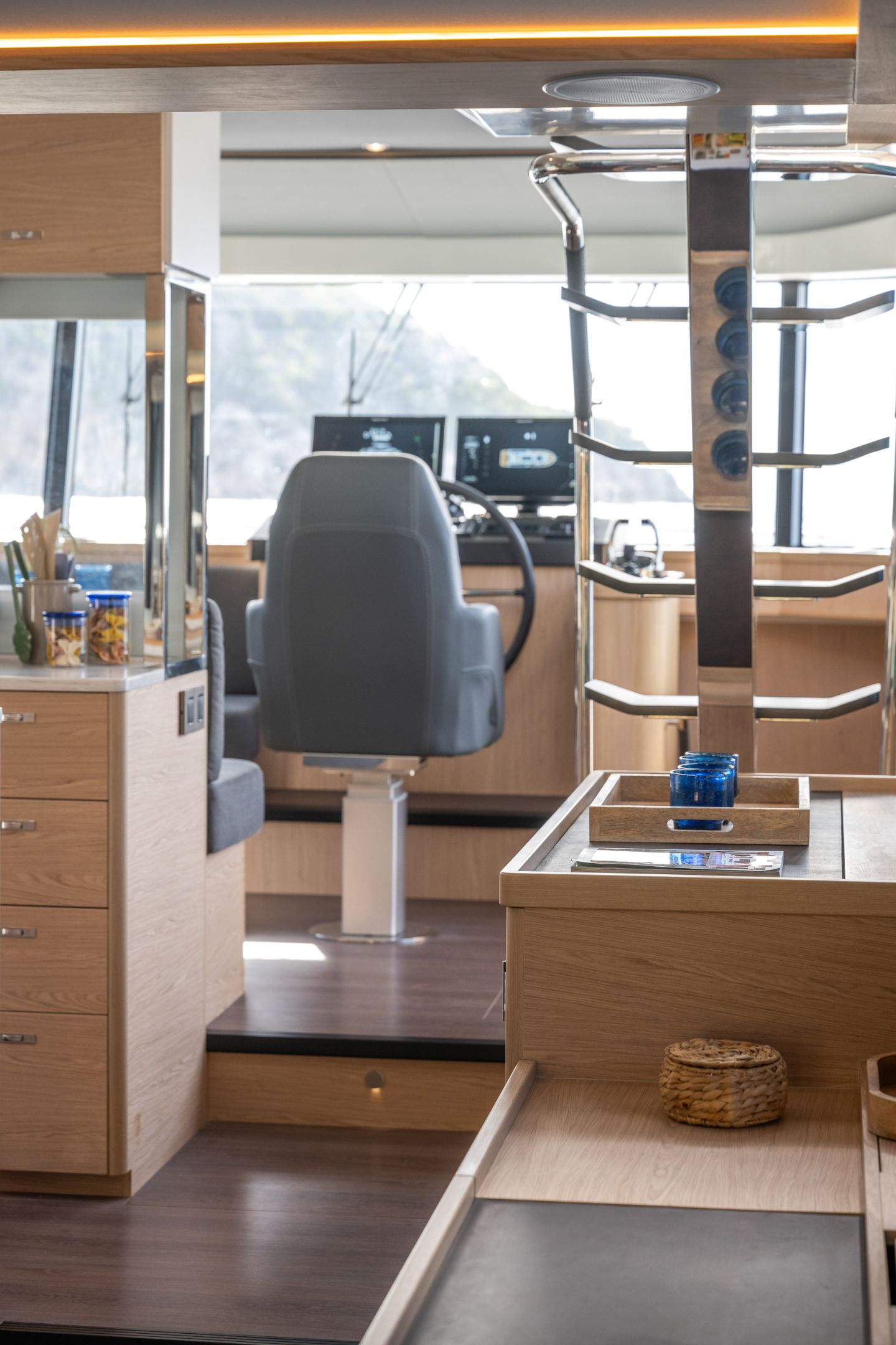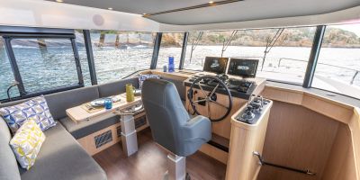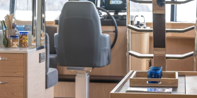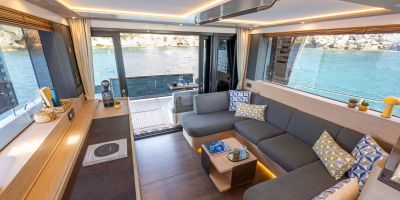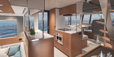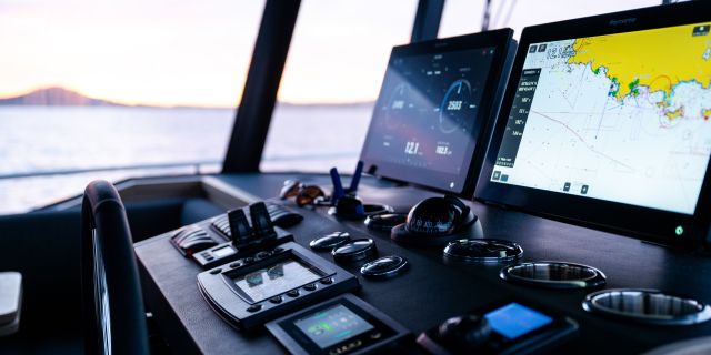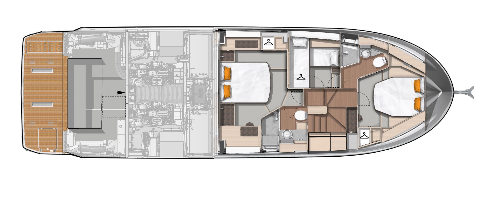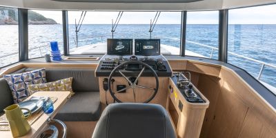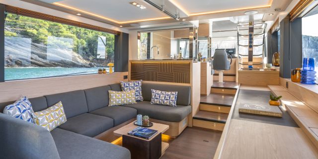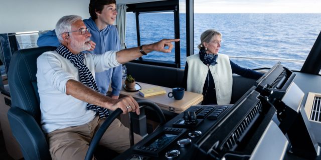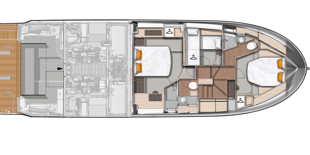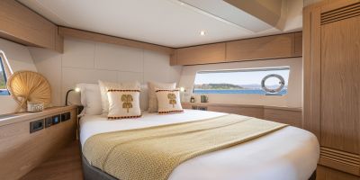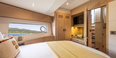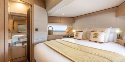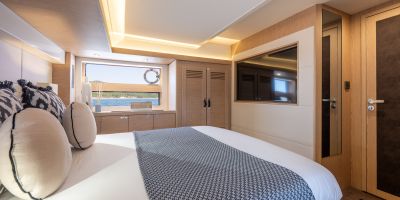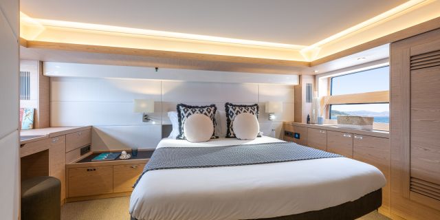 The main deck features a central galley and raised pilothouse. In the galley you'll find dual sinks, convection oven, and side-by-side fridge-freezer feeds a full crew, steps from the L-shaped saloon dinette that overlooks the bow through wraparound glass. Owner's suite aft spans the beam with island berth, walk-in locker, and his-and-hers vanities feeding a stall-shower head with rain fixture. Twin VIPs forward - one double, one perpendicular bunks - share a guest head.