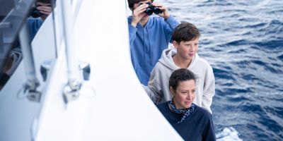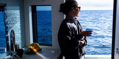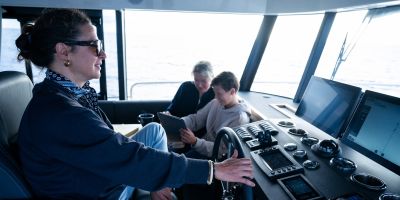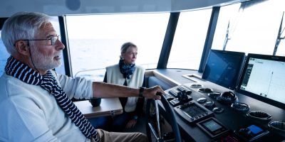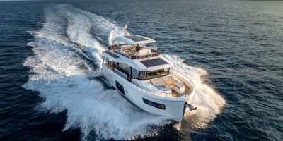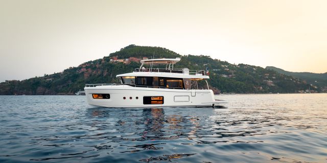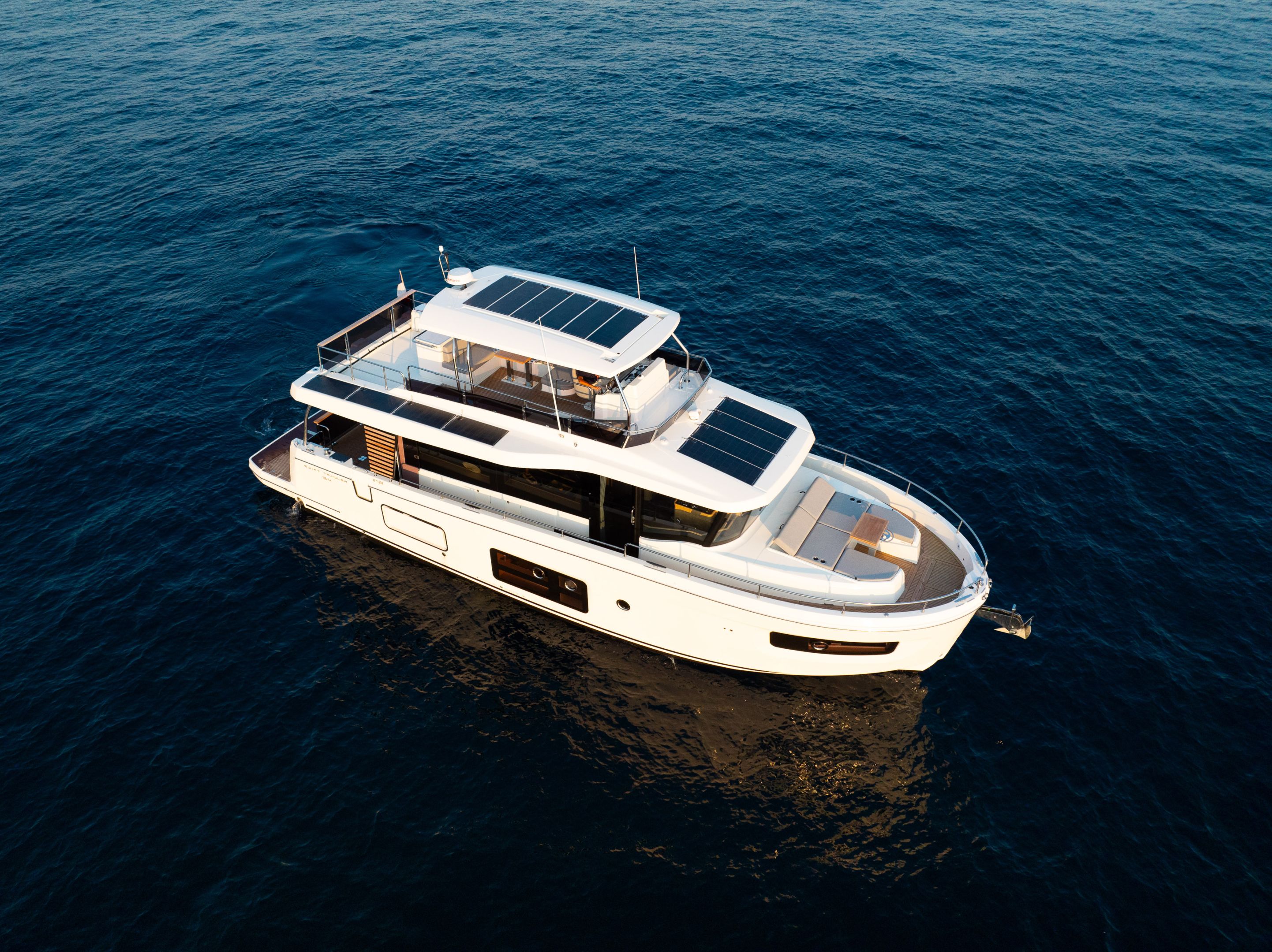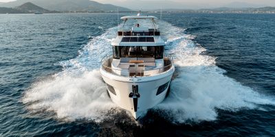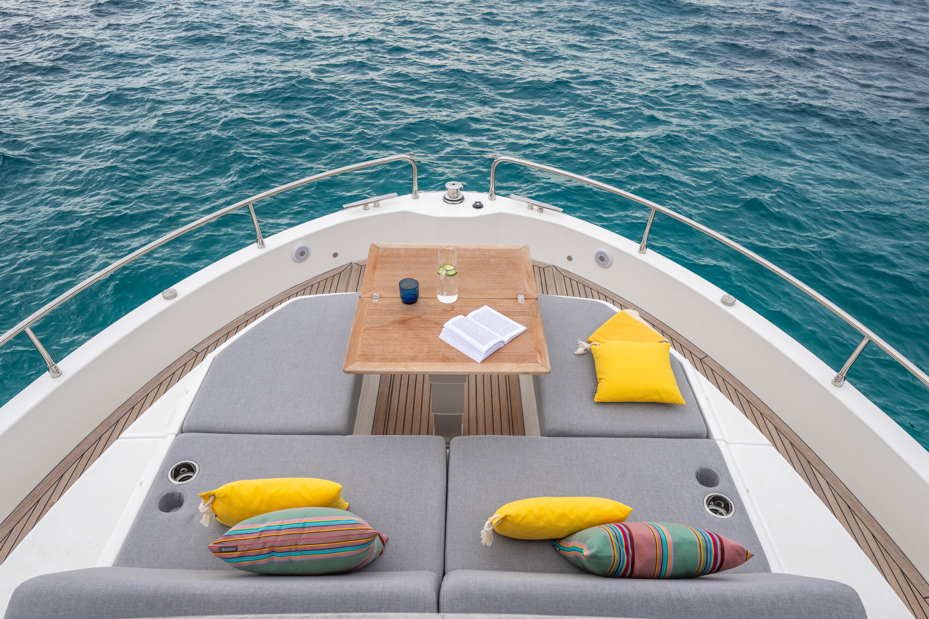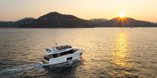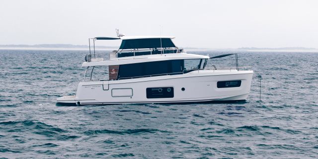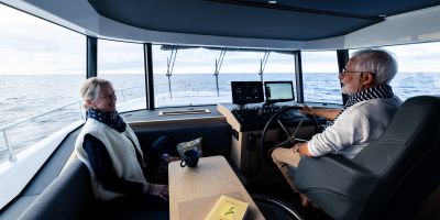 The main deck features a central galley and raised pilothouse. In the galley you'll find dual sinks, convection oven, and side-by-side fridge-freezer feeds a full crew, steps from the L-shaped saloon dinette that overlooks the bow through wraparound glass. Owner's suite aft spans the beam with island berth, walk-in locker, and his-and-hers vanities feeding a stall-shower head with rain fixture. Twin VIPs forward - one double, one perpendicular bunks - share a guest head.