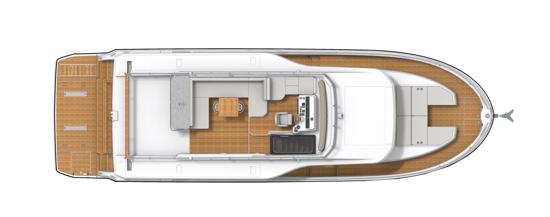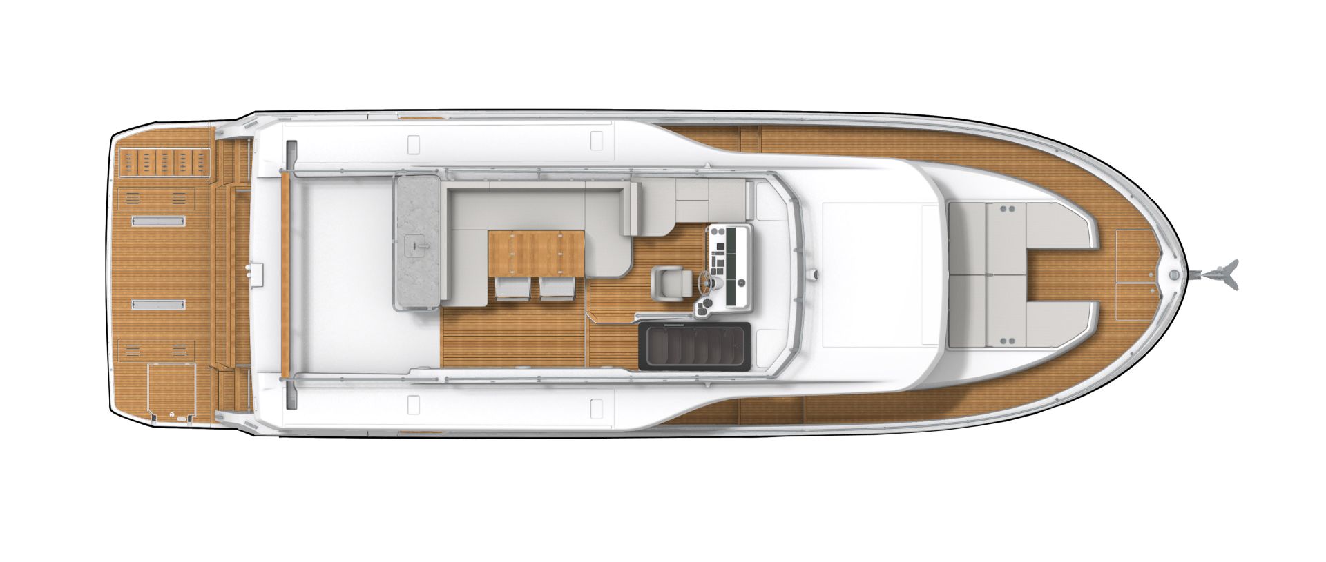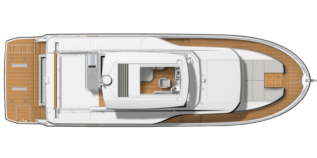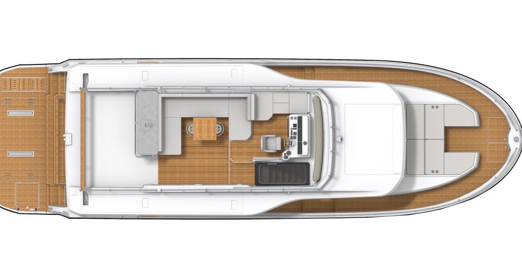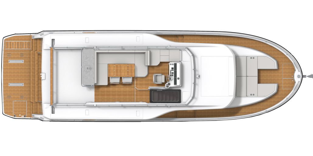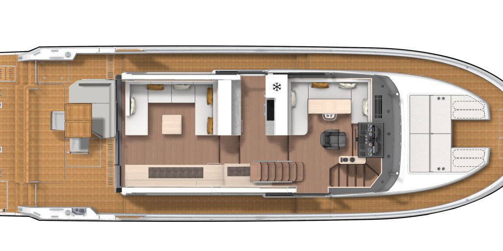 The flybridge turns any outing into a rooftop retreat: wraparound settee and teak pedestal table seat a crowd for the colors ceremony at Roche Harbor, with a full wet bar - grill, icemaker, and fridge at arm's reach - keeping the flow going as the hard top shades the helm's triple-screen dash. Cockpit below opens wide with L-benches that slide to match the mood, and the hydraulic platform drops low to cradle a 882 lbs. tender, while the fold-forward lazarette lid reveals cross-beam racks for kayaks and boards - launch straight into the water without hauling gear over rails.