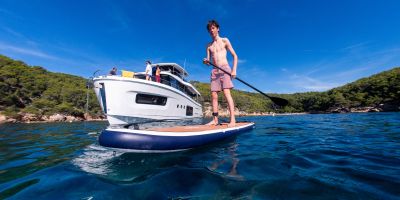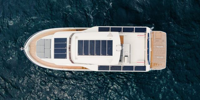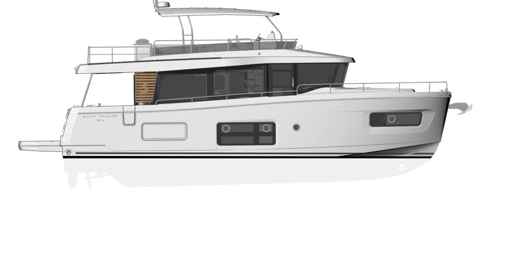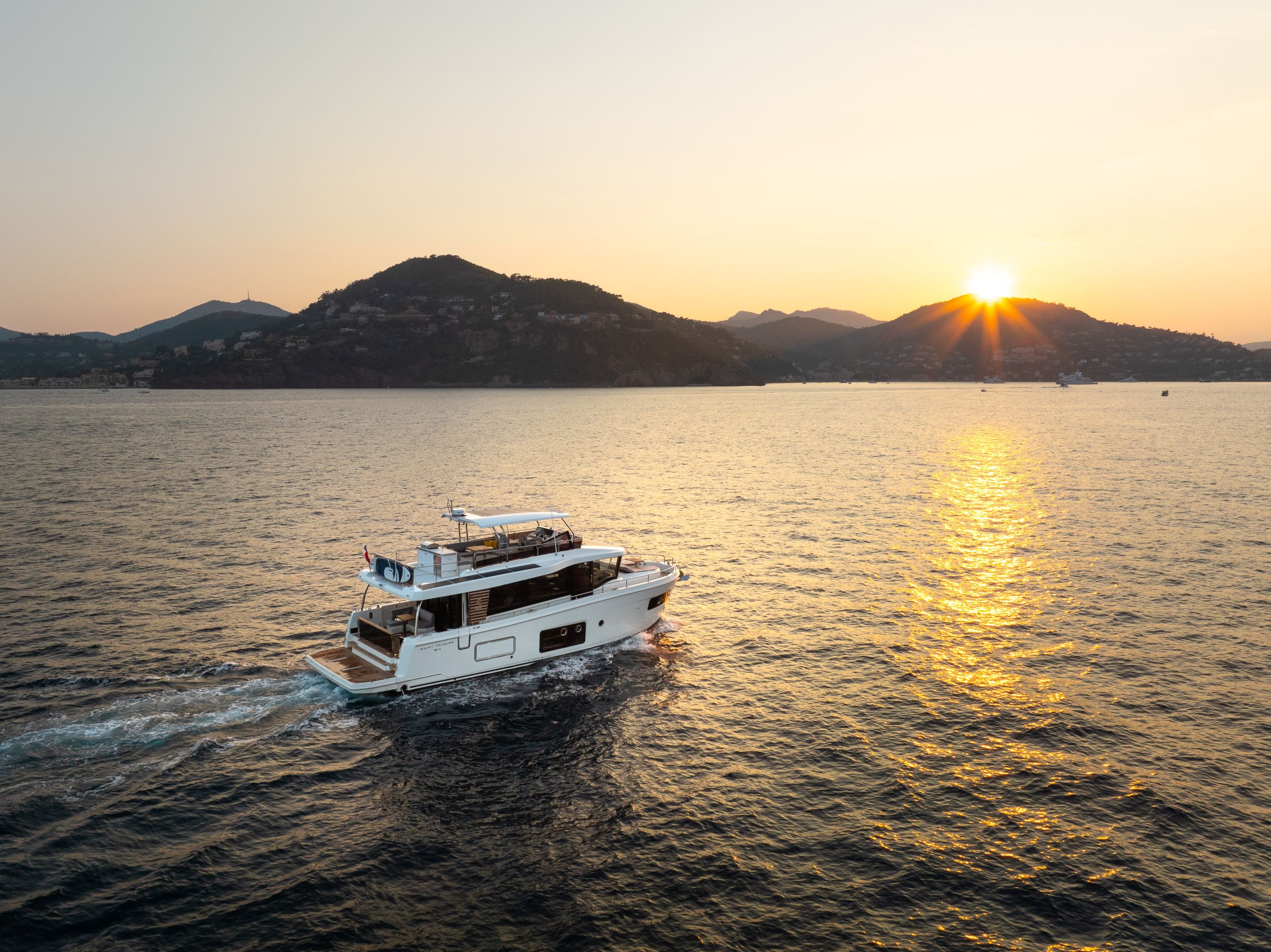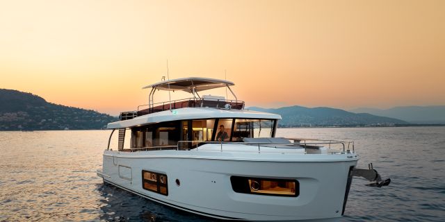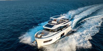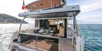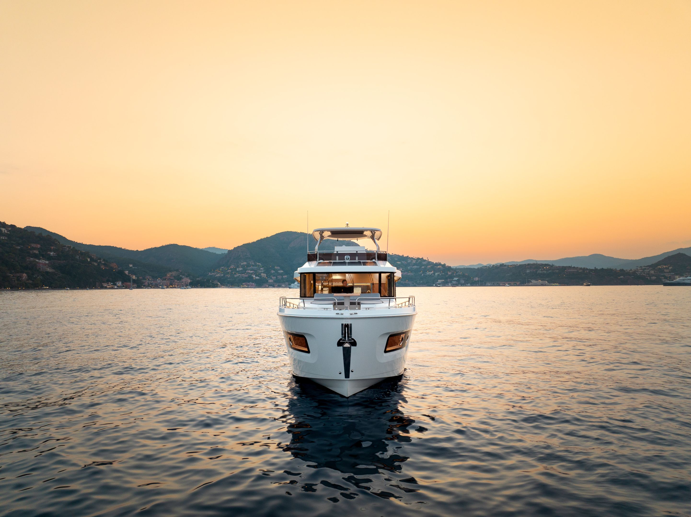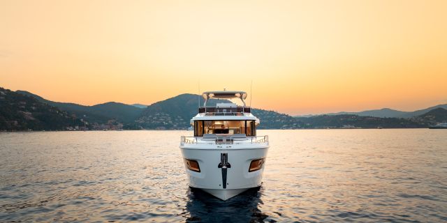 The flybridge turns any outing into a rooftop retreat: wraparound settee and teak pedestal table seat a crowd for the colors ceremony at Roche Harbor, with a full wet bar - grill, icemaker, and fridge at arm's reach - keeping the flow going as the hard top shades the helm's triple-screen dash. Cockpit below opens wide with L-benches that slide to match the mood, and the hydraulic platform drops low to cradle a 882 lbs. tender, while the fold-forward lazarette lid reveals cross-beam racks for kayaks and boards - launch straight into the water without hauling gear over rails.