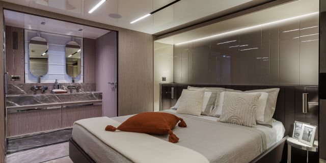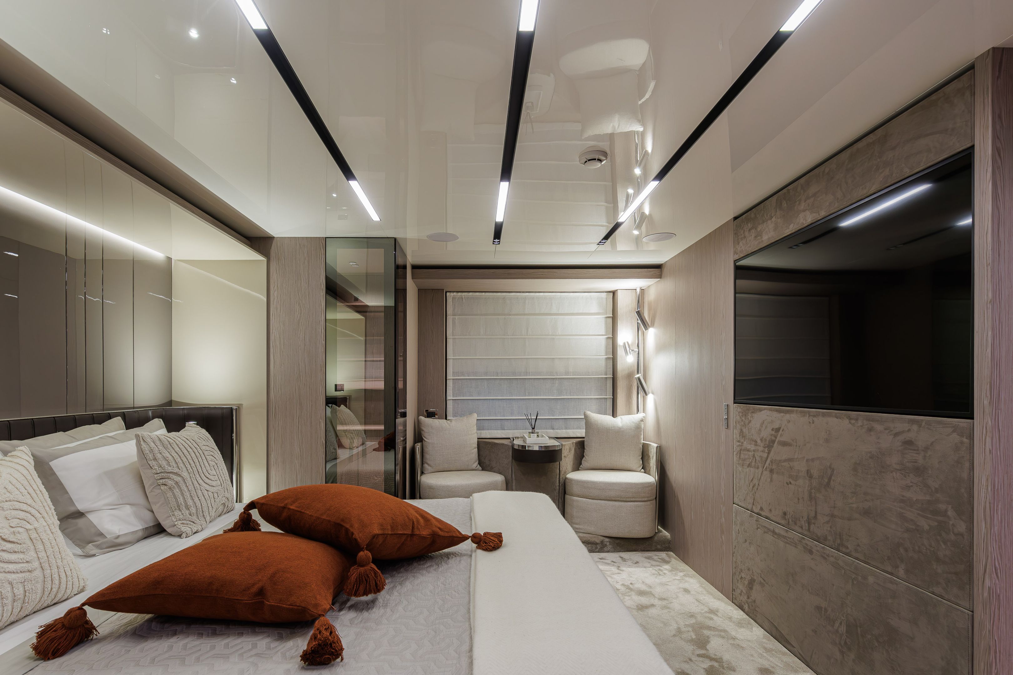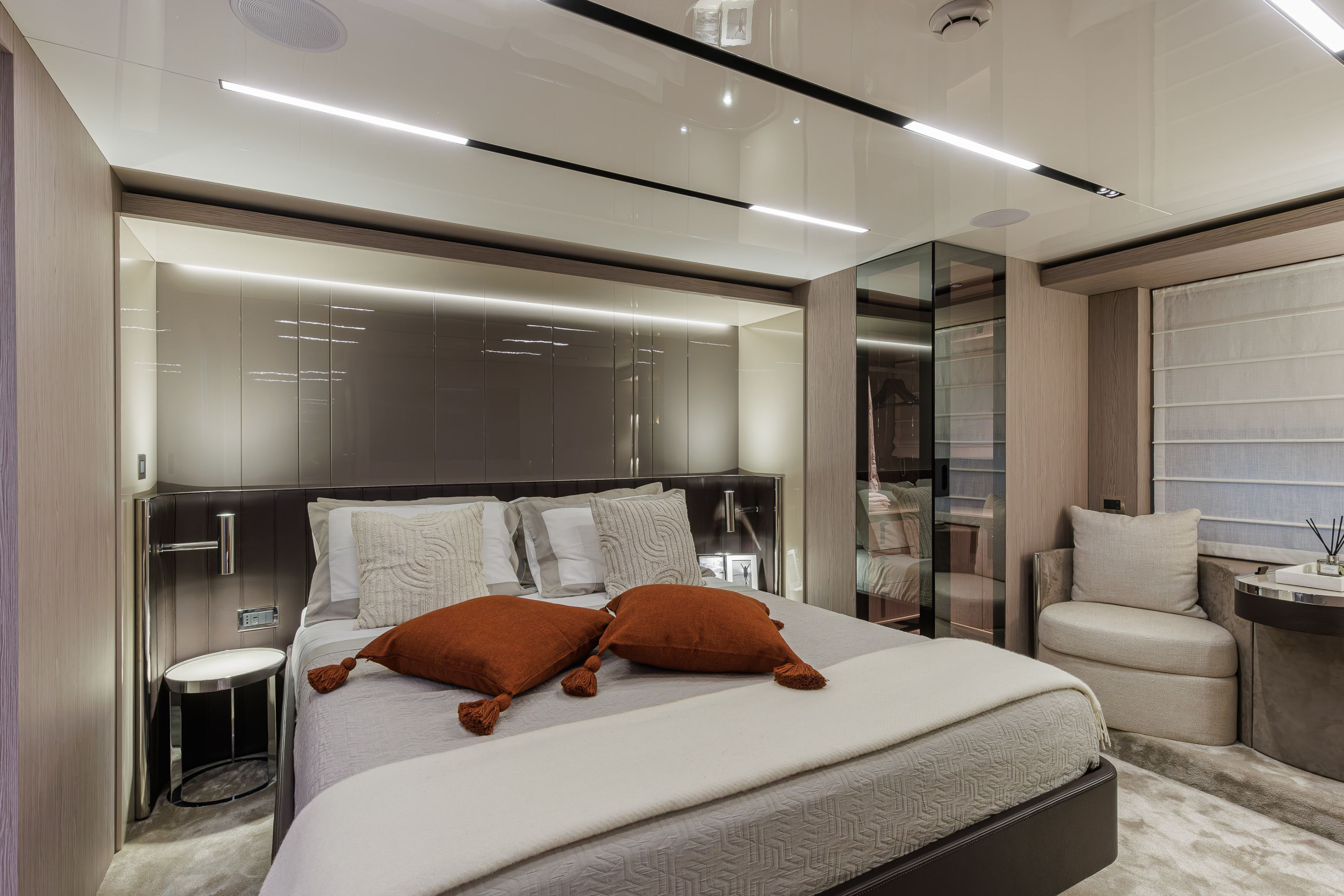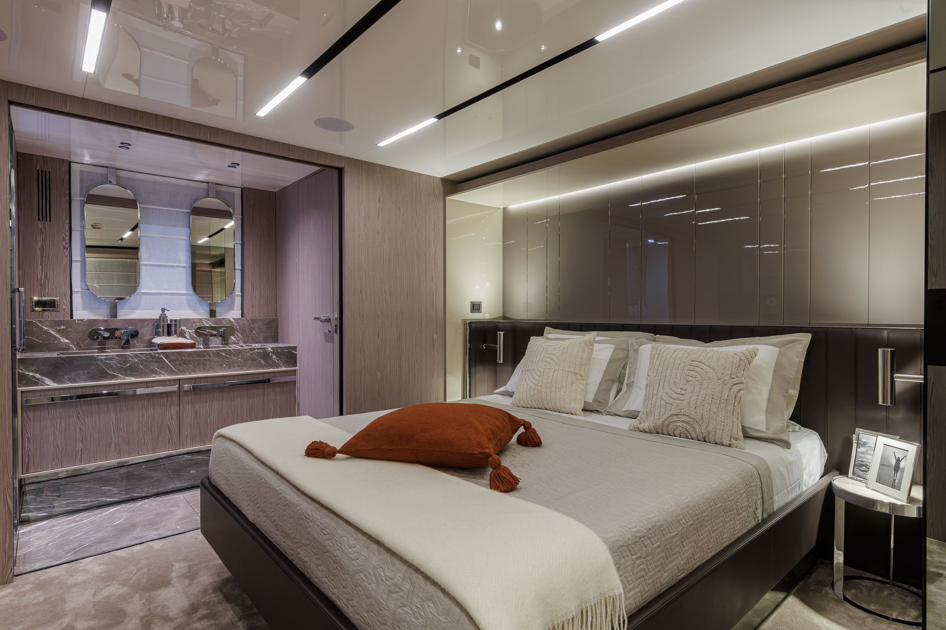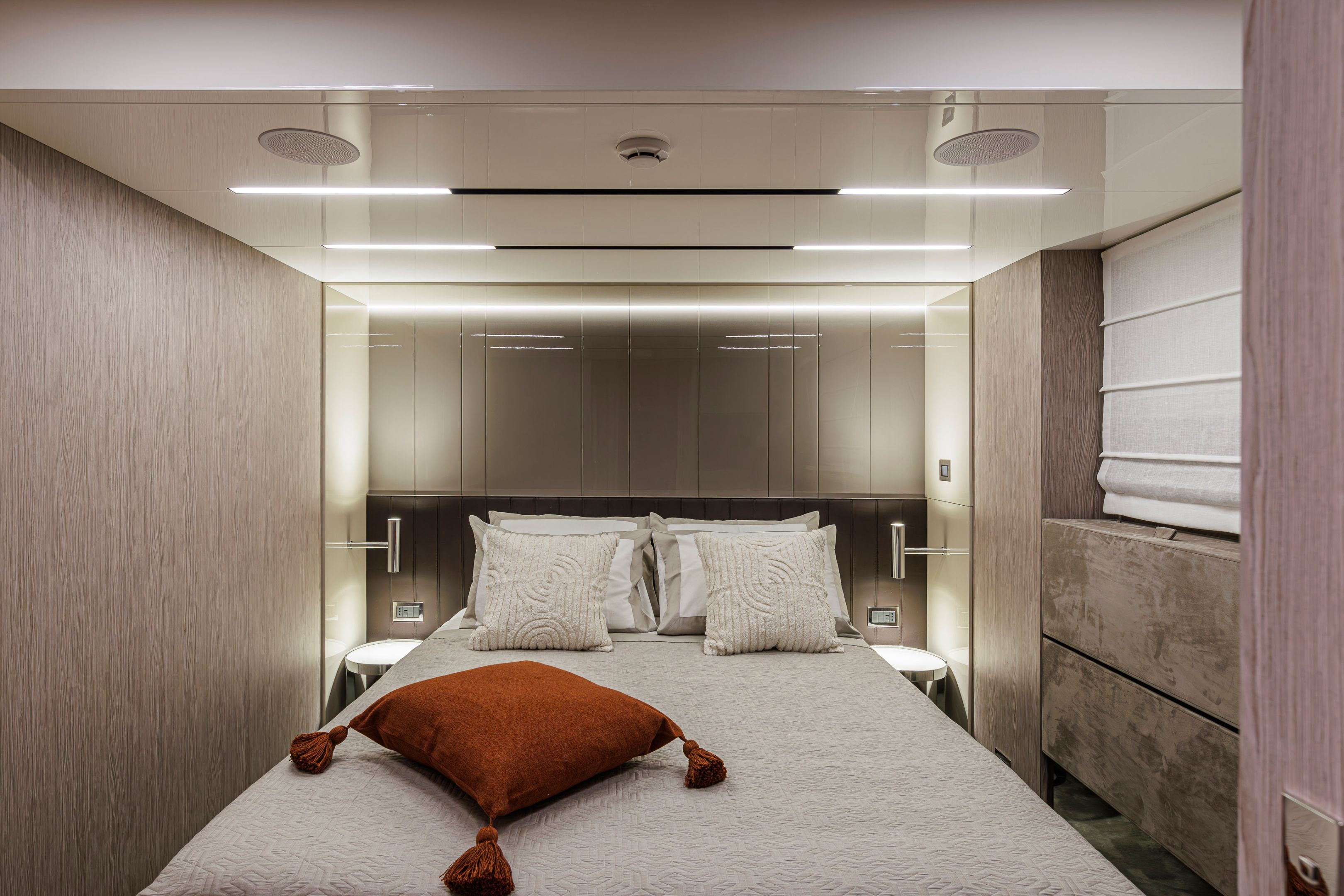 Christian Grande’s masterful design refines Aldo Cranchi’s hull into a fluid sanctuary—expansive glass doors blend saloon with an oversized cockpit, prioritized for seamless indoor/outdoor entertaining, anchored by a sleek galley with artisan stone counters. The 17-foot beam shapes a forward owner’s suite with handcrafted walnut cabinetry, a spa-grade ensuite, and wide hull windows framing ocean vistas. Every teak plank and leather stitch reflects Italian artistry built to endure.