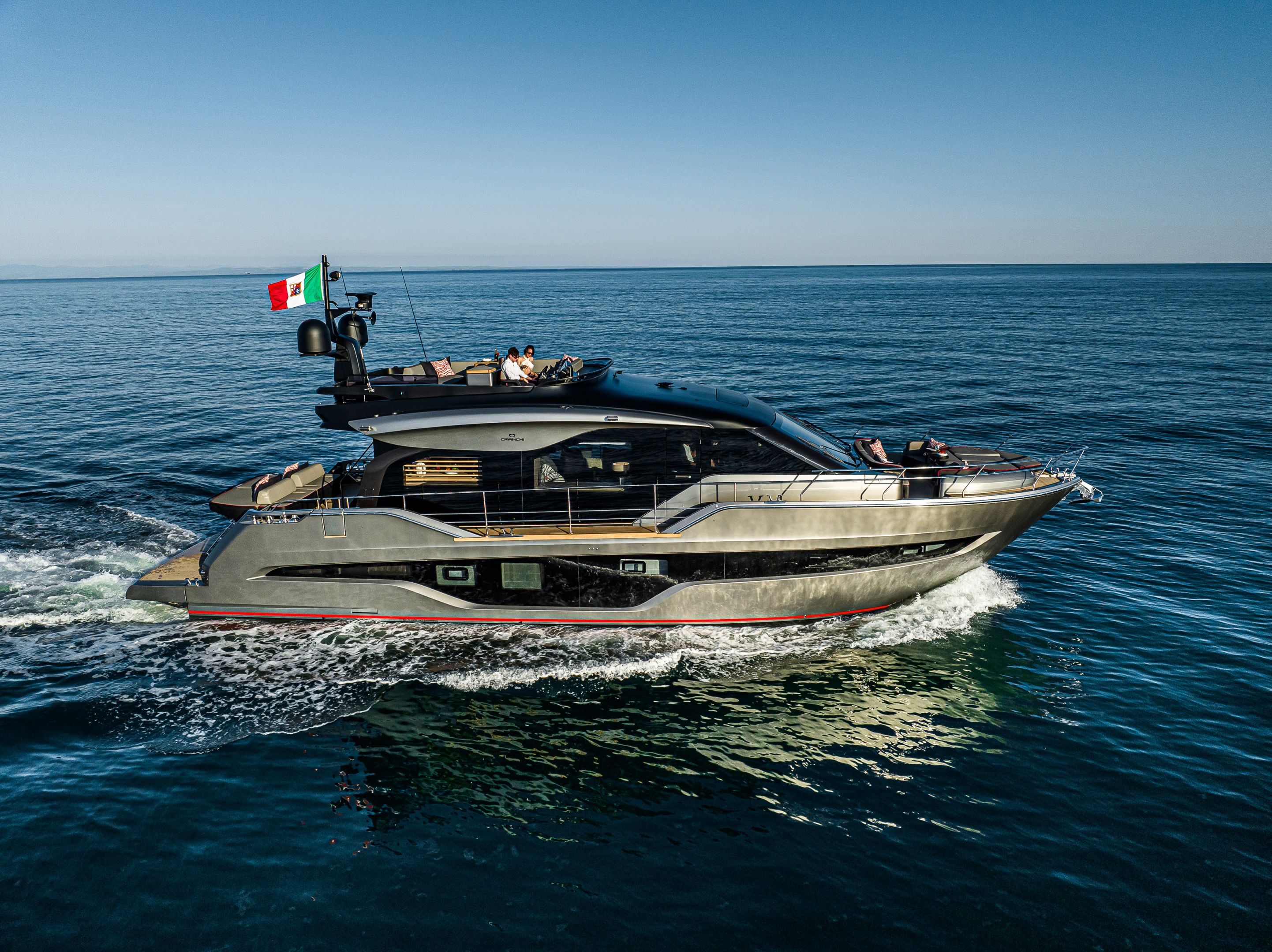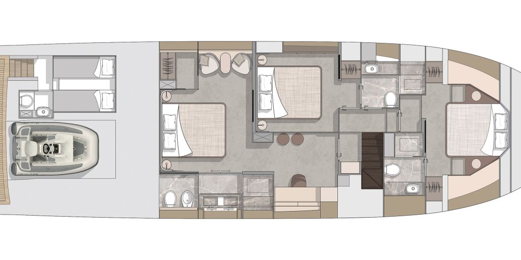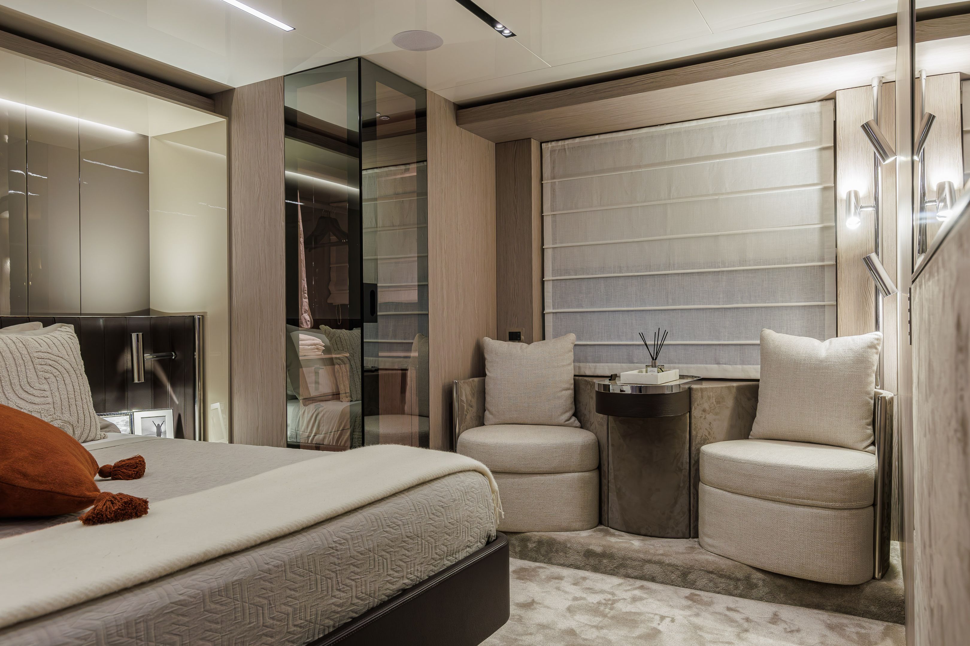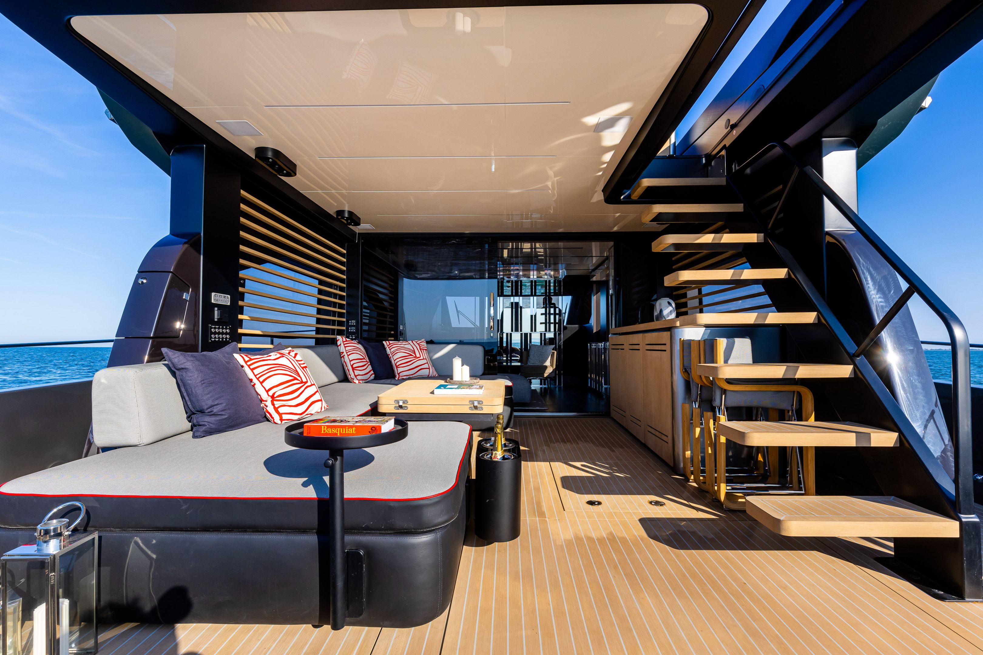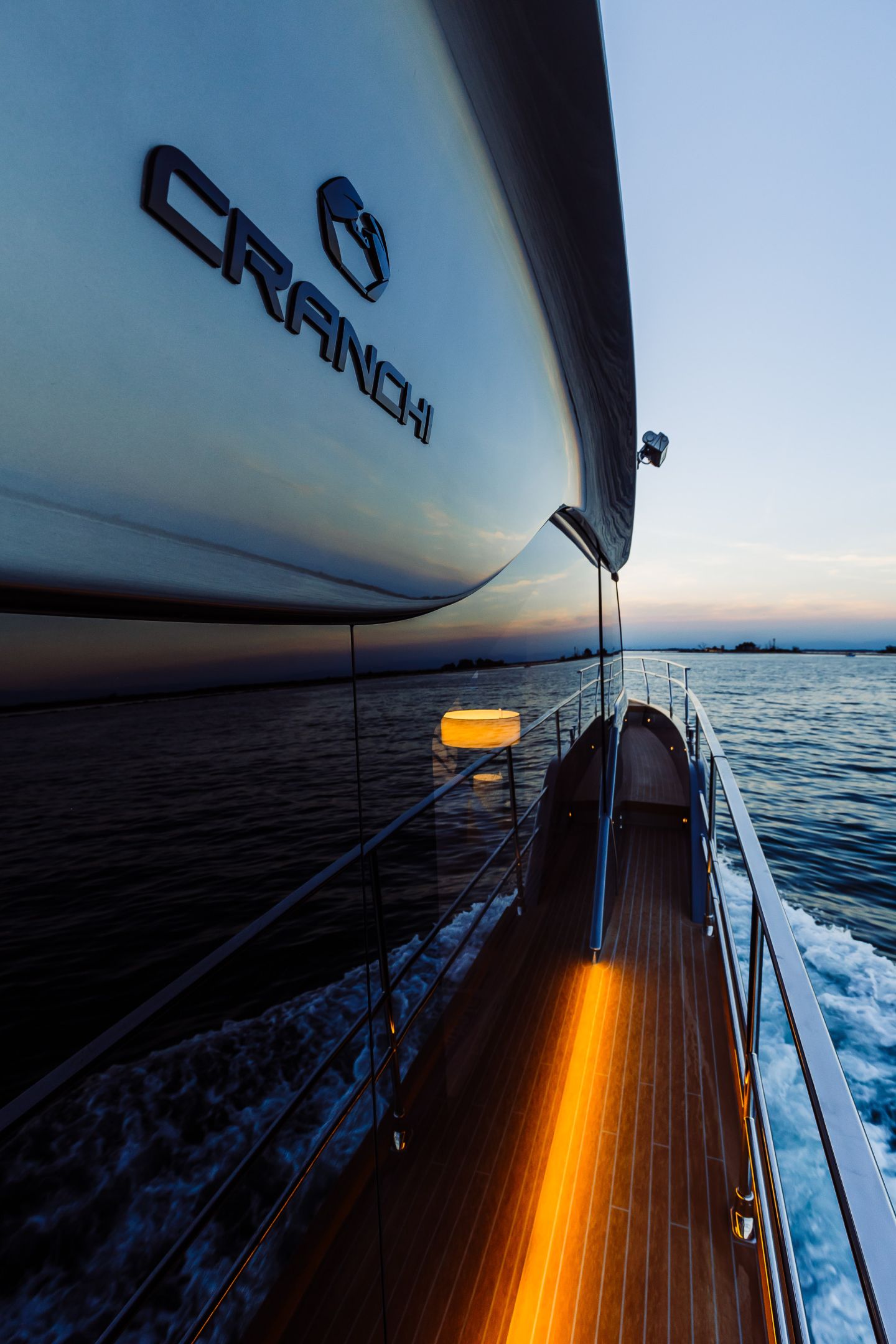 Christian Grande’s masterful design refines Aldo Cranchi’s hull into a fluid sanctuary—expansive glass doors blend saloon with an oversized cockpit, prioritized for seamless indoor/outdoor entertaining, anchored by a sleek galley with artisan stone counters. The 17-foot beam shapes a forward owner’s suite with handcrafted walnut cabinetry, a spa-grade ensuite, and wide hull windows framing ocean vistas. Every teak plank and leather stitch reflects Italian artistry built to endure.
