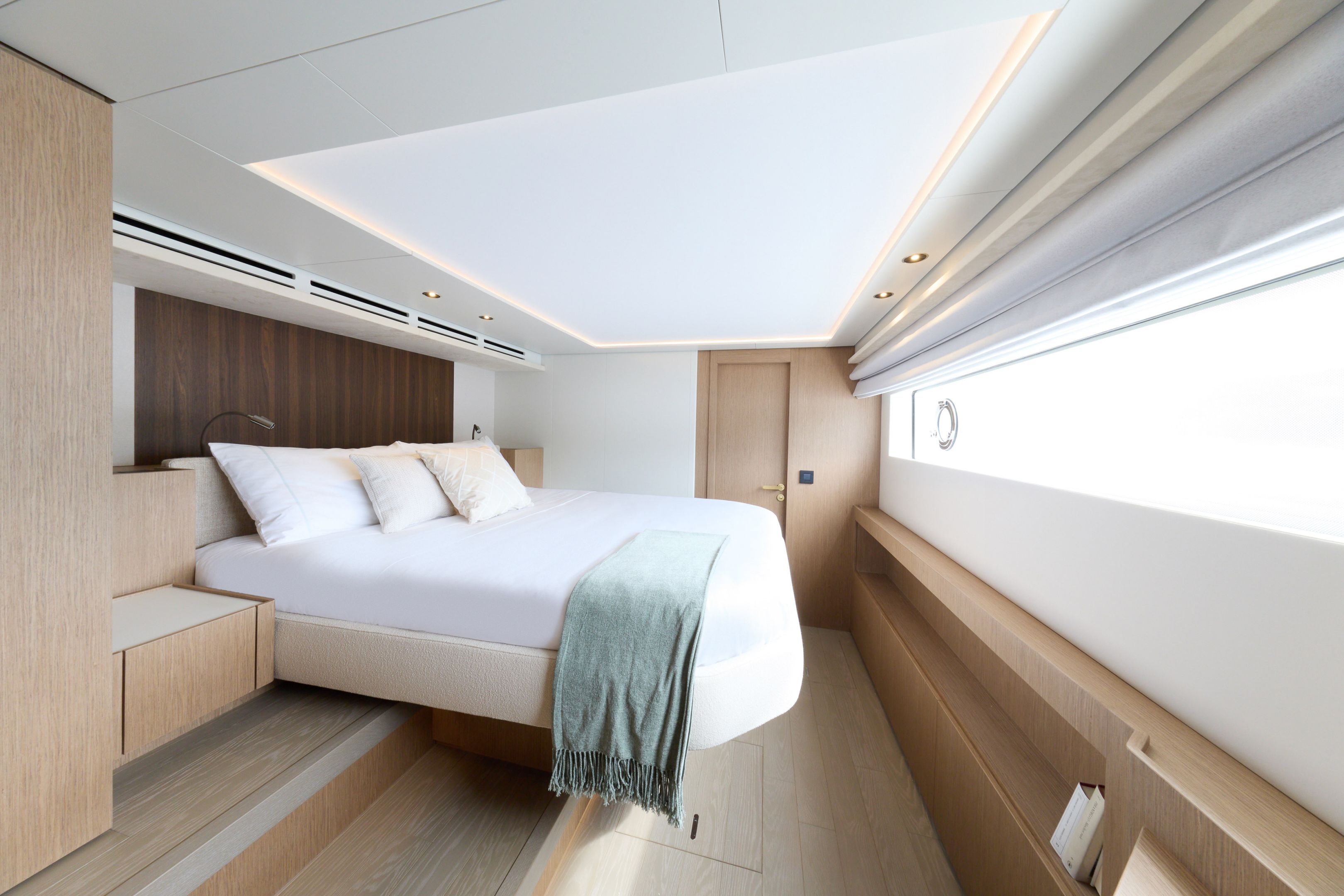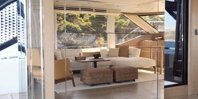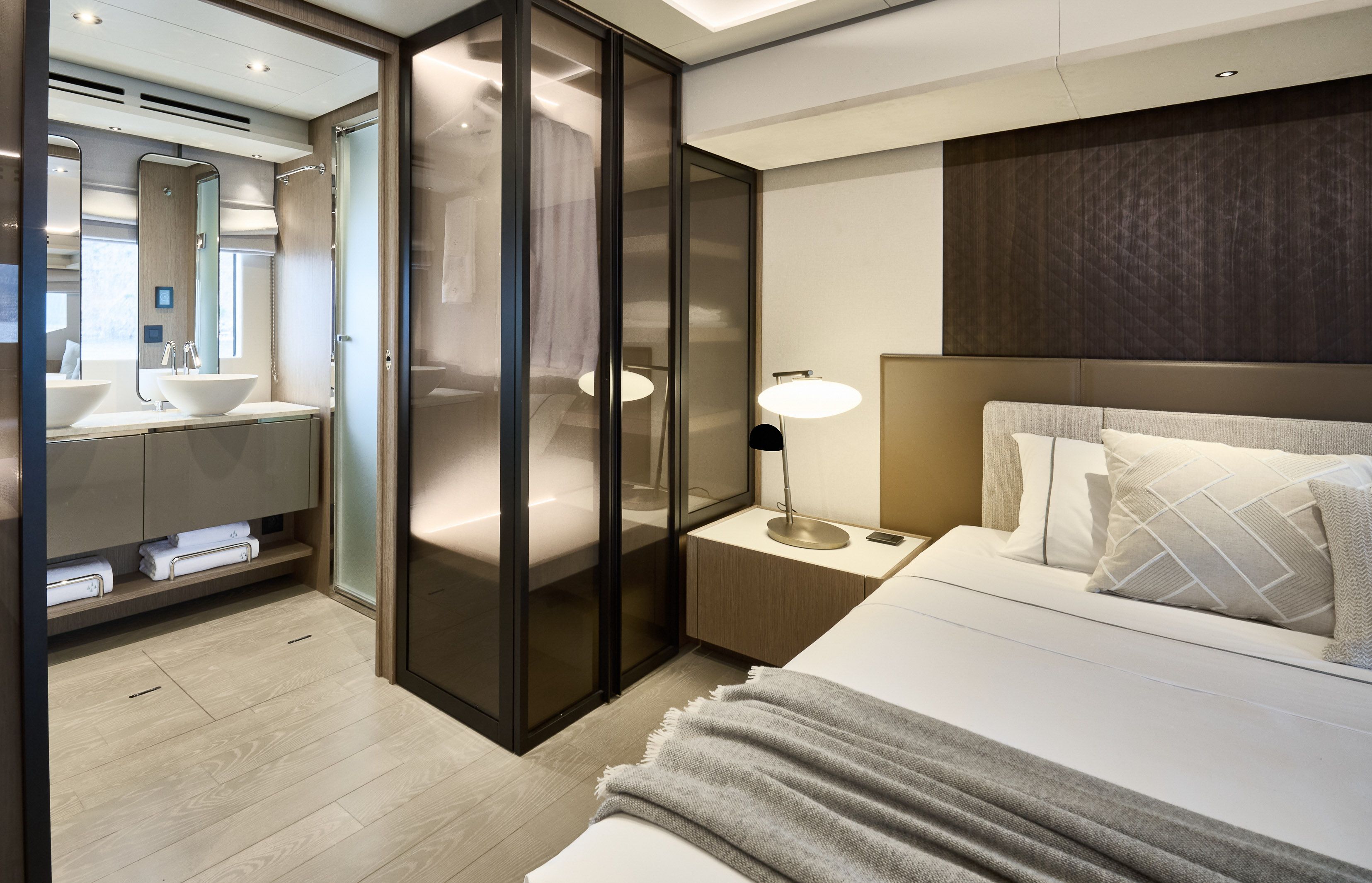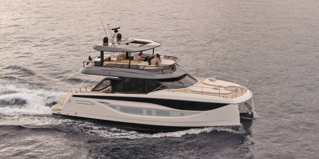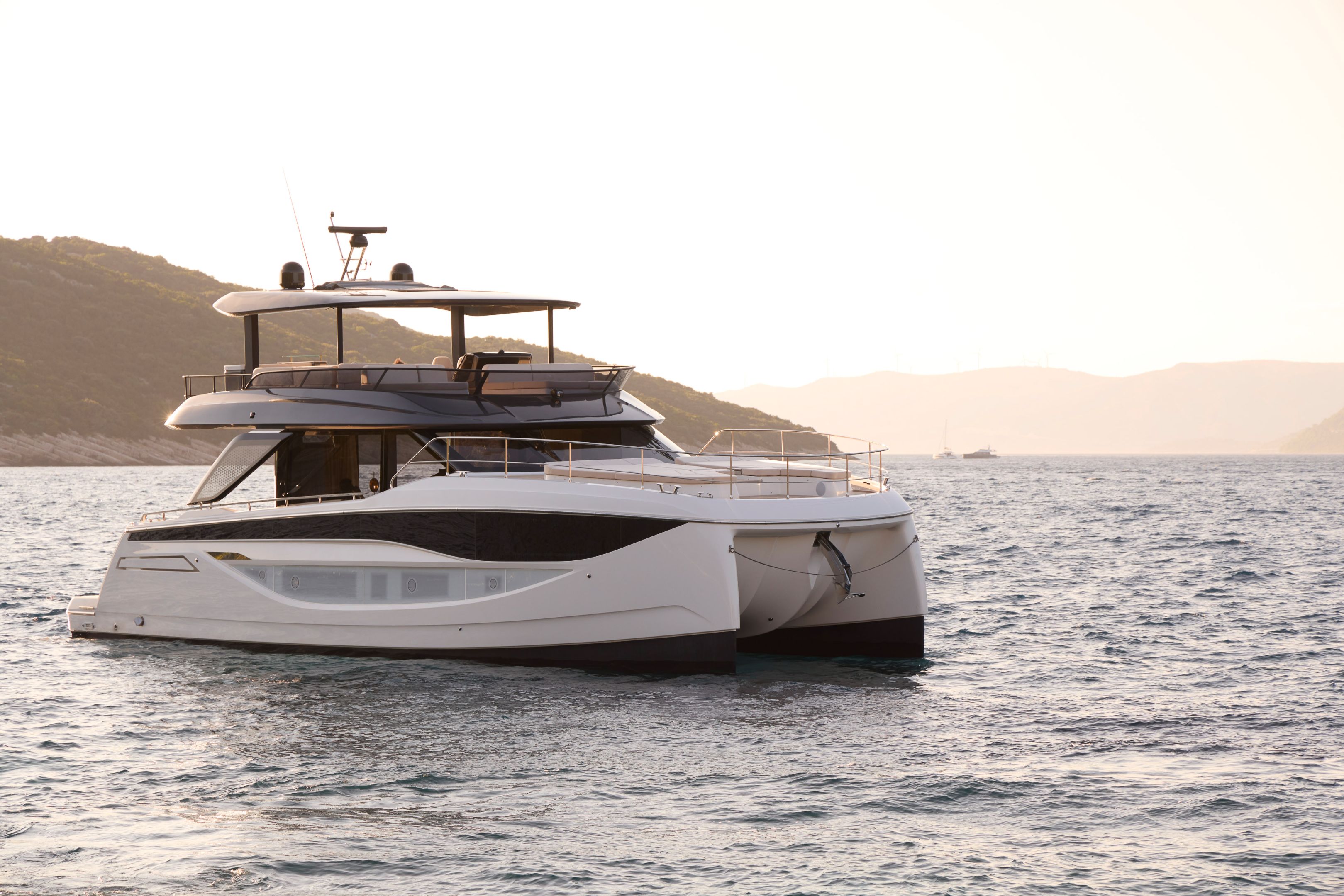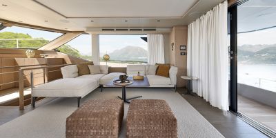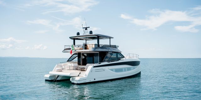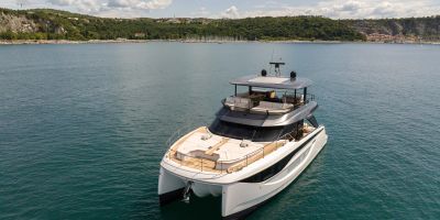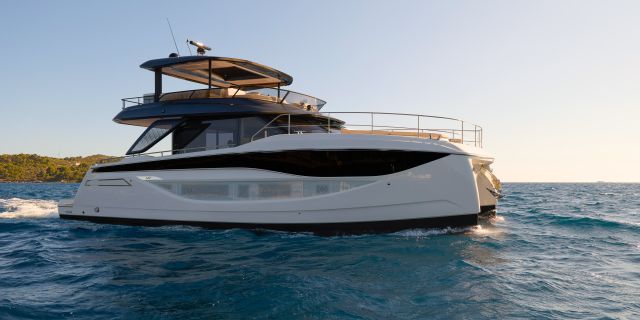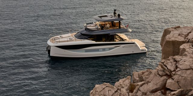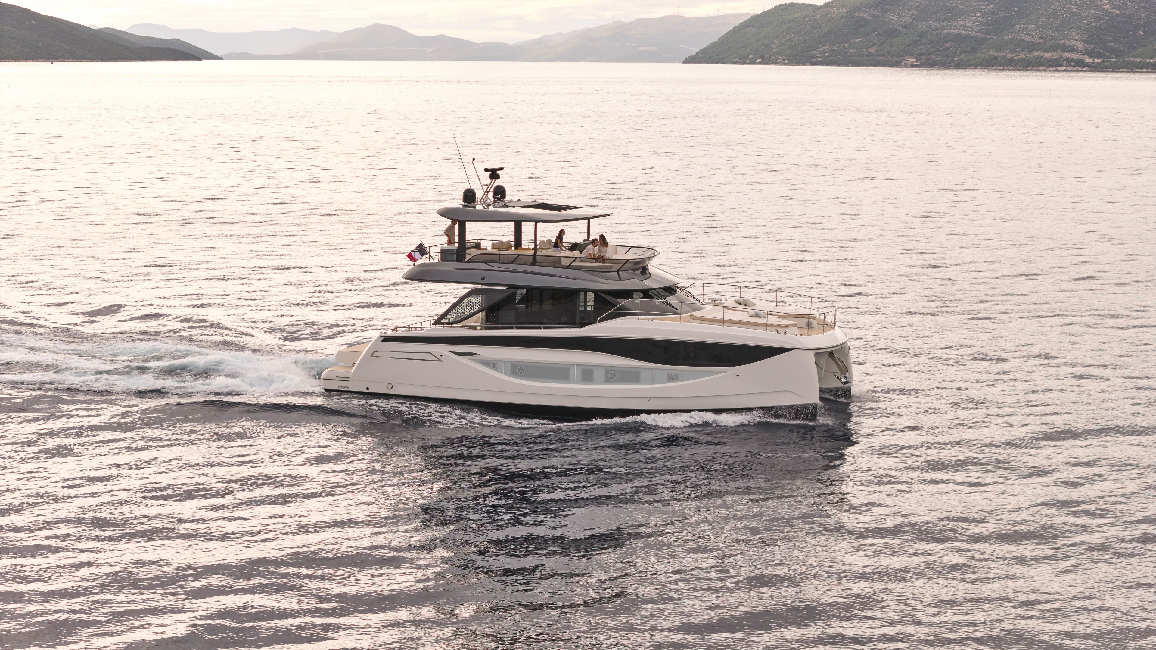 With the M7, Prestige takes the volume and stability of a multihull and finishes it like a luxury motor yacht. The wide beam runs nearly the full length of the boat, so every space feels bigger than you expect—from the salon with panoramic windows to the full-beam owner’s suite. Multiple outdoor zones let your crew spread out: shaded cockpit, forward lounge, and an expansive flybridge designed for long, relaxed days underway. Twin hulls deliver a soft, composed ride and excellent fuel economy at cruising speeds, extending your range without sacrificing comfort.