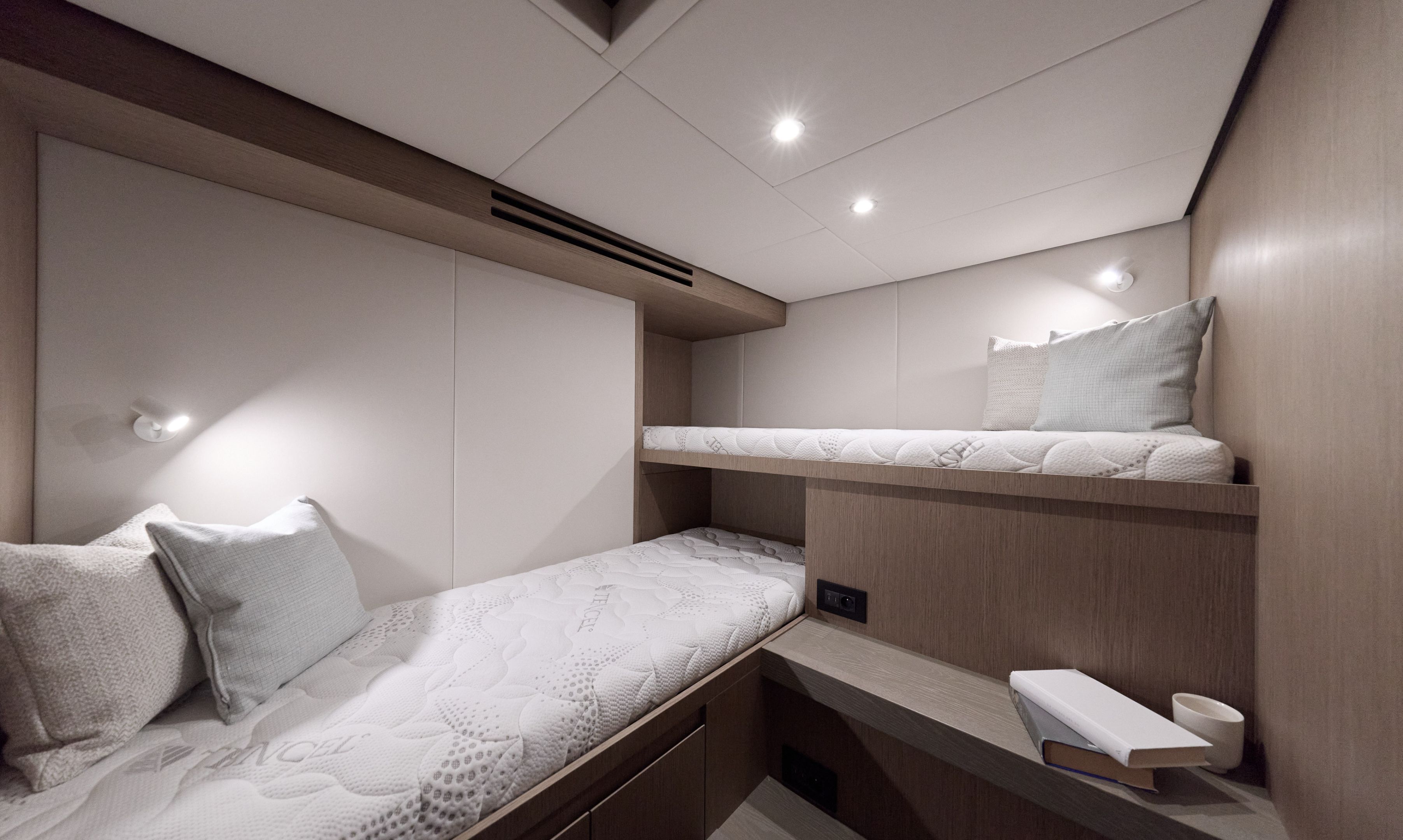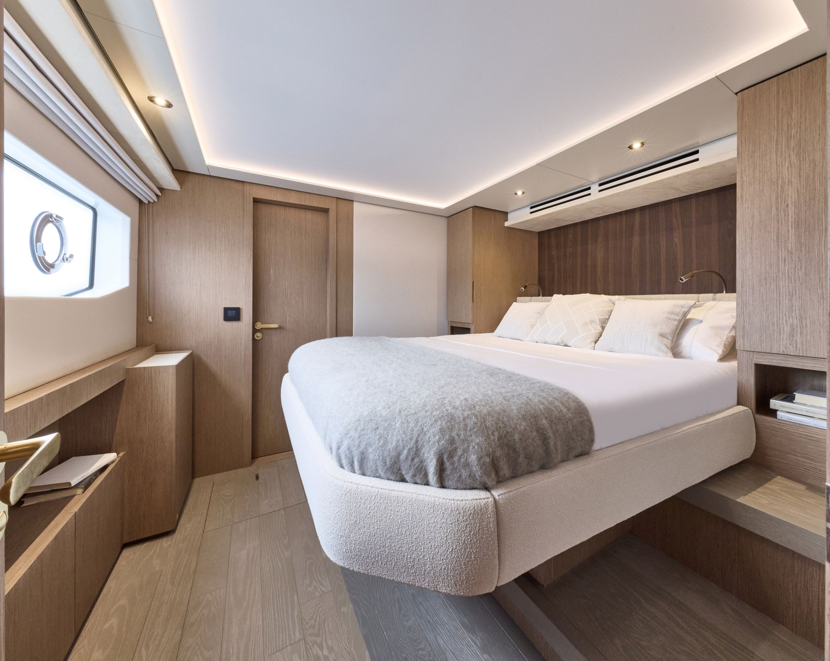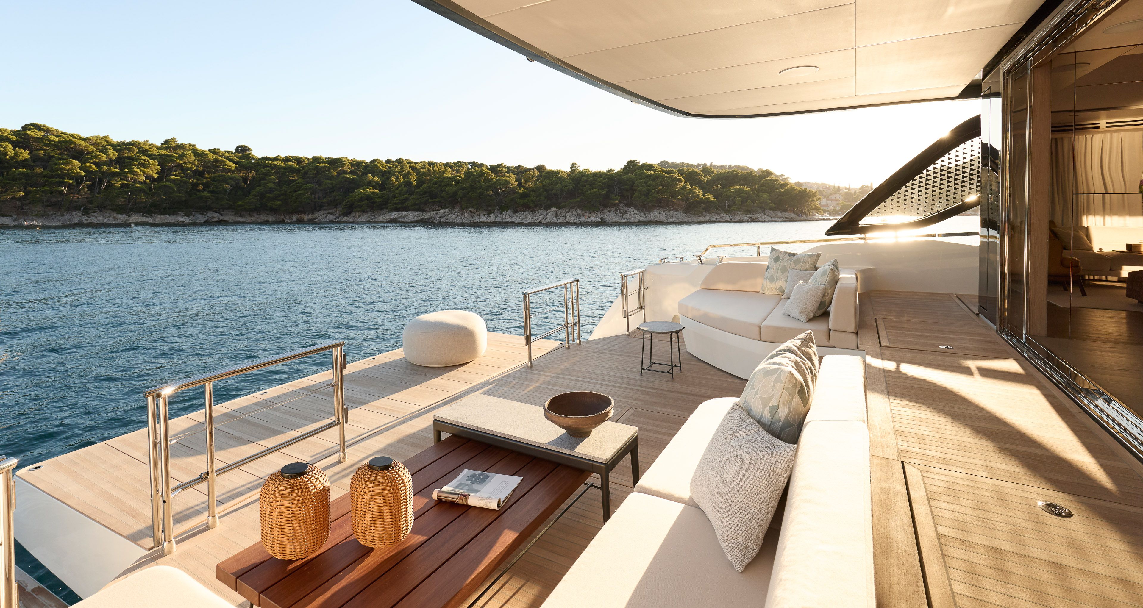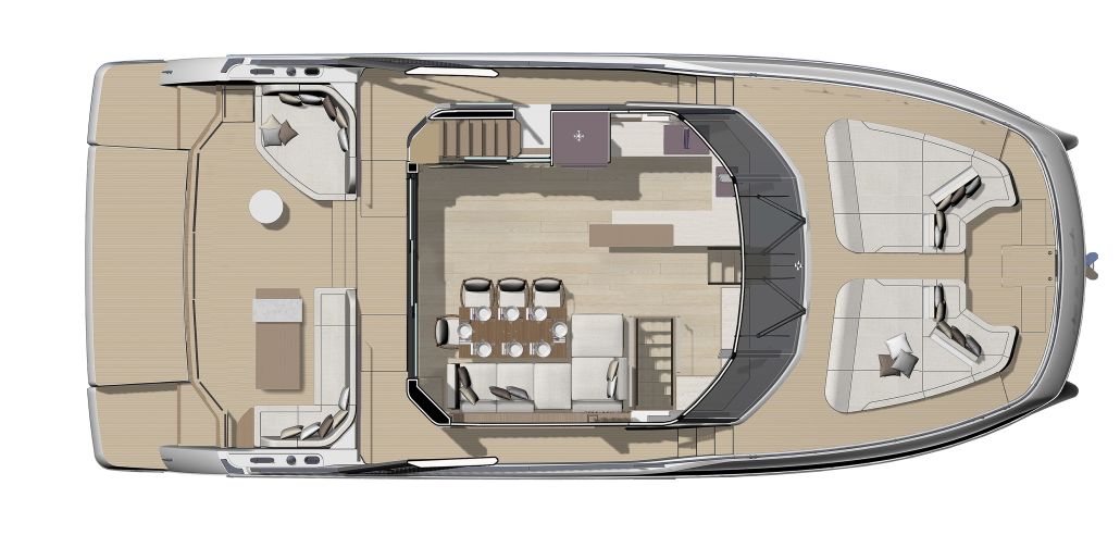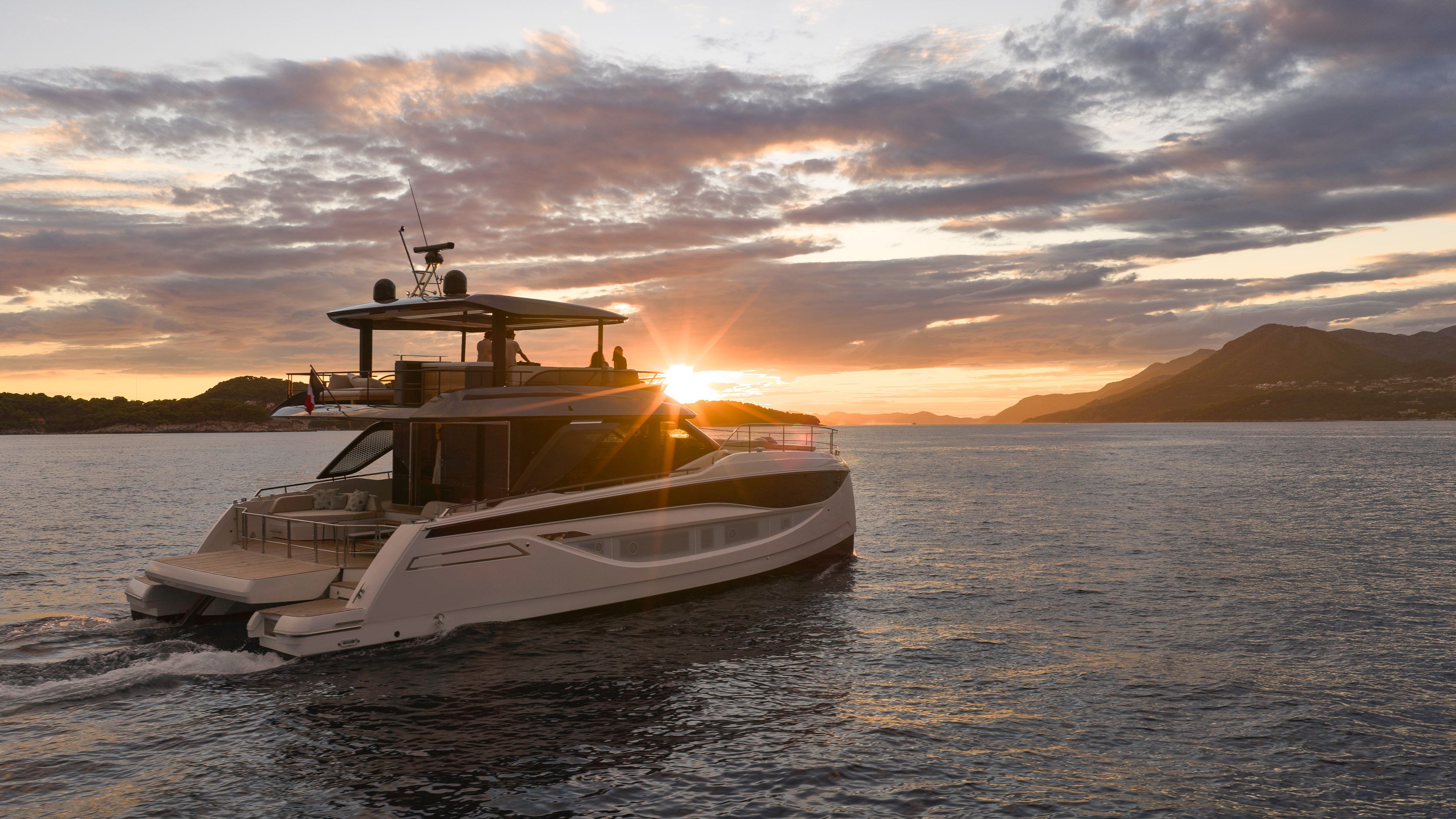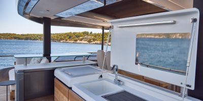With the M7, Prestige takes the volume and stability of a multihull and finishes it like a luxury motor yacht. The wide beam runs nearly the full length of the boat, so every space feels bigger than you expect—from the salon with panoramic windows to the full-beam owner’s suite. Multiple outdoor zones let your crew spread out: shaded cockpit, forward lounge, and an expansive flybridge designed for long, relaxed days underway. Twin hulls deliver a soft, composed ride and excellent fuel economy at cruising speeds, extending your range without sacrificing comfort.