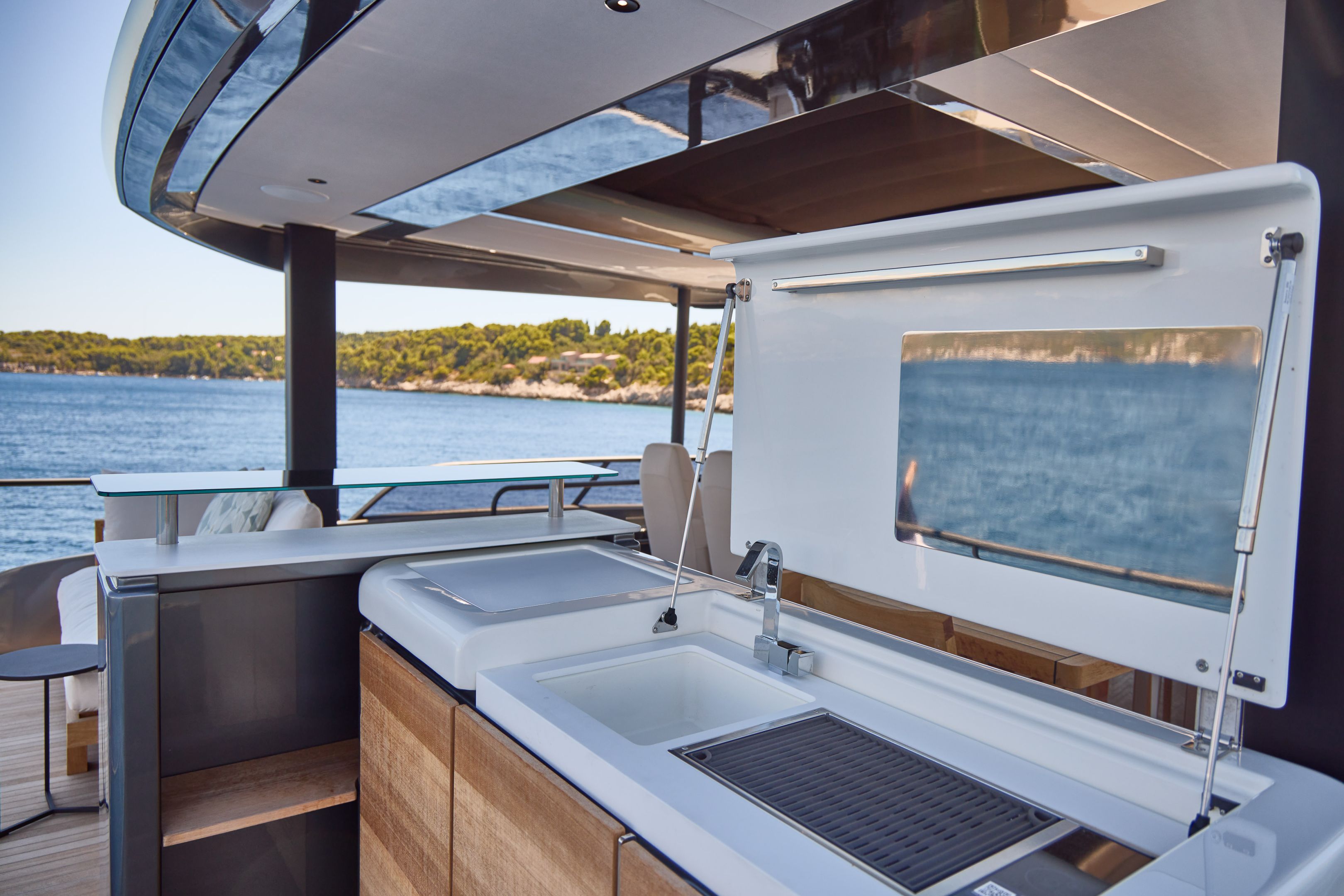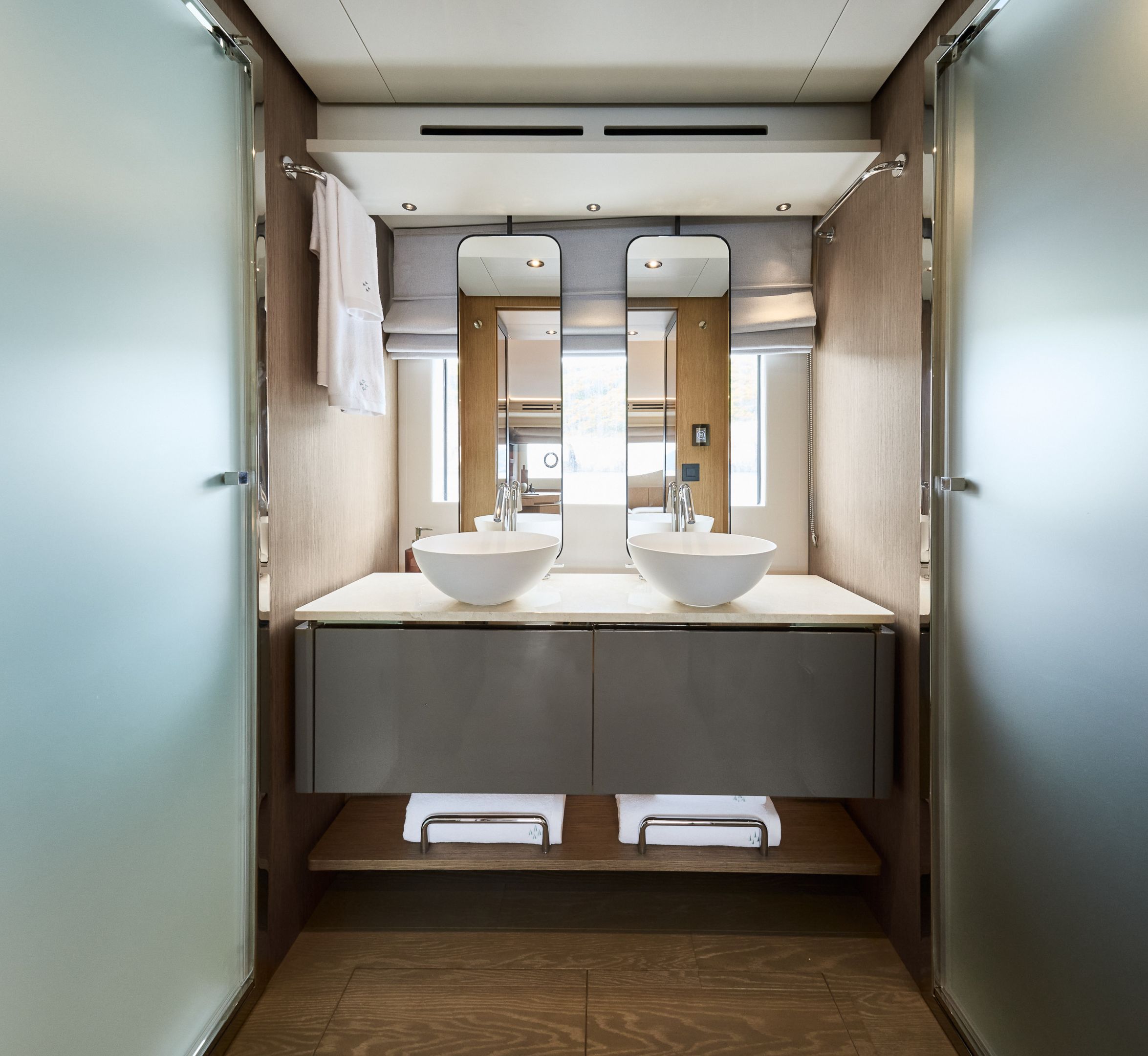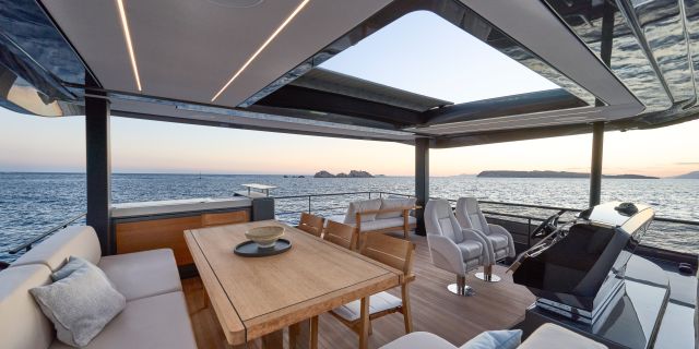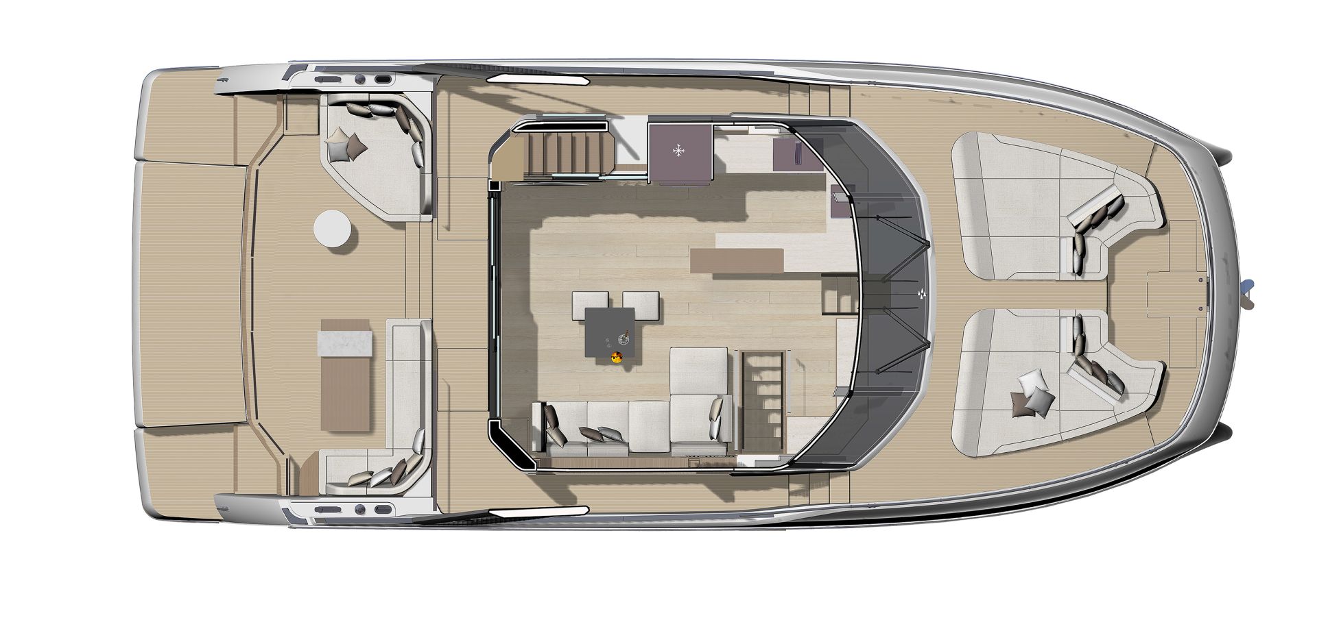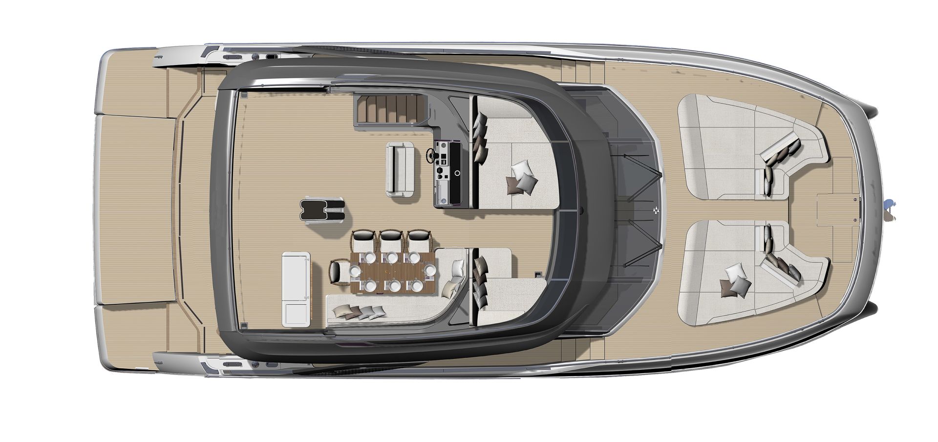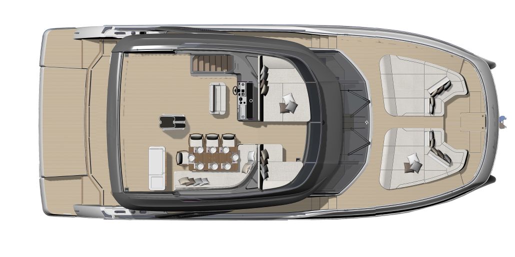With the M7, Prestige takes the volume and stability of a multihull and finishes it like a luxury motor yacht. The wide beam runs nearly the full length of the boat, so every space feels bigger than you expect—from the salon with panoramic windows to the full-beam owner’s suite. Multiple outdoor zones let your crew spread out: shaded cockpit, forward lounge, and an expansive flybridge designed for long, relaxed days underway. Twin hulls deliver a soft, composed ride and excellent fuel economy at cruising speeds, extending your range without sacrificing comfort.