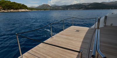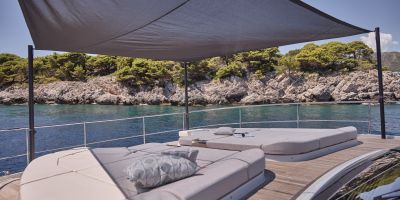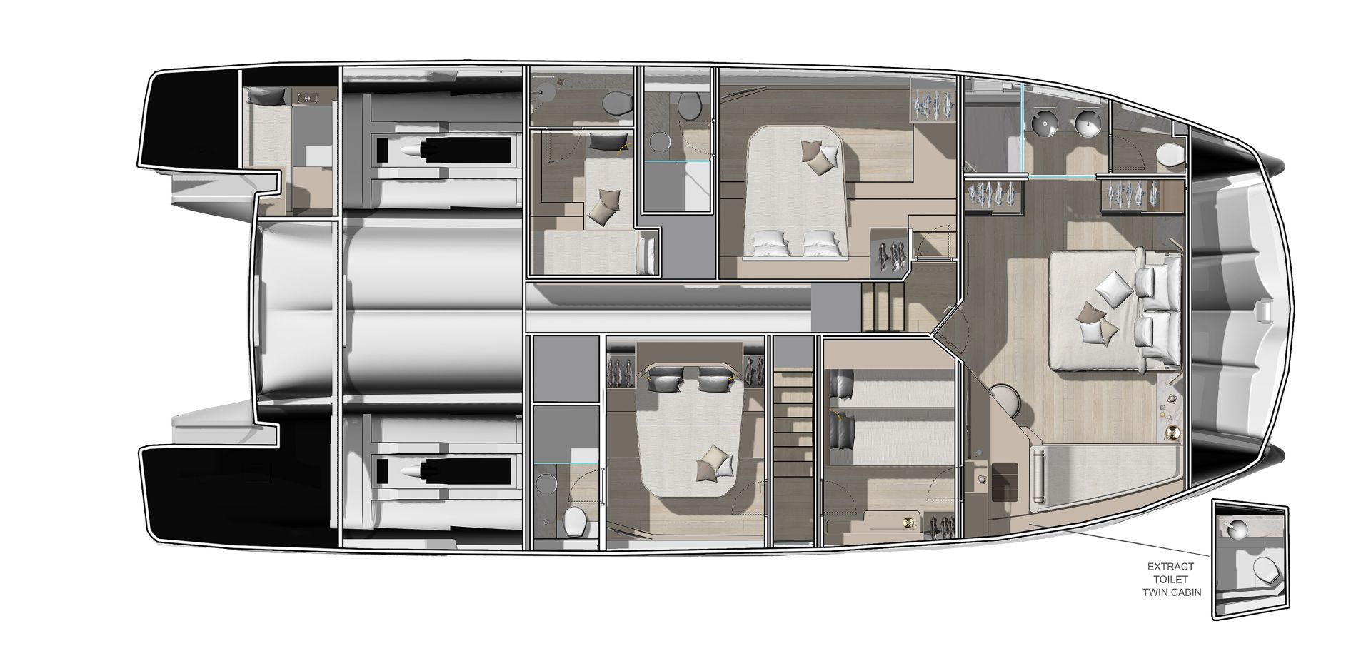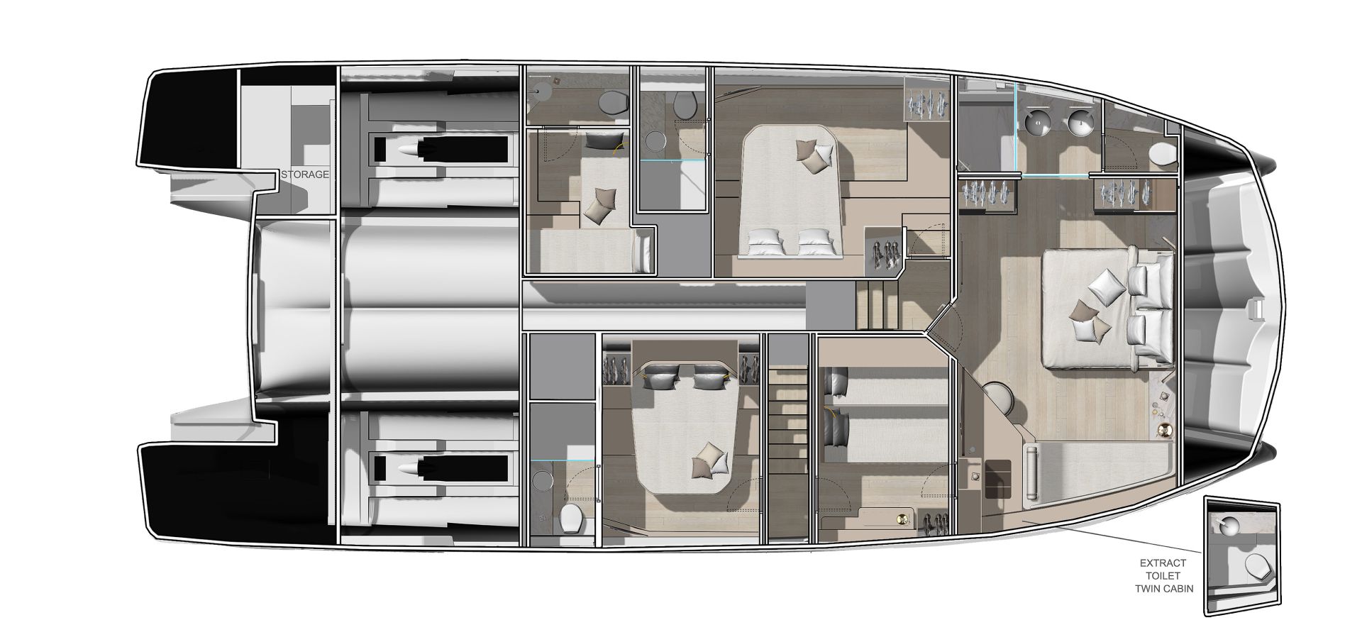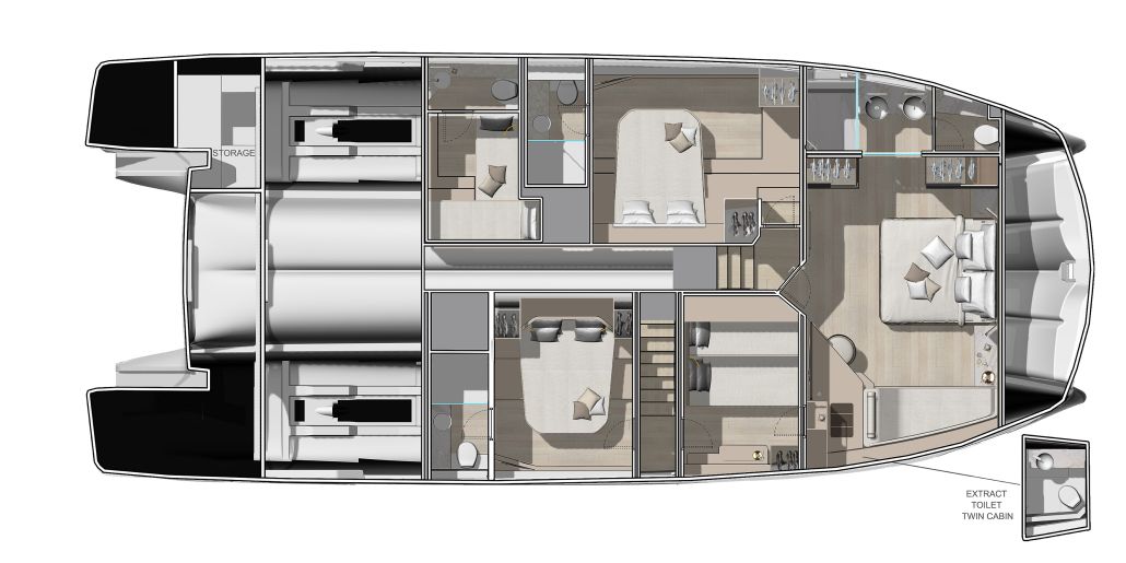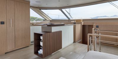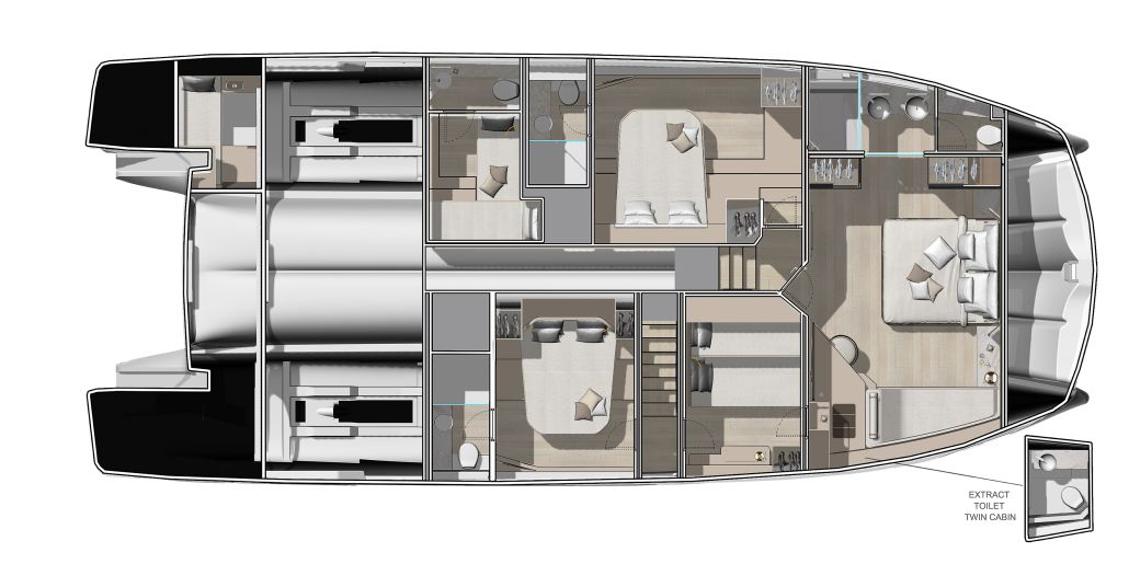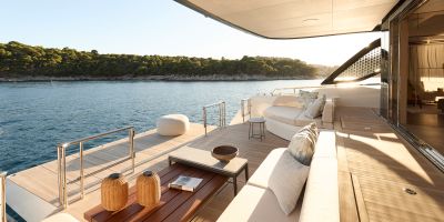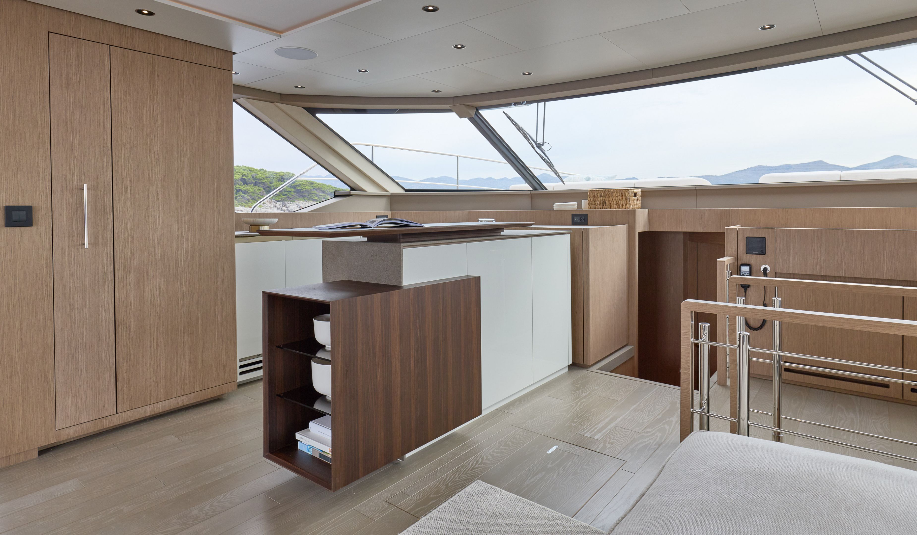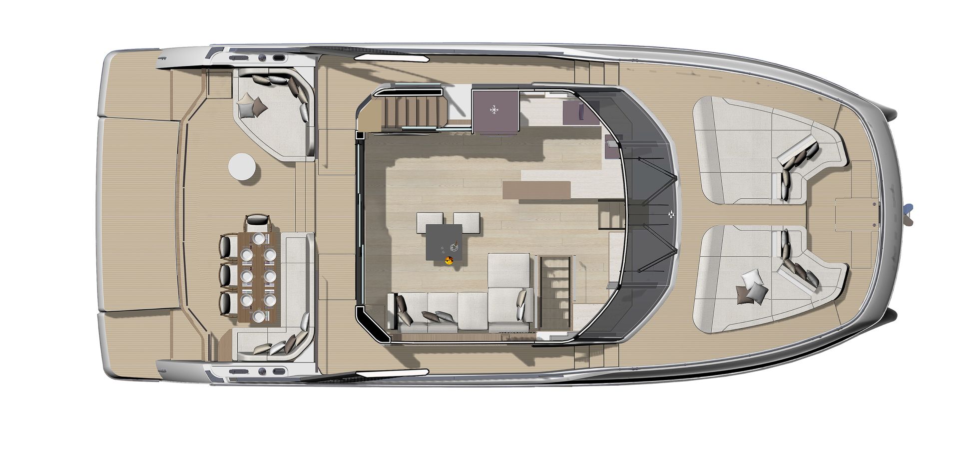 With the M7, Prestige takes the volume and stability of a multihull and finishes it like a luxury motor yacht. The wide beam runs nearly the full length of the boat, so every space feels bigger than you expect—from the salon with panoramic windows to the full-beam owner’s suite. Multiple outdoor zones let your crew spread out: shaded cockpit, forward lounge, and an expansive flybridge designed for long, relaxed days underway. Twin hulls deliver a soft, composed ride and excellent fuel economy at cruising speeds, extending your range without sacrificing comfort.