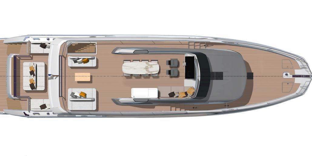 While many designs have recently emphasized complex built in foredeck seating, Prestige chose a different route - clean, simple, and less obstructive of the captain's view. This works well because the main entertaining and lounging areas on the X70 are the infinity cockpit and flybridge - which lead their class in size.