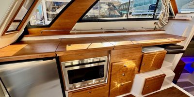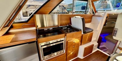 • Full Galley Setup – Dual-burner electric stove, convection oven/microwave, fridge, and more.